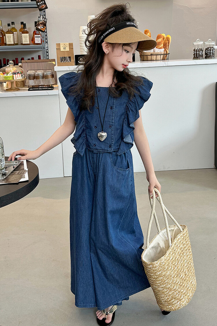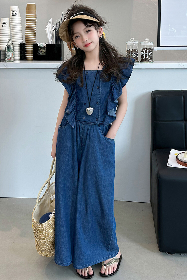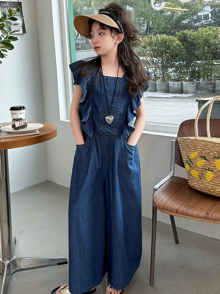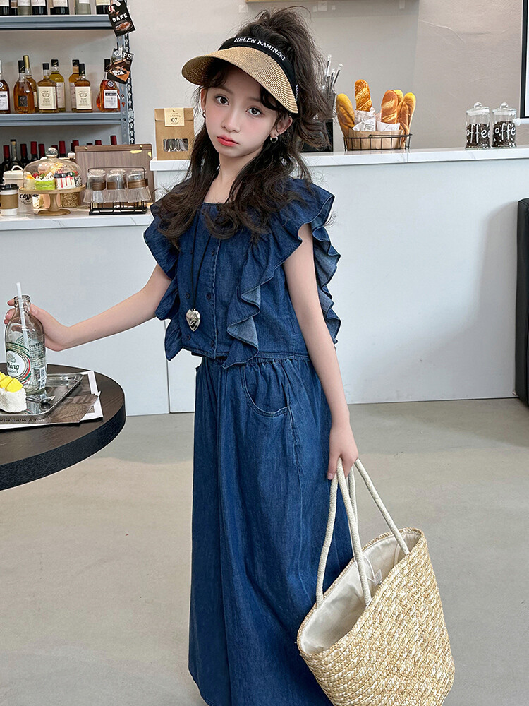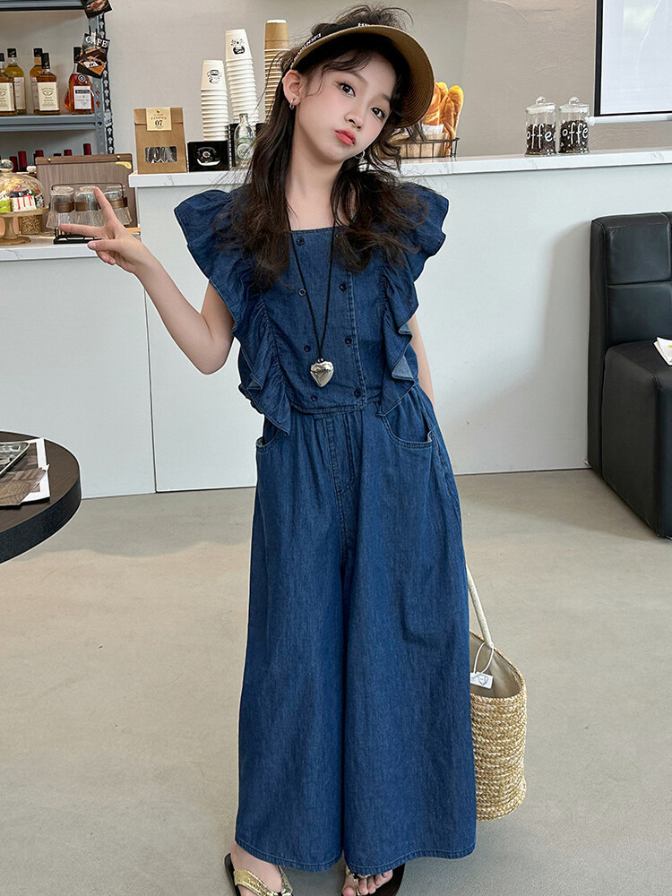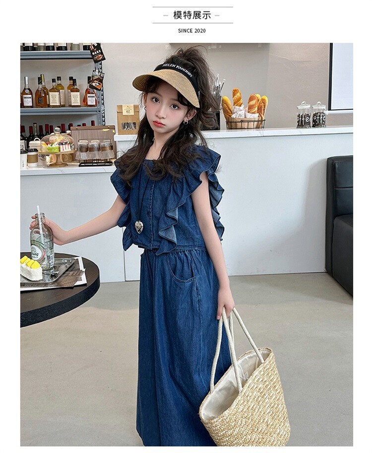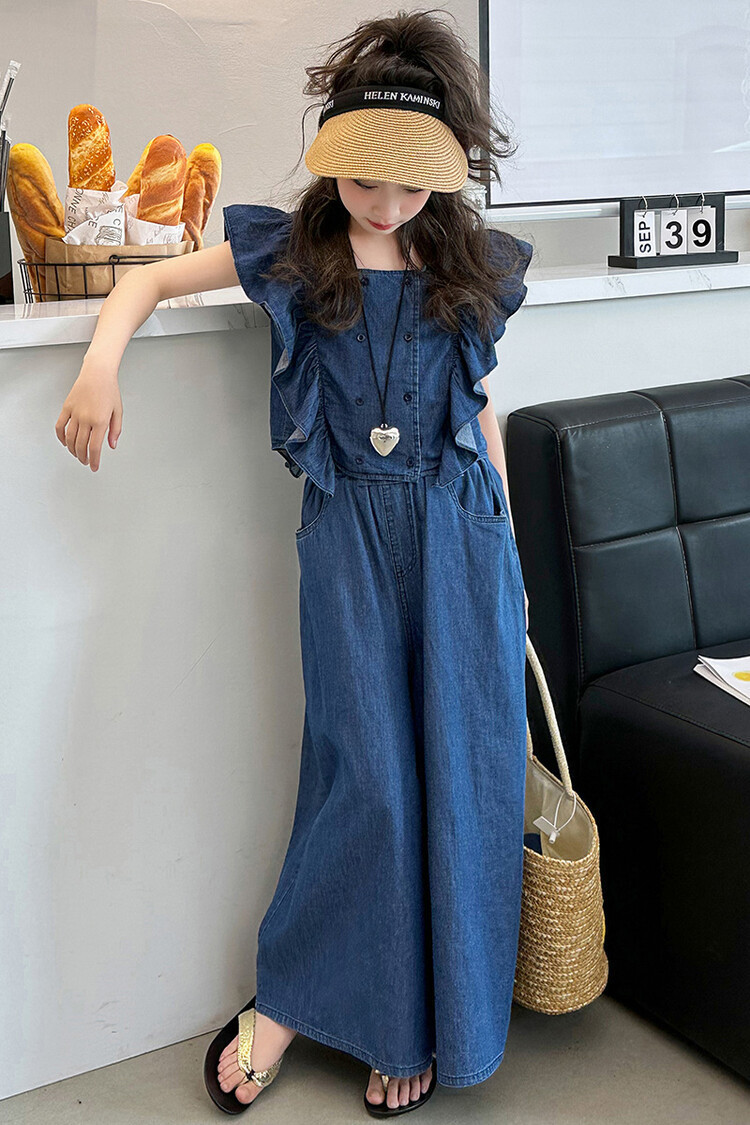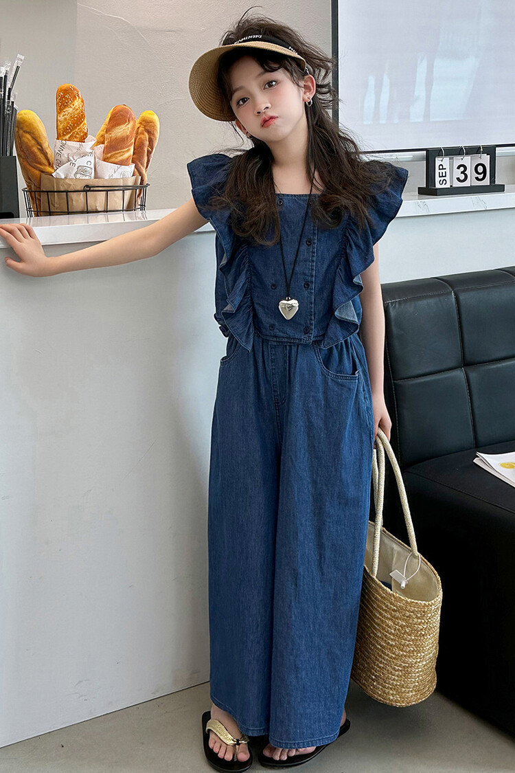 소녀 플라잉 슬리브 세트 2024 새로운 여름 원피스 큰 소년 소녀 얇은 데님 넓은 다리 바지 여름 투피스 유행 세트스토어 가기