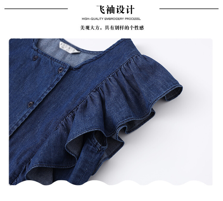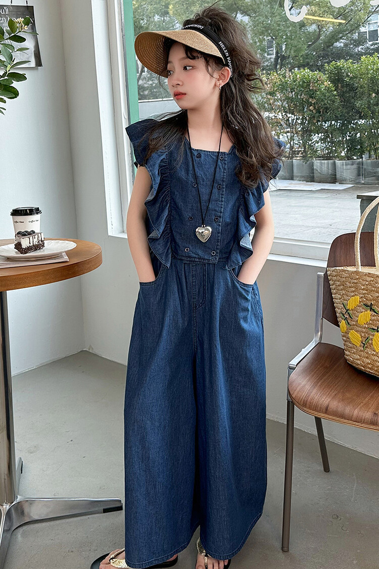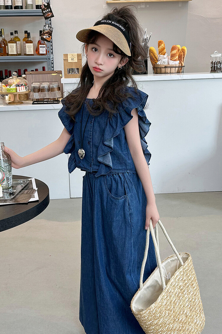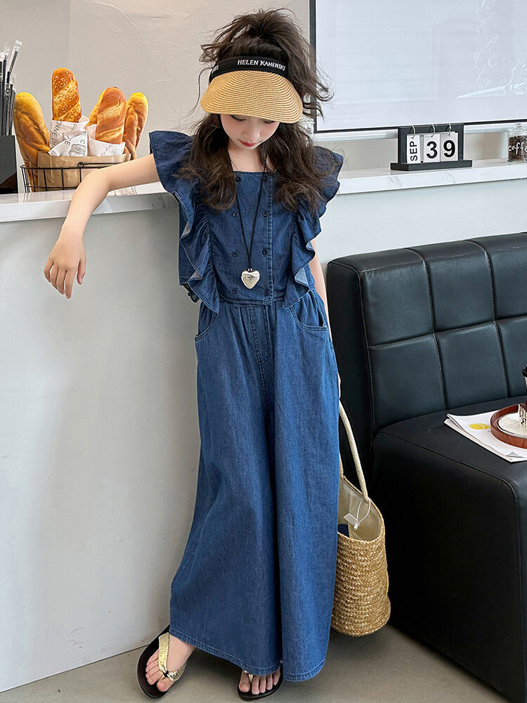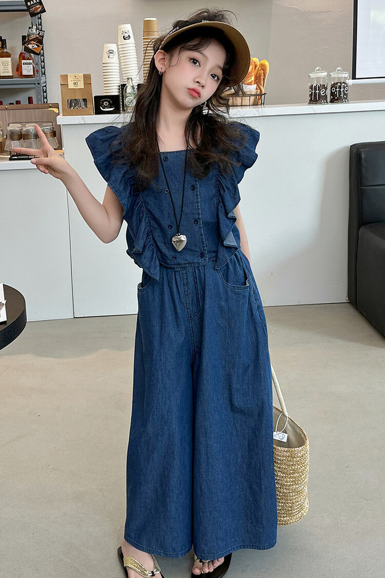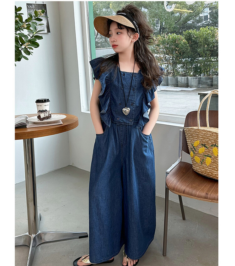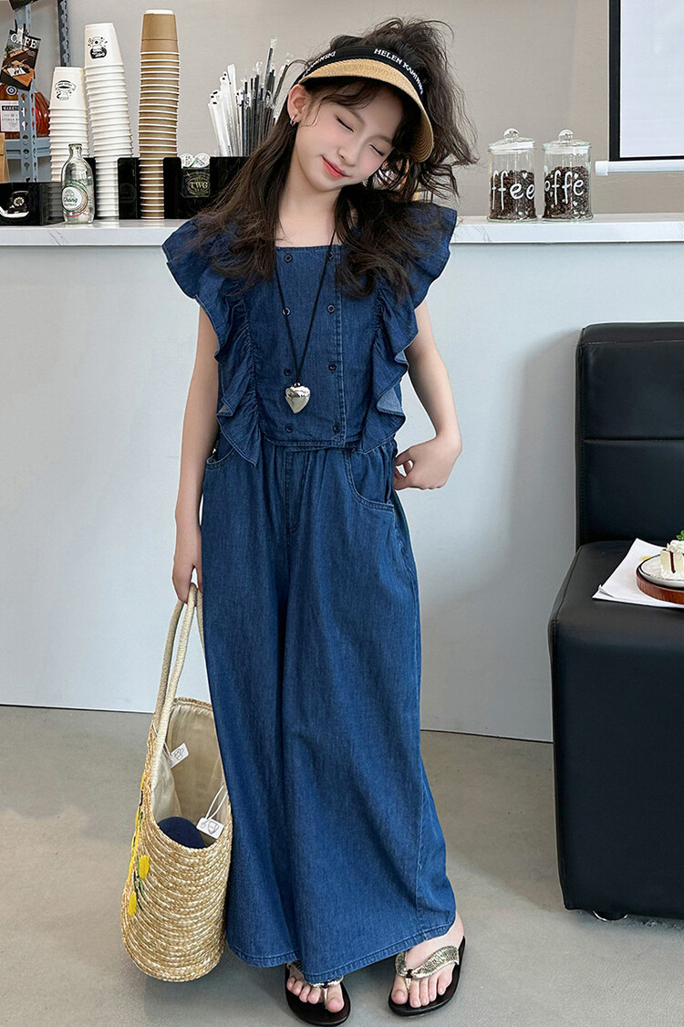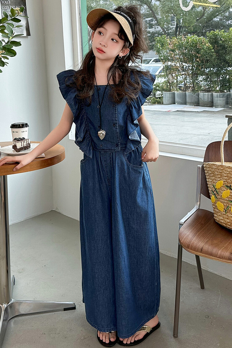소녀 플라잉 슬리브 세트 2024 새로운 여름 원피스 큰 소년 소녀 얇은 데님 넓은 다리 바지 여름 투피스 유행 세트스토어 가기