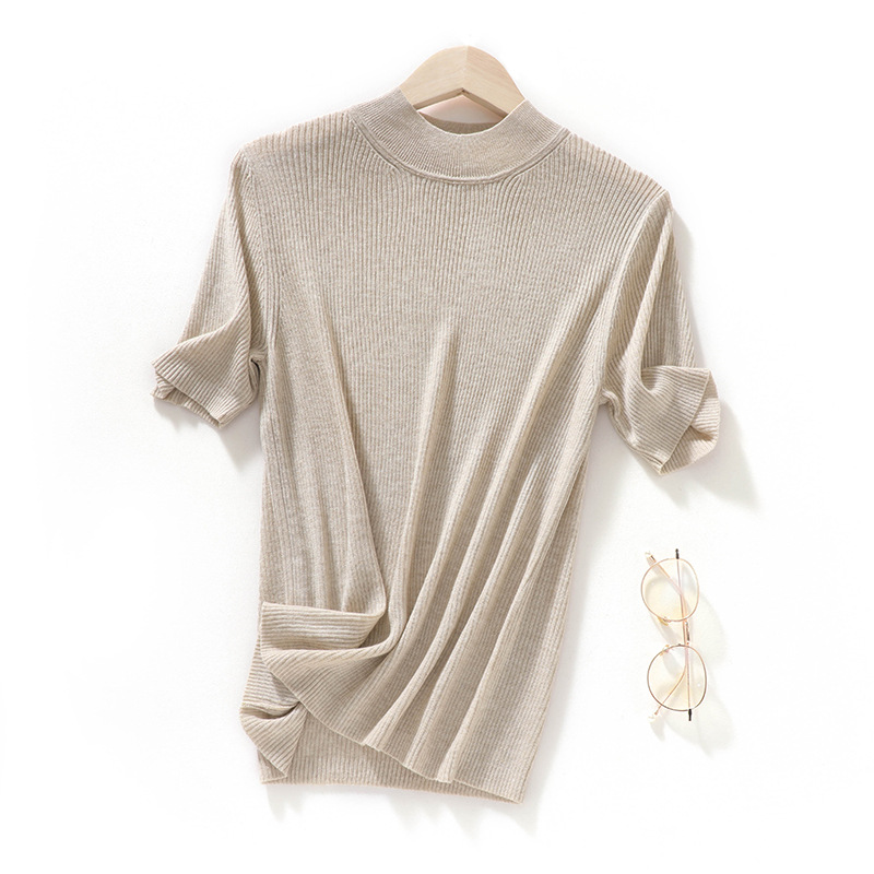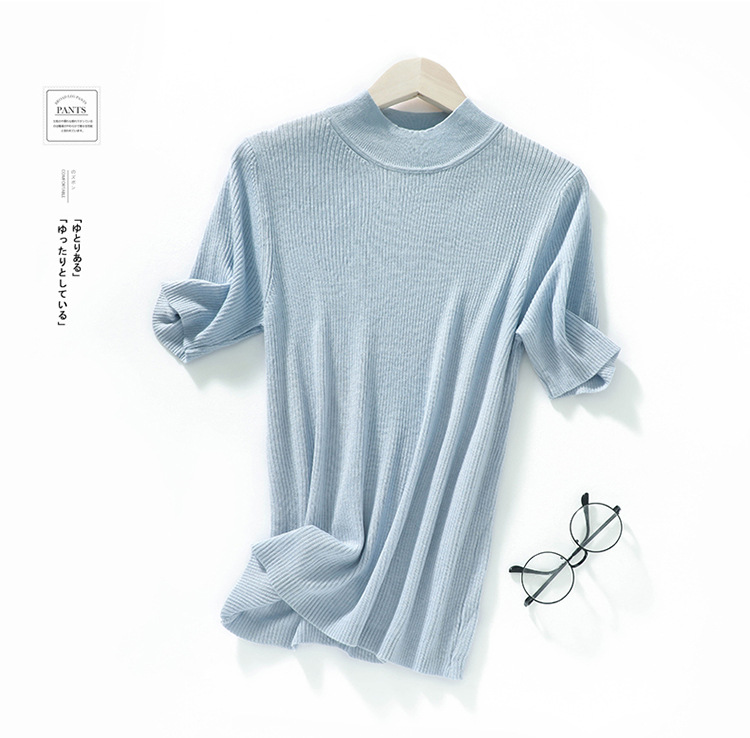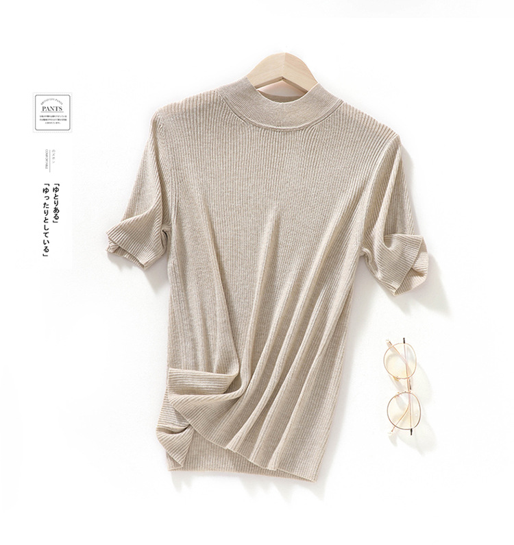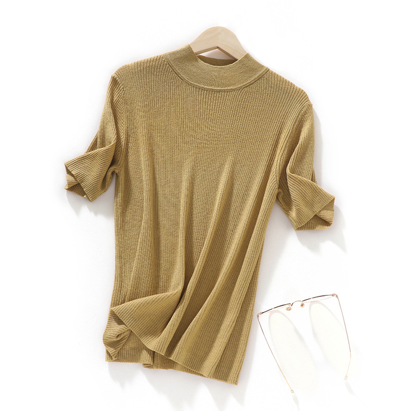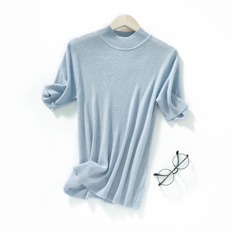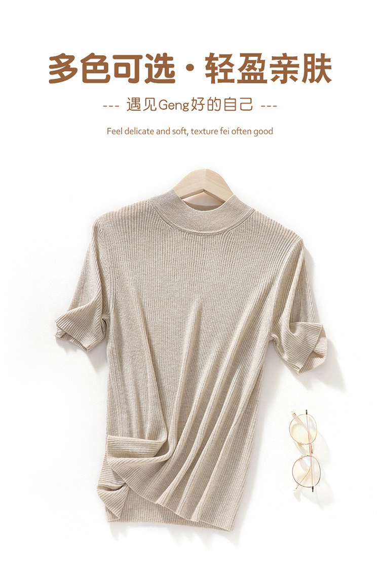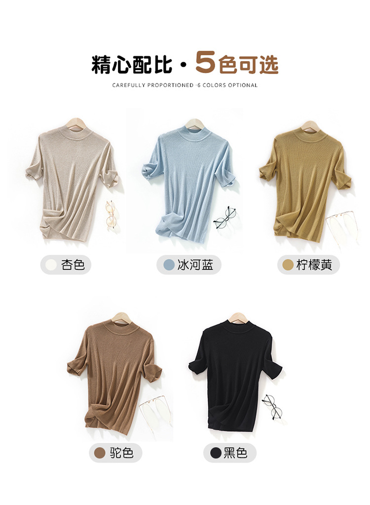 봄과 여름 우아한 통근 간단한 단색 얇은 통기성 슬림 바닥 울모 반 터틀넥 니트 반소매스토어 가기
