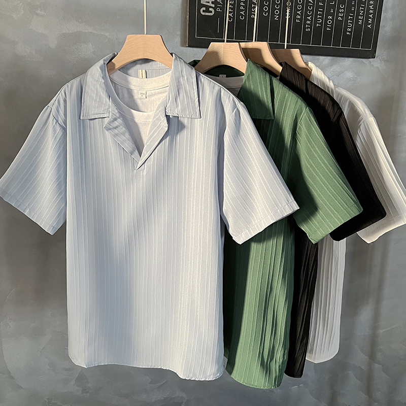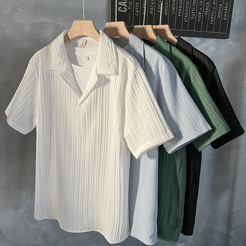 쿠바 칼라 풀오버 반팔 셔츠 남자의 간단한 2024 여름 인기 프릴 잘 생긴 반소매 드레이프 아이스 실크 셔츠스토어 가기