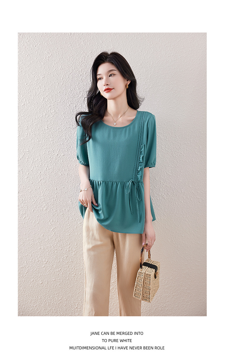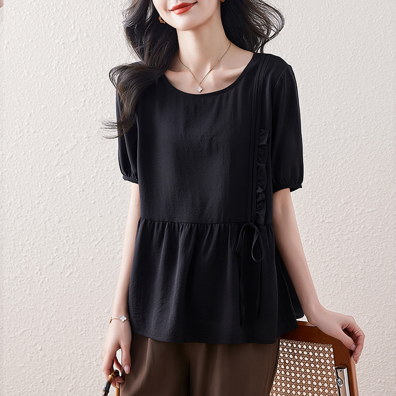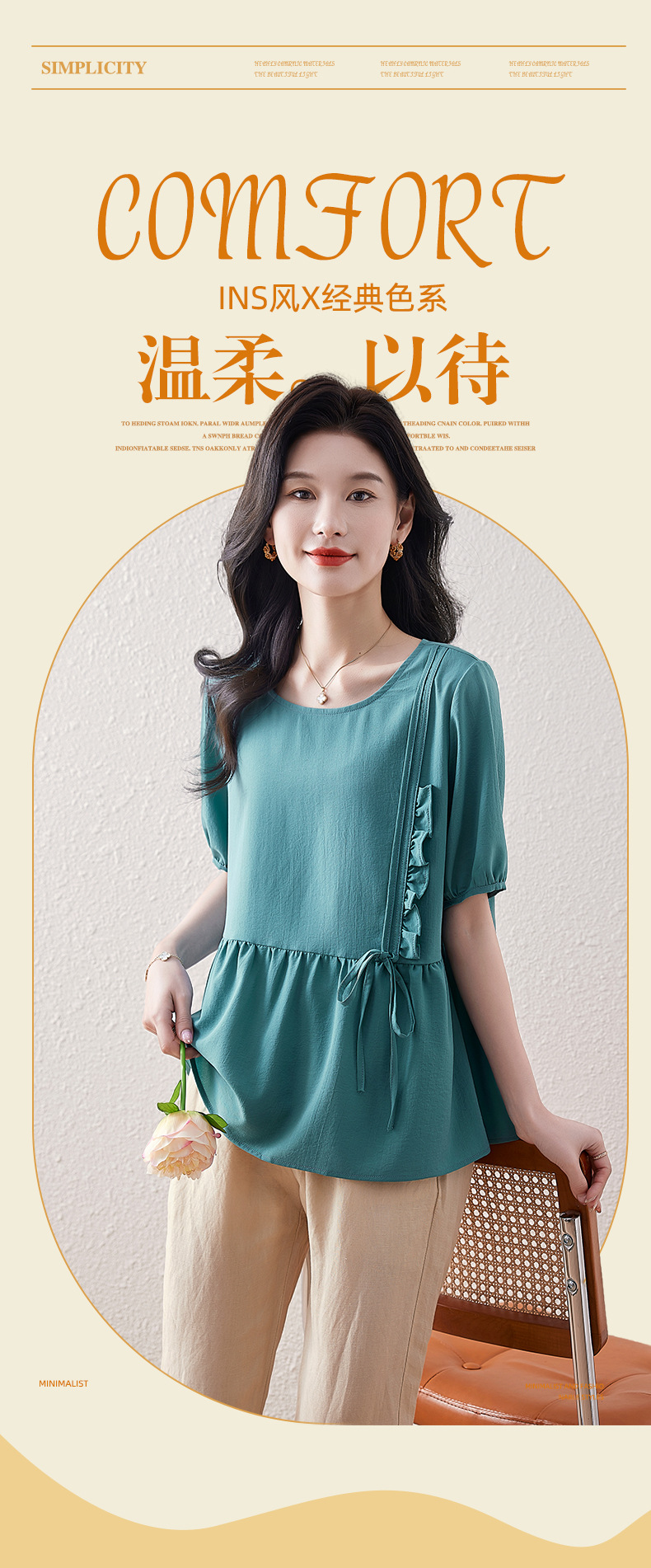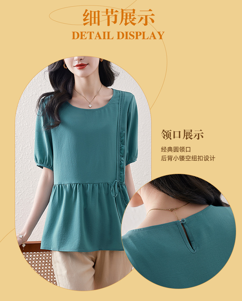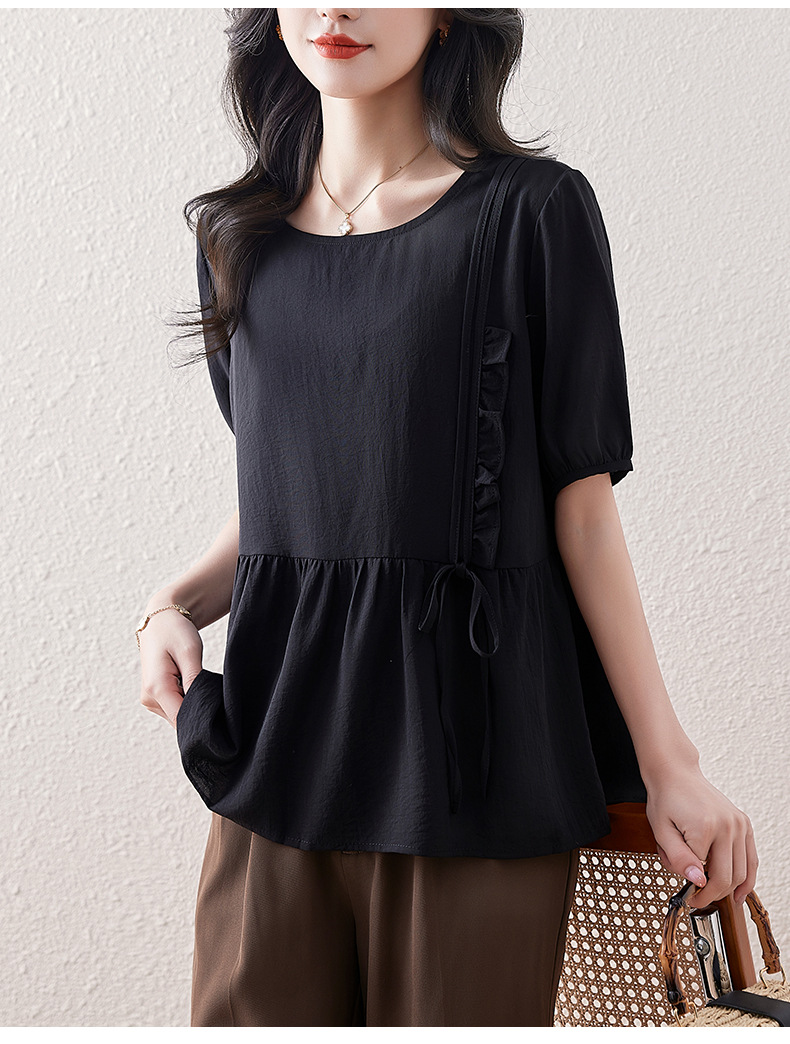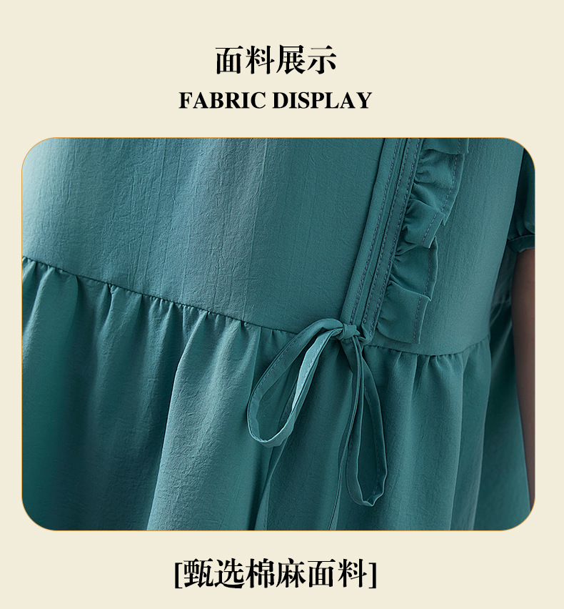 면 및 린넨 셔츠 여성의 짧은 소매 2024 여름 새로운 느슨한 플러스 사이즈 나무 귀 인형 셔츠 얇은 배 덮개 탑스토어 가기