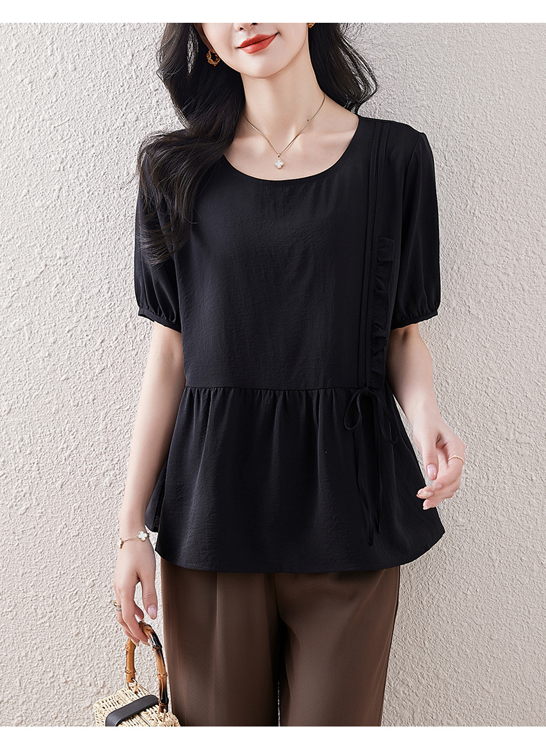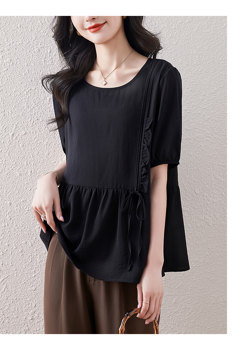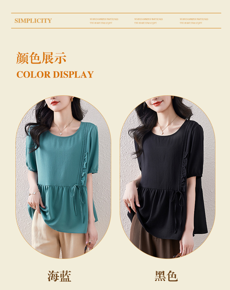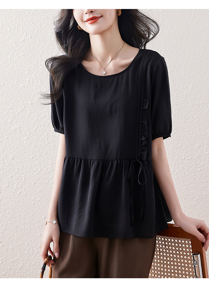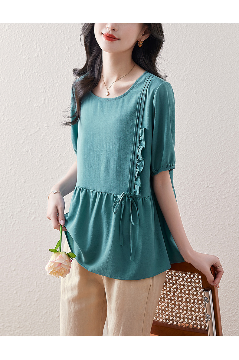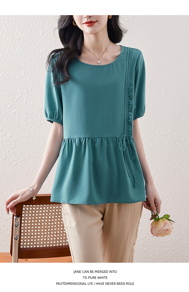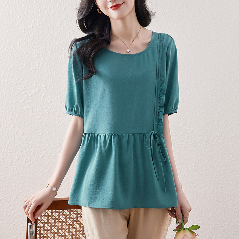 면 및 린넨 셔츠 여성의 짧은 소매 2024 여름 새로운 느슨한 플러스 사이즈 나무 귀 인형 셔츠 얇은 배 덮개 탑