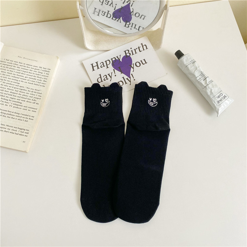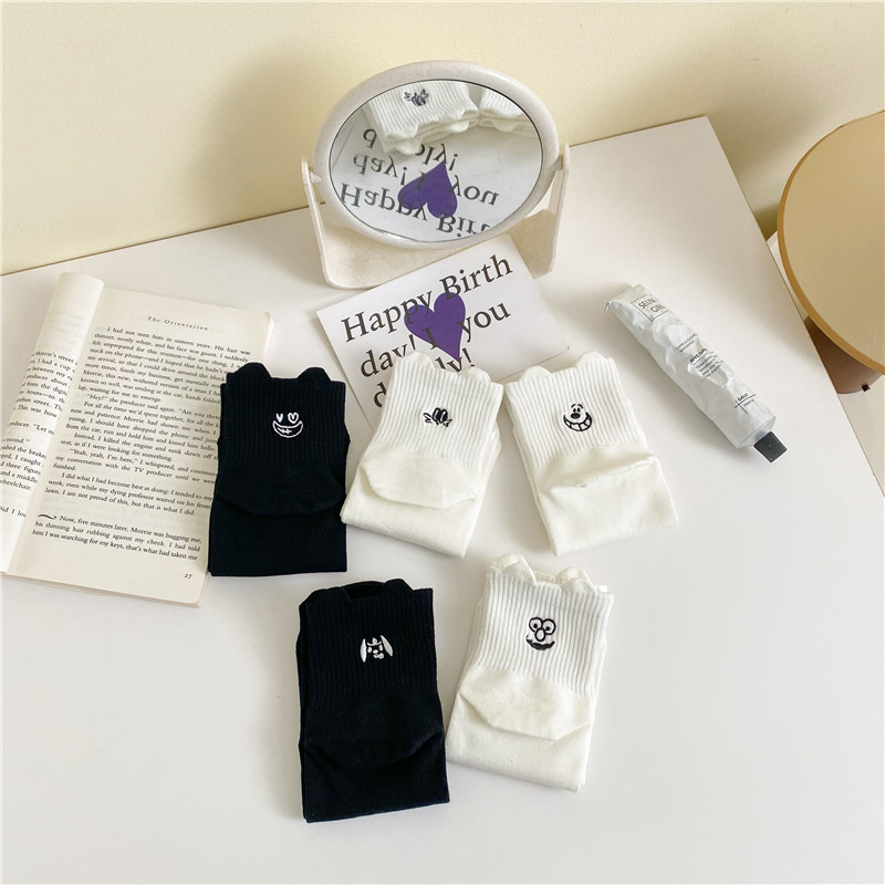 여성용 한국식 만화 귀여운 자수 동물 중간 종아리 양말, 트렌디 한 입체 귀 흑백 여성 양말 도매스토어 가기