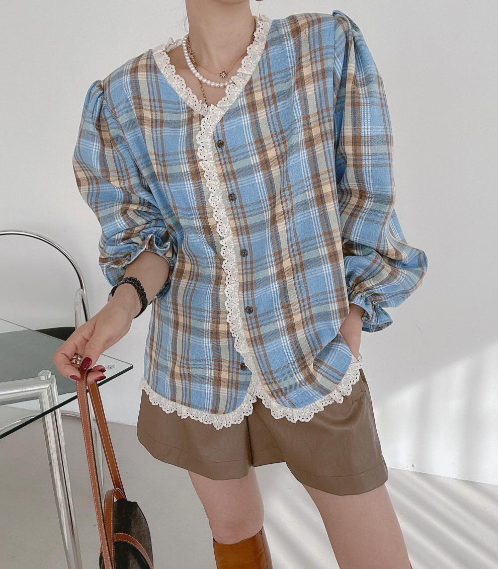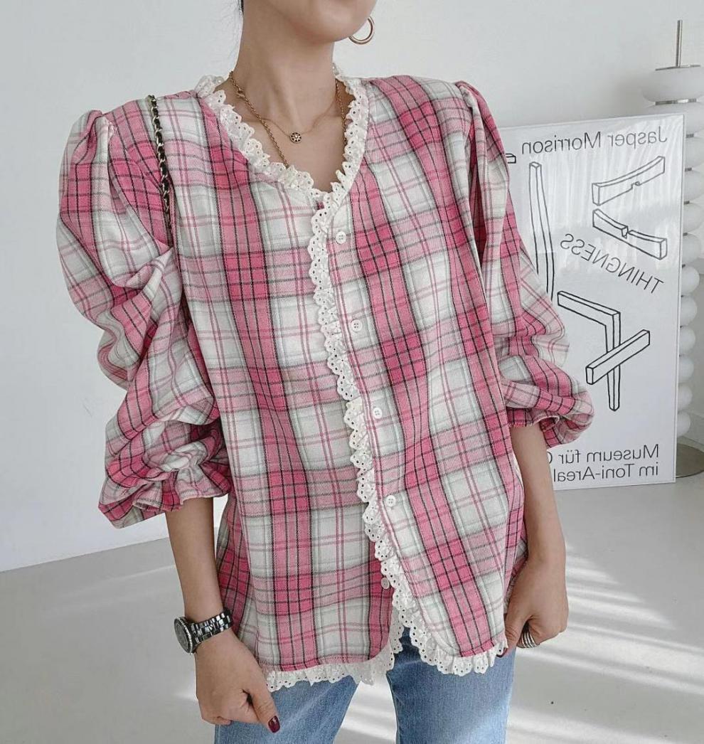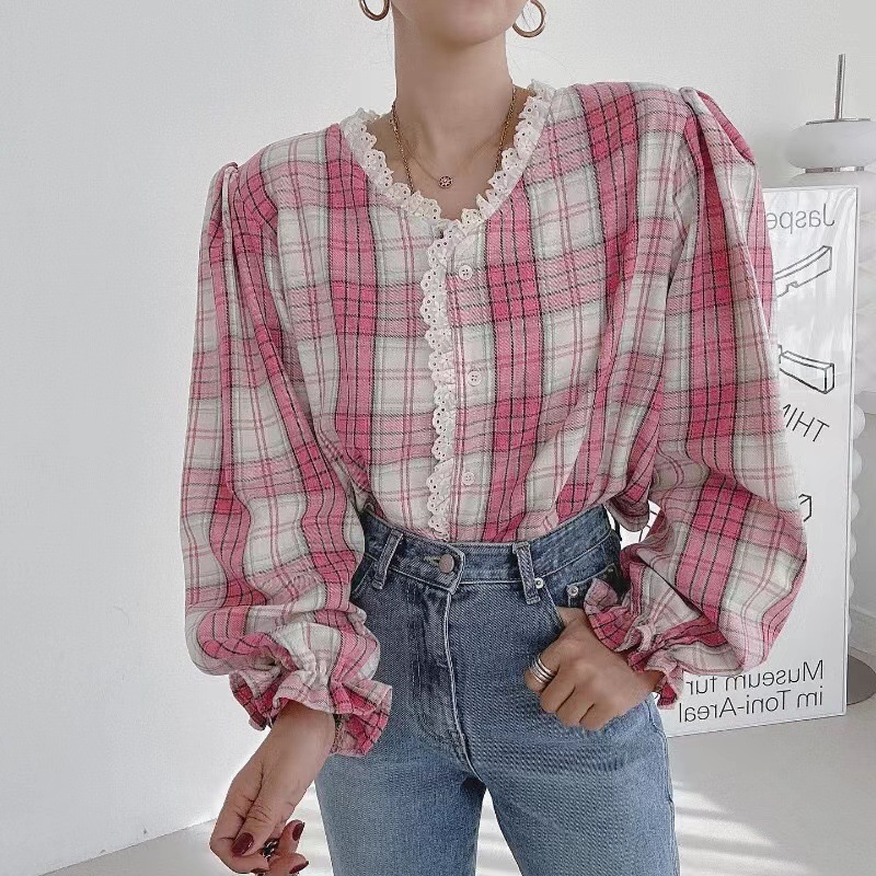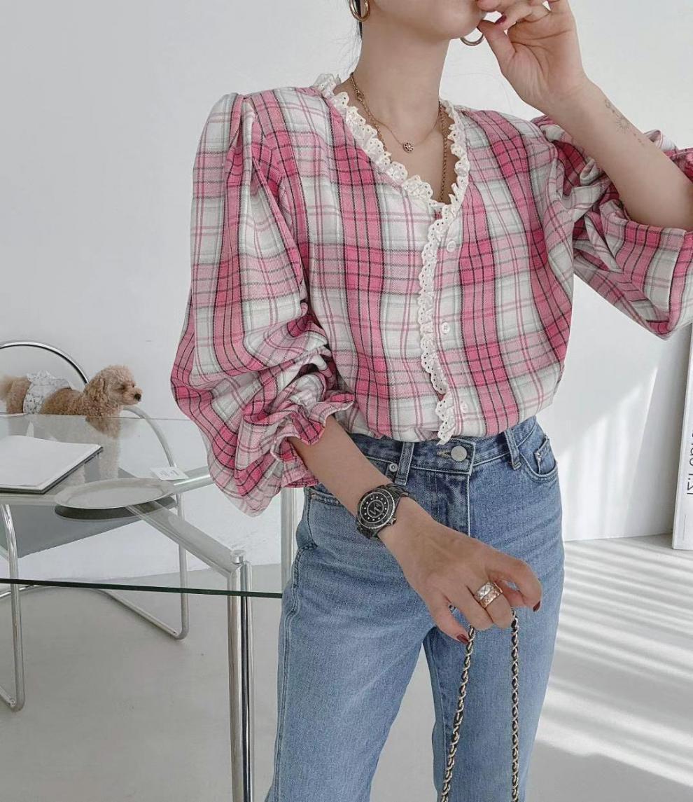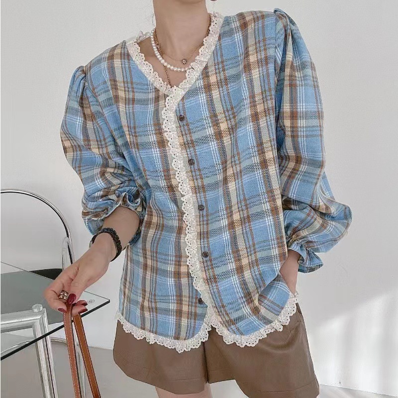 한국 세련된 프랑스 틈새 스위트 레이스 스티칭 V 넥 퍼프 슬리브 체크 무늬 셔츠 탑스토어 가기