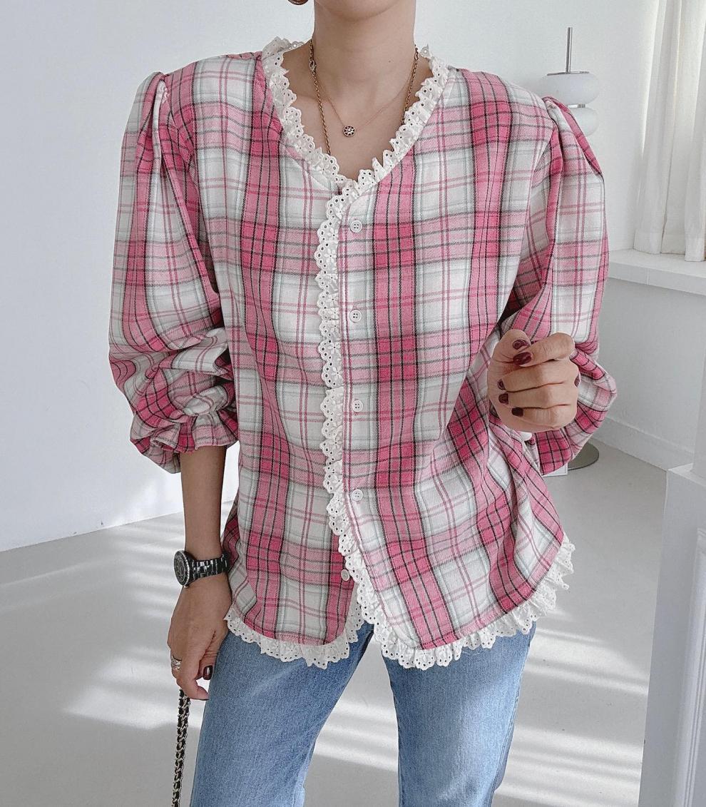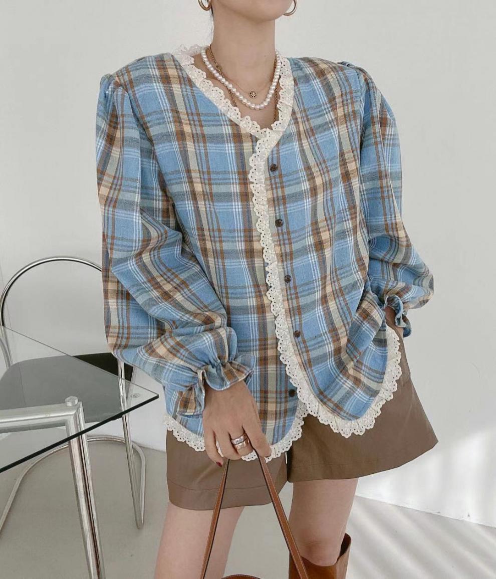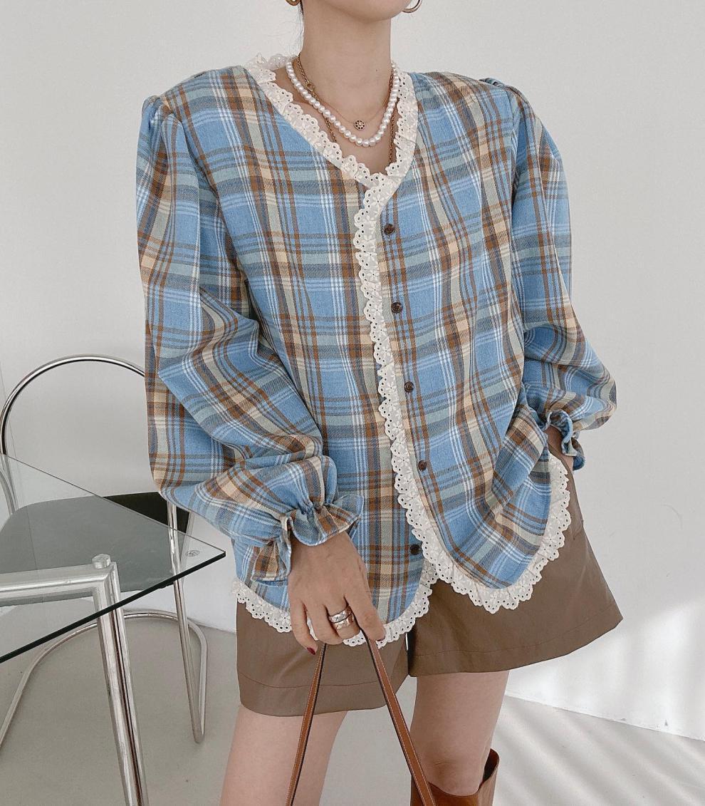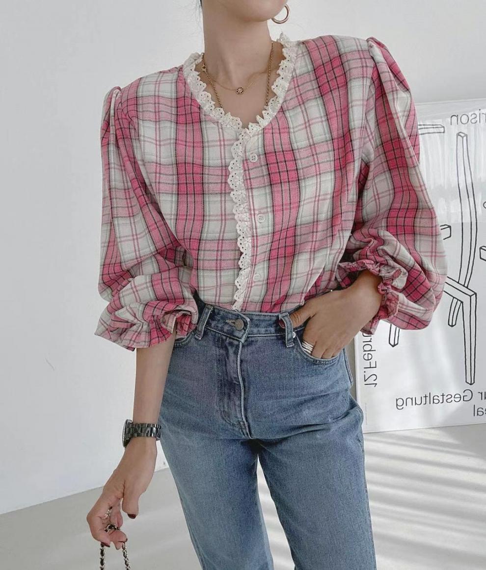 한국 세련된 프랑스 틈새 스위트 레이스 스티칭 V 넥 퍼프 슬리브 체크 무늬 셔츠 탑스토어 가기