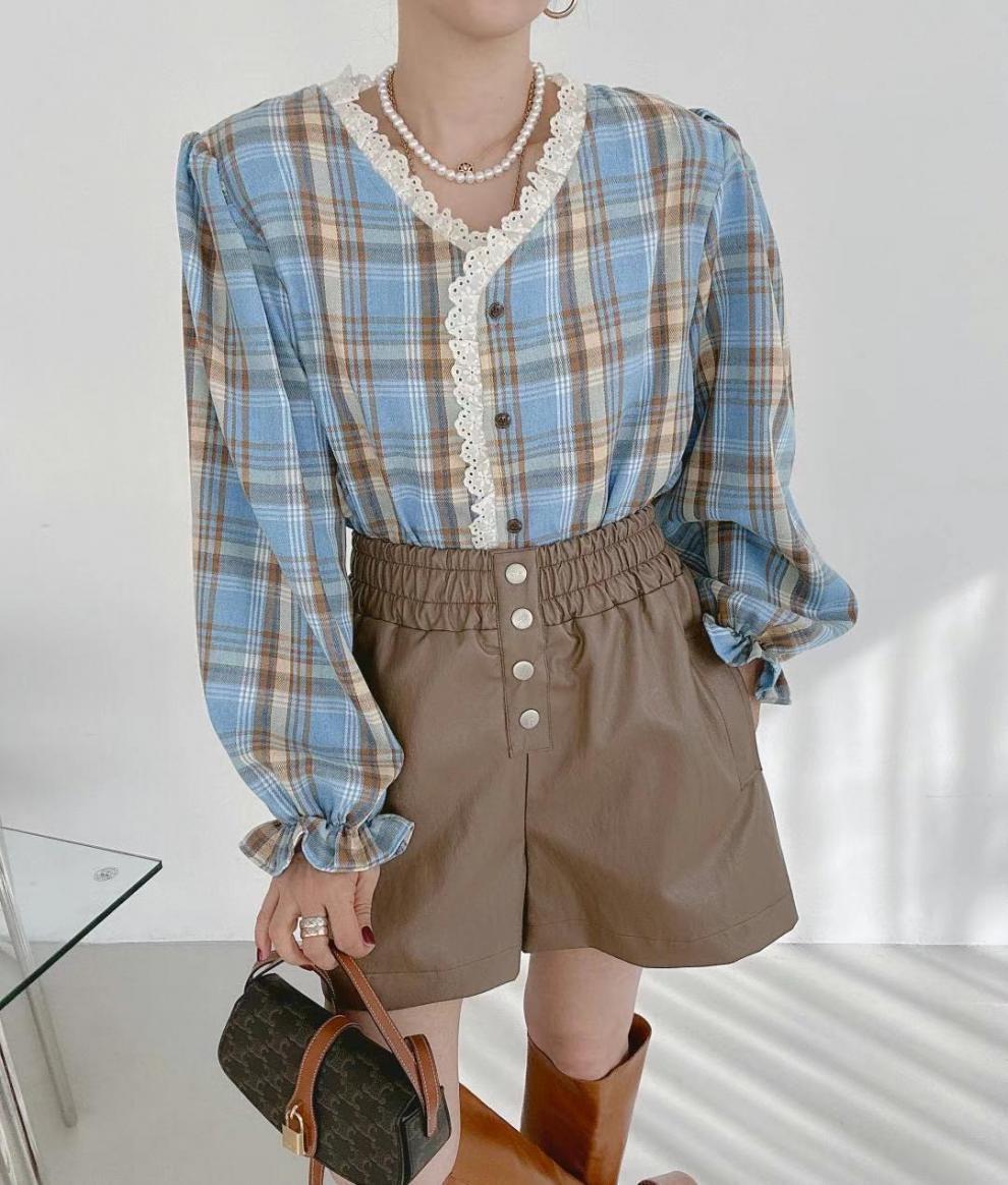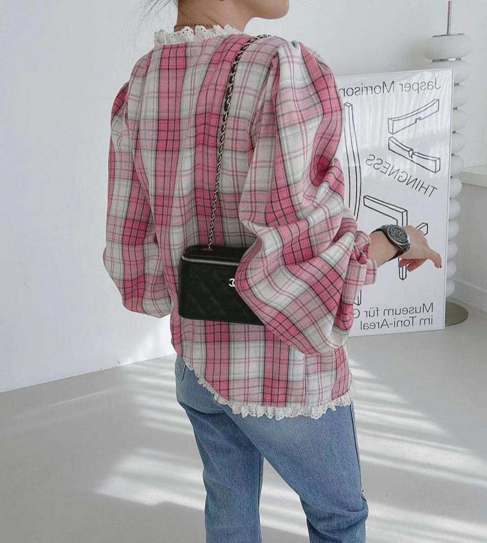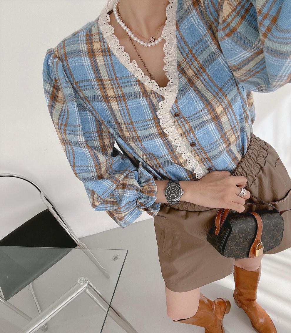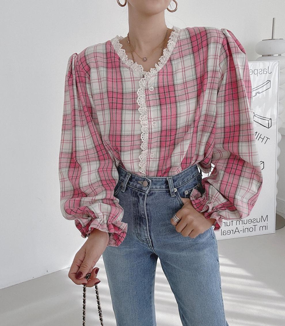 한국 세련된 프랑스 틈새 스위트 레이스 스티칭 V 넥 퍼프 슬리브 체크 무늬 셔츠 탑스토어 가기