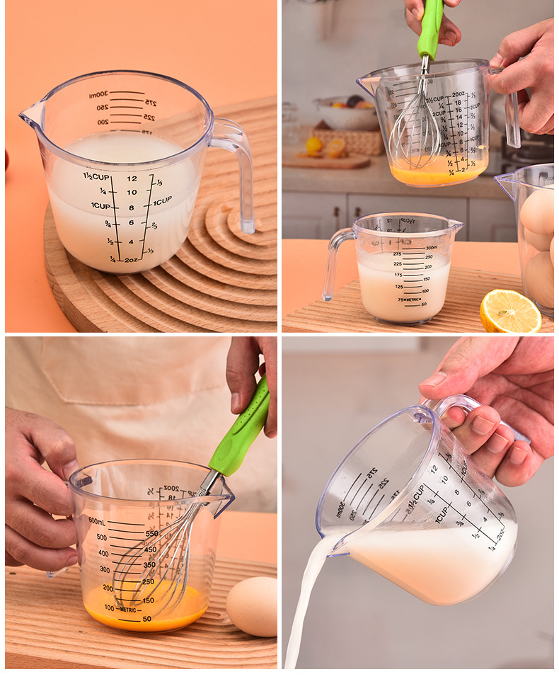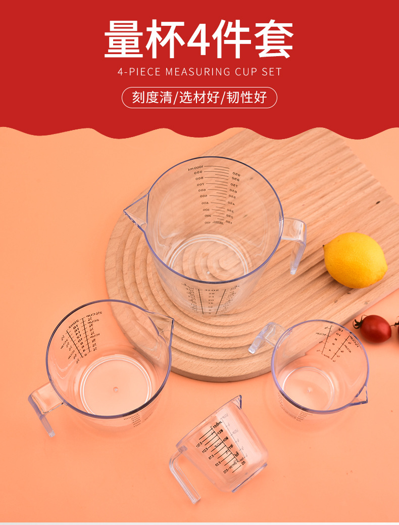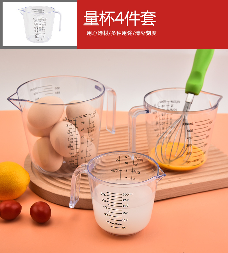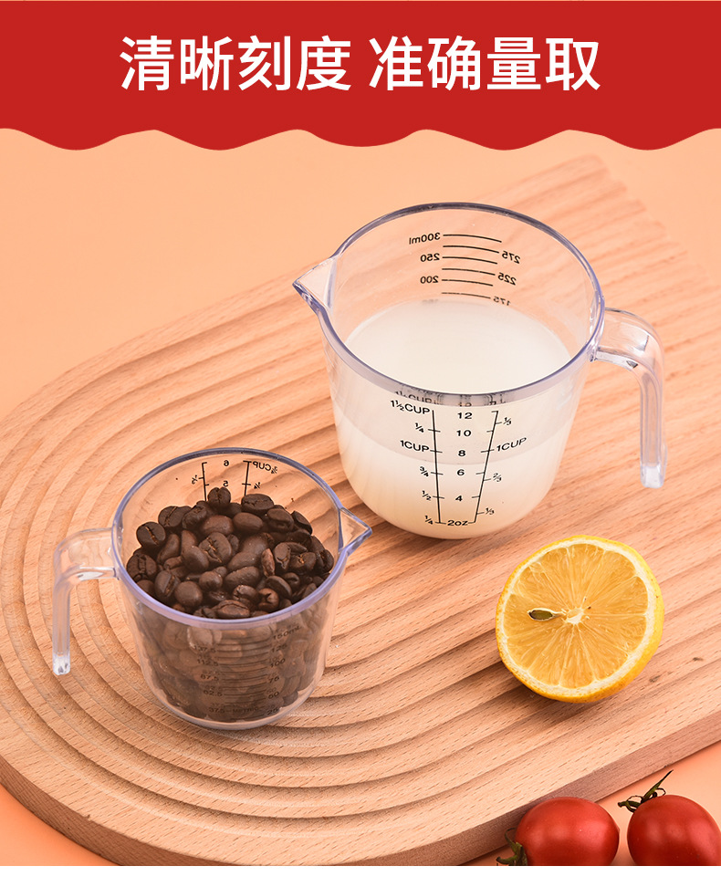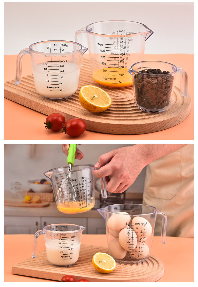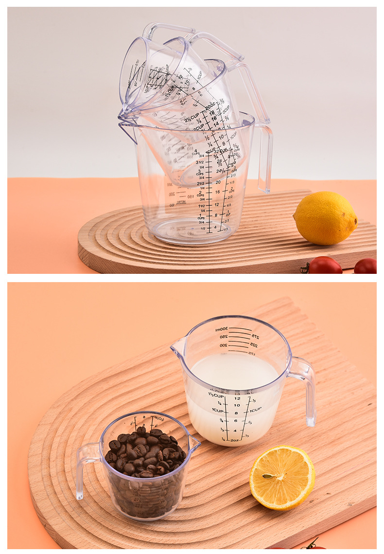 재고 PS 측정 컵 손잡이 플라스틱 측정 컵 스케일 베이킹 측정 컵 밀리리터 컵 가구 규모가있는 투명 측정 컵