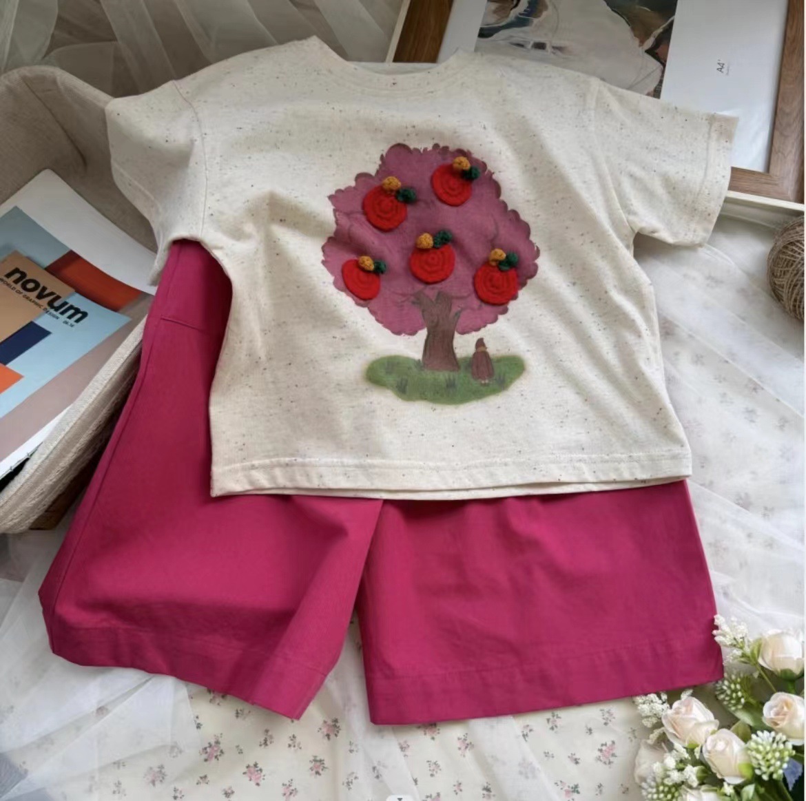 한국 아동복 소녀 세트 2024 여름 서양식 만화 인쇄 느슨한 반팔 티셔츠 로즈 레드 와이드 레그 바지