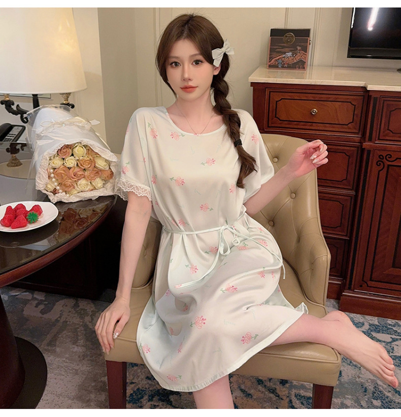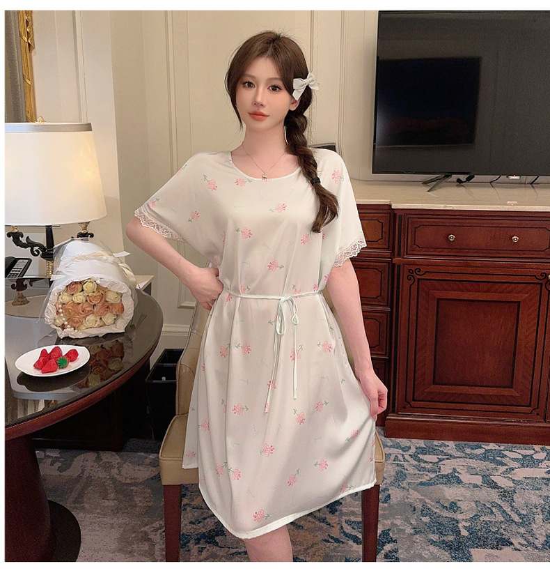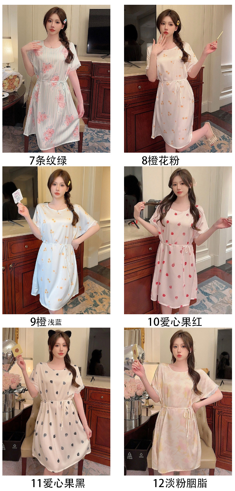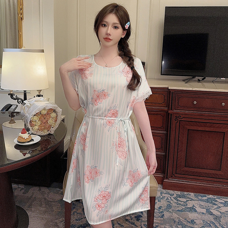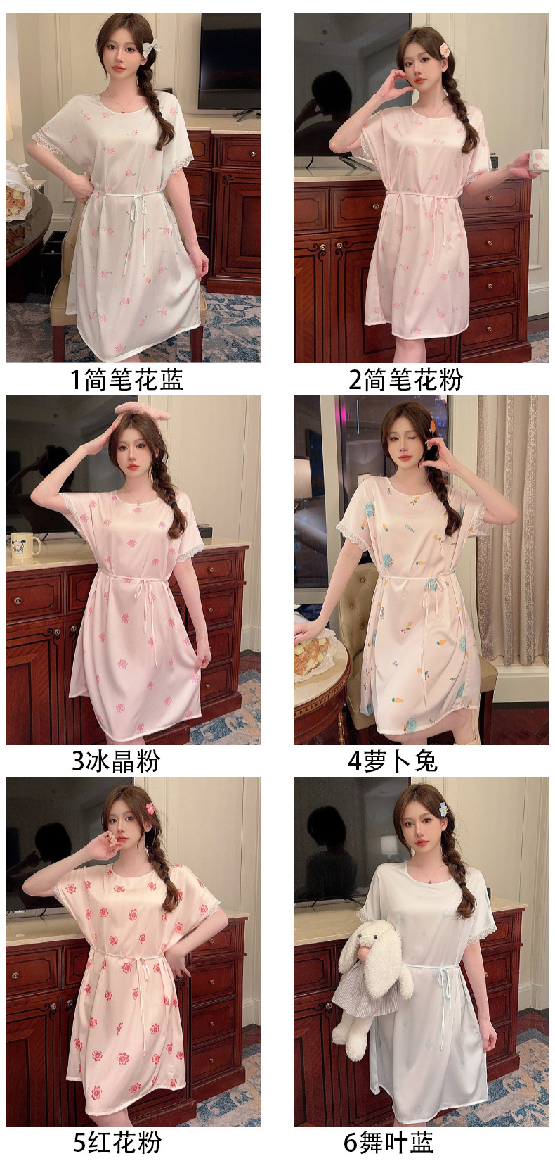 여성용 잠옷 여름 2024 여름 새로운 스타일의 아이스 실크 인쇄 여름 플러스 사이즈 느슨한 얇은 풀오버 나이트 드레스 홈 웨어스토어 가기