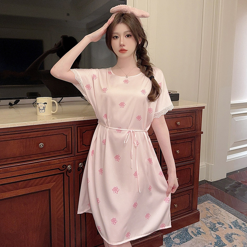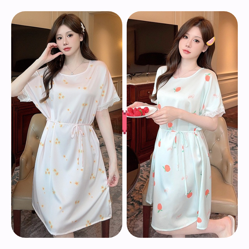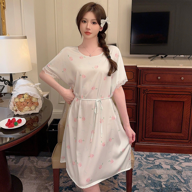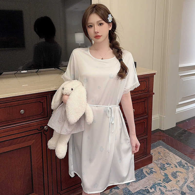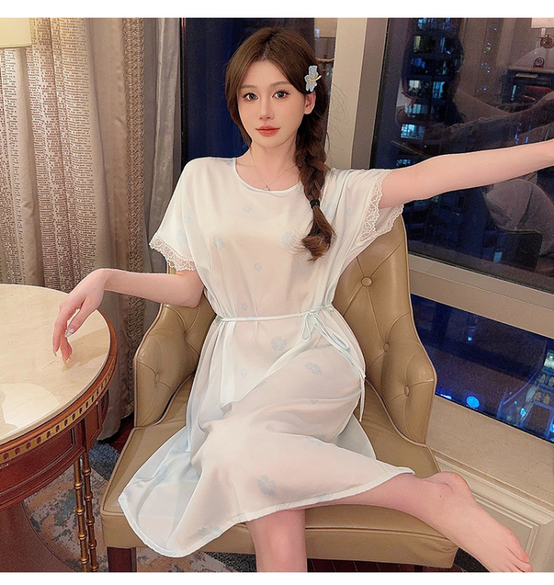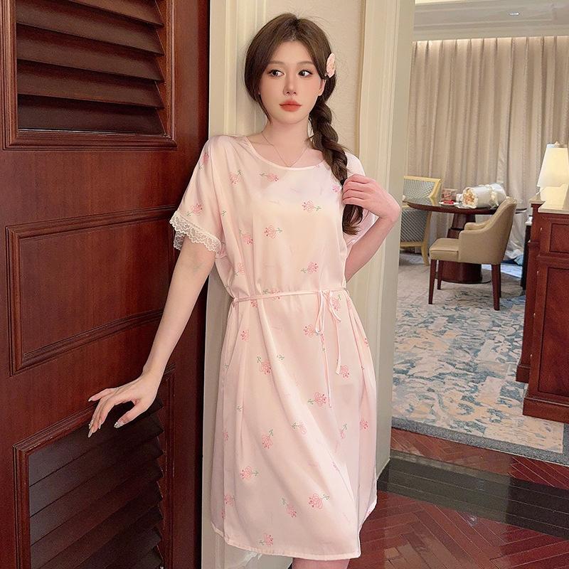 여성용 잠옷 여름 2024 여름 새로운 스타일의 아이스 실크 인쇄 여름 플러스 사이즈 느슨한 얇은 풀오버 나이트 드레스 홈 웨어스토어 가기