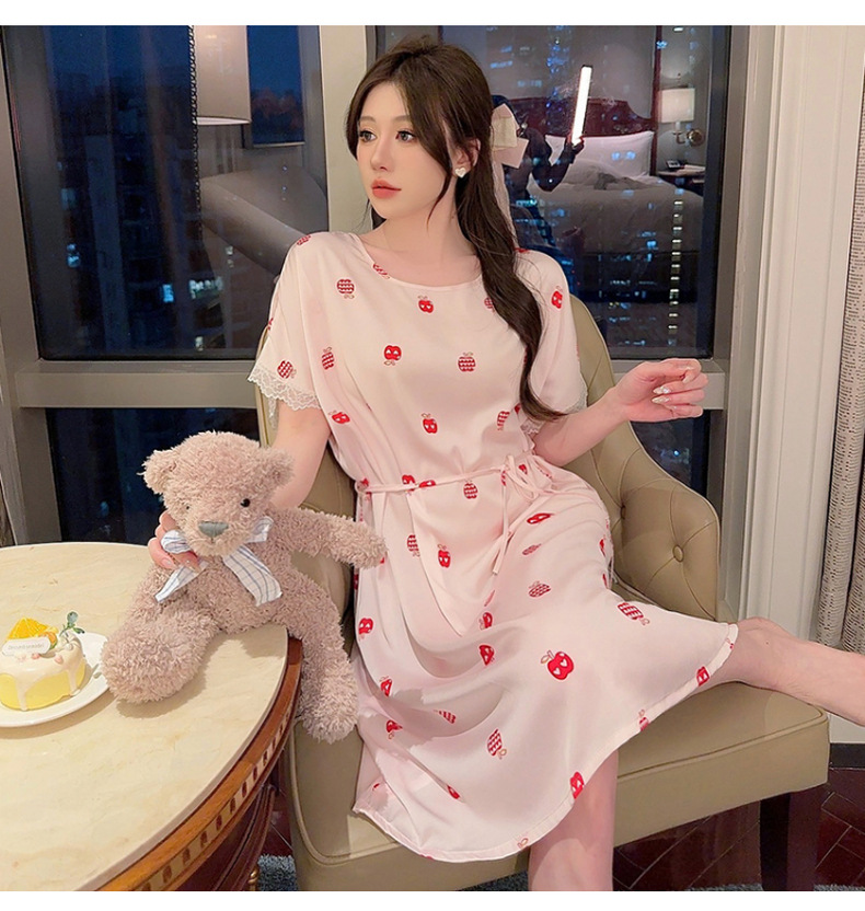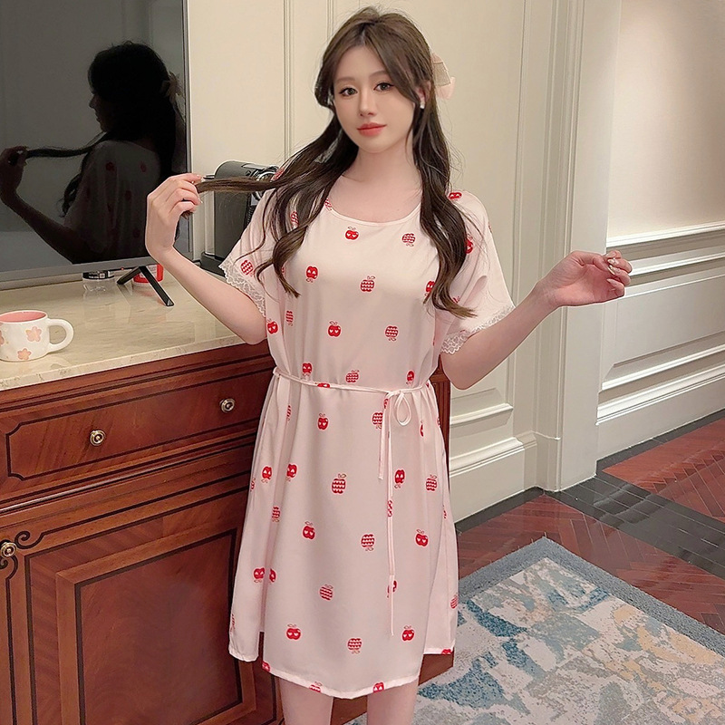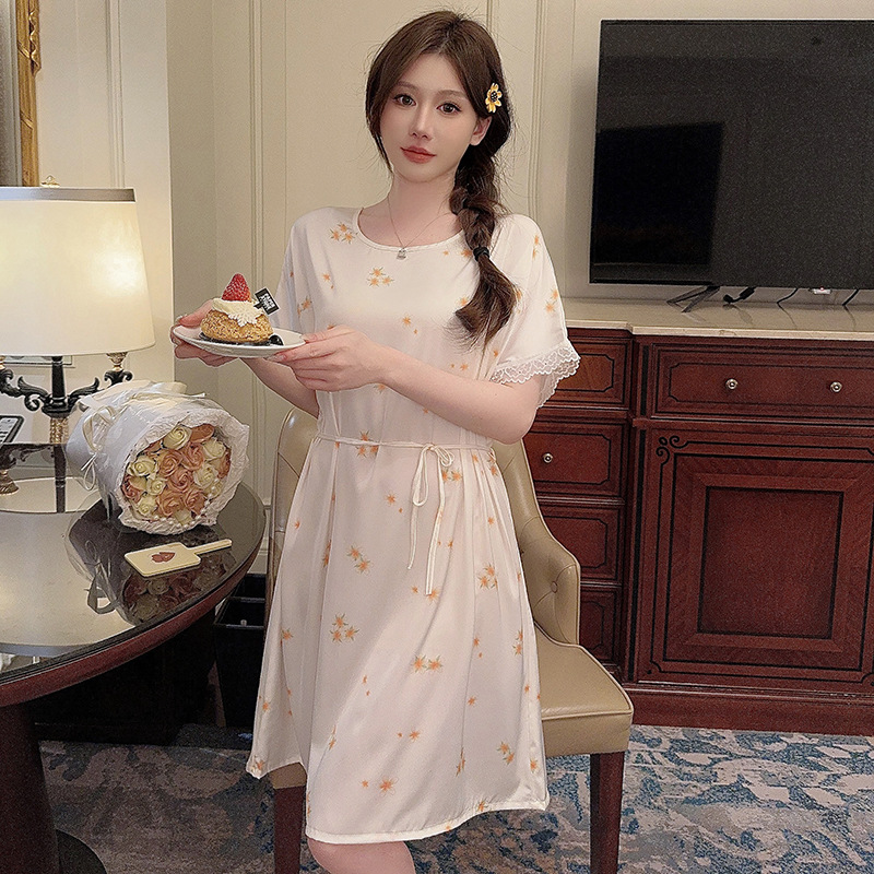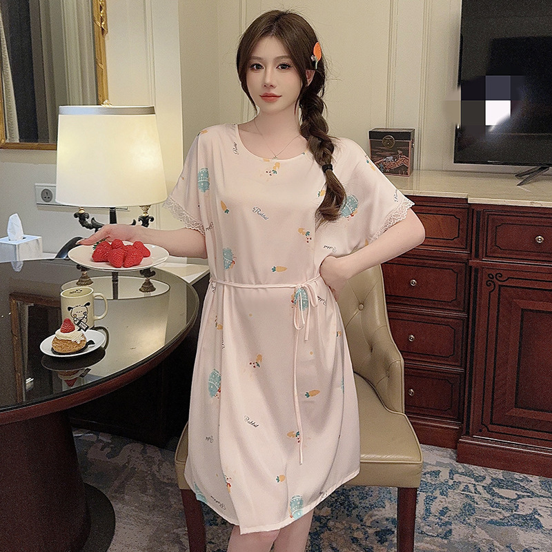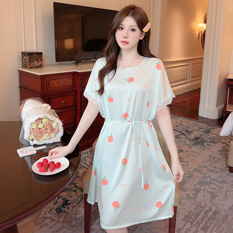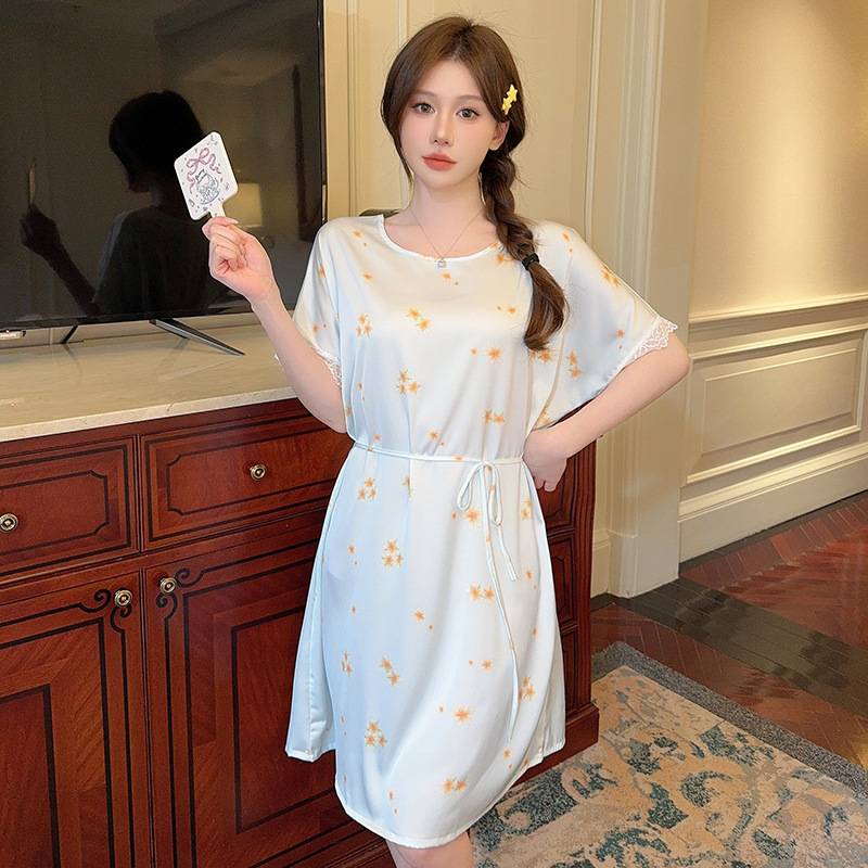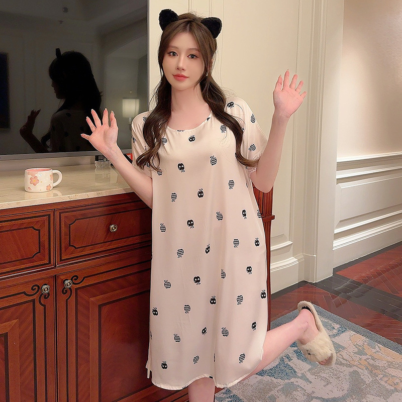여성용 잠옷 여름 2024 여름 새로운 스타일의 아이스 실크 인쇄 여름 플러스 사이즈 느슨한 얇은 풀오버 나이트 드레스 홈 웨어