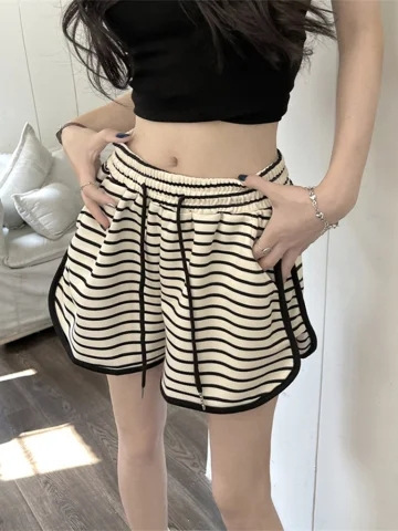 플러스 사이즈 캐주얼 스포츠 반바지 여성 여름 한국 스타일 새로운 높은 허리 슬리밍 스트라이프 탄성 허리 다목적 야외 핫 팬츠