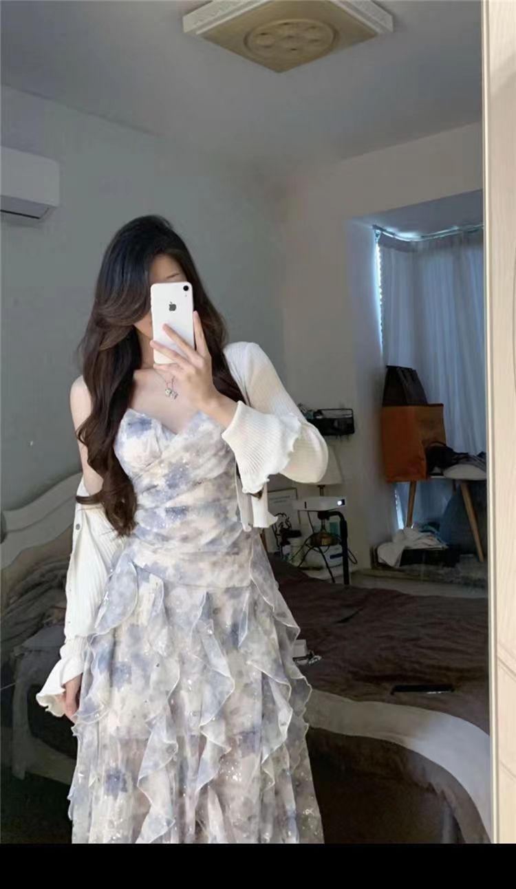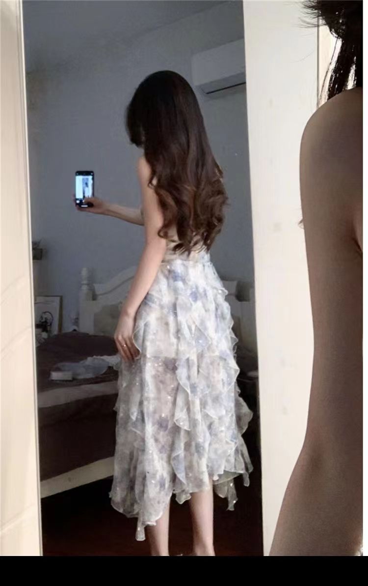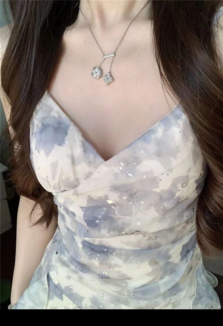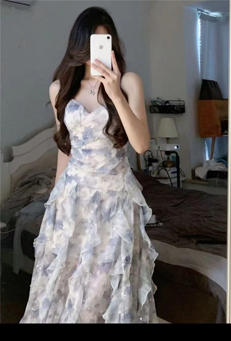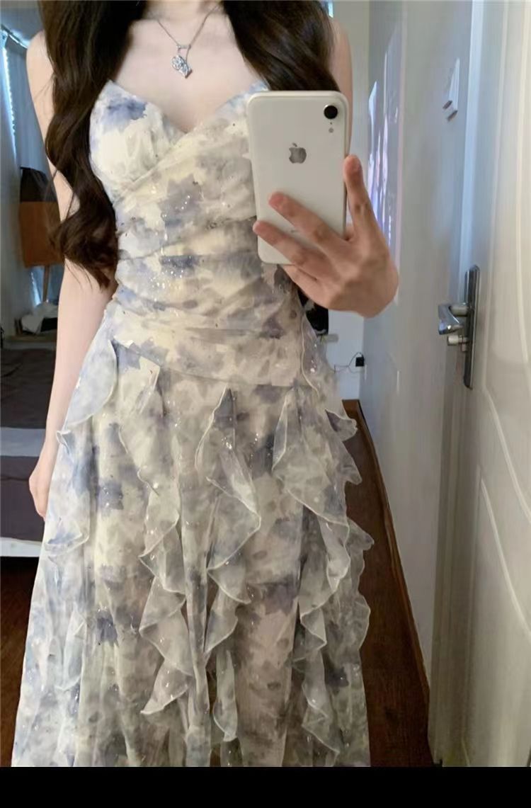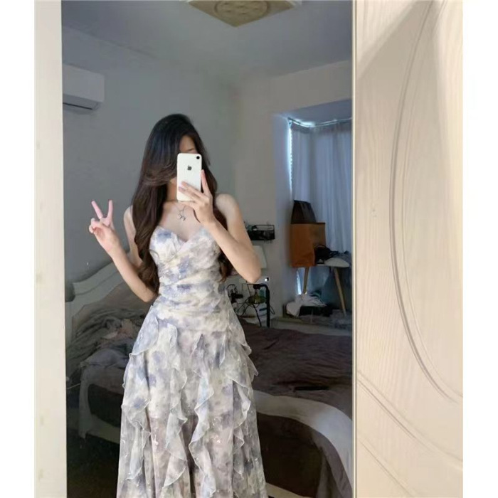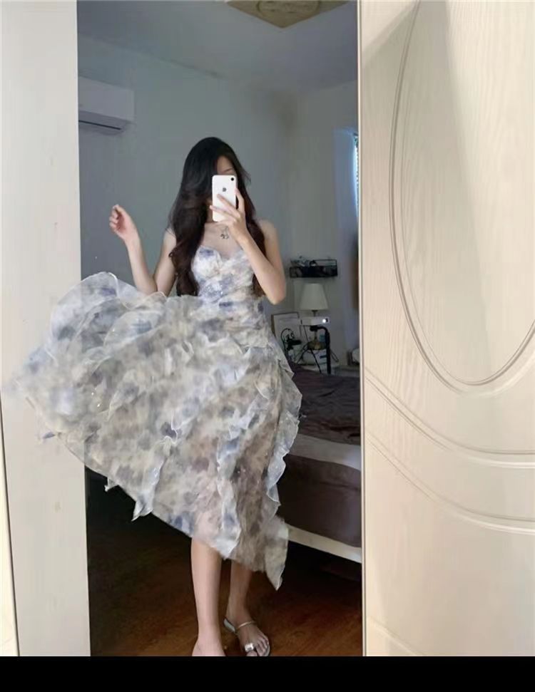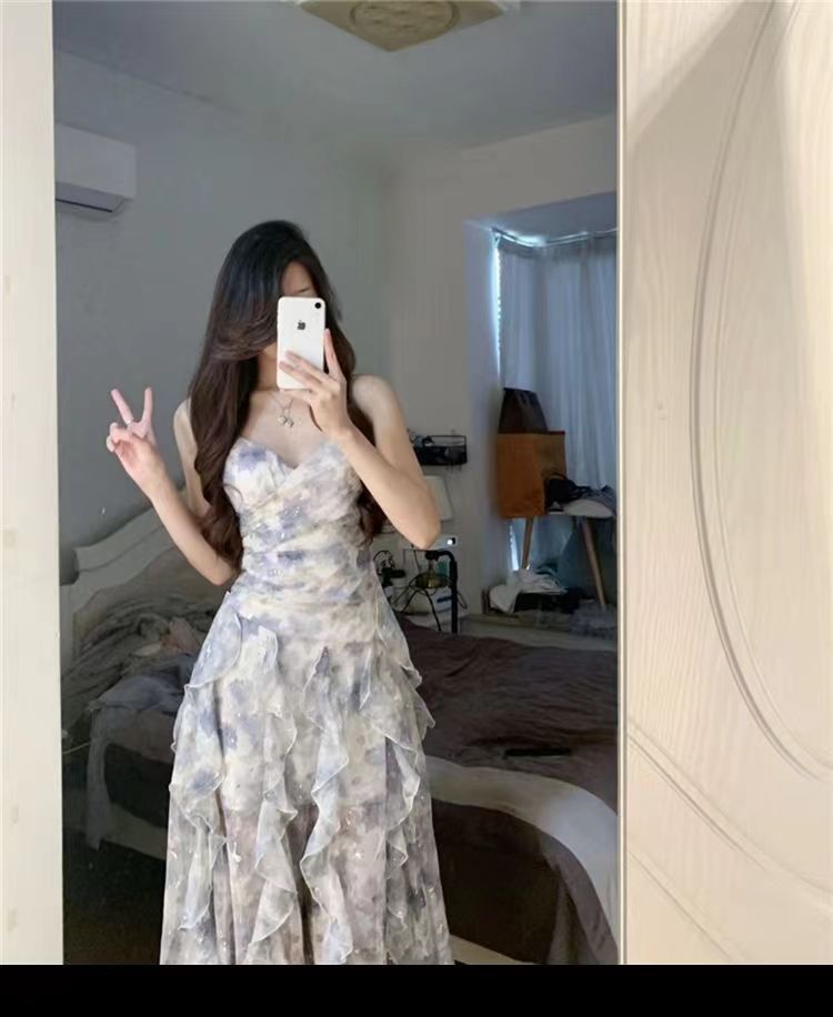 꽃 스트랩 원피스 여성의 여름 V 넥 타이트 허리 우아한 요정 스커트 순수한 욕망 치마 틈새 핫 소녀 스위트 인 스커트스토어 가기