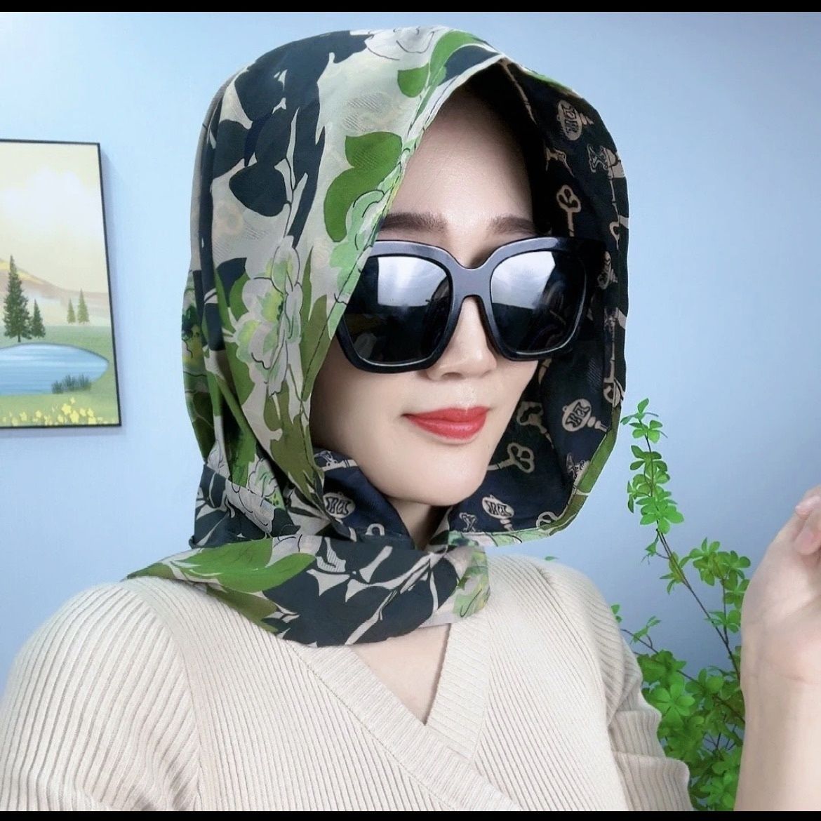 • 리브 새틴 스카프 모자-꽃 레드 윌로우 그린