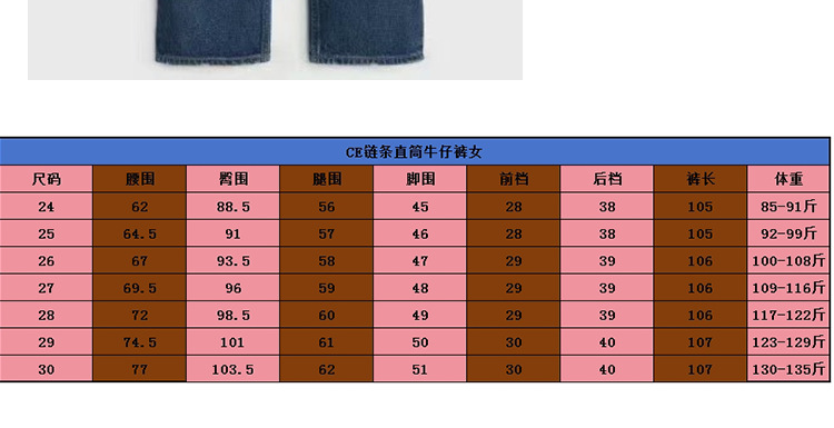 CE 스트레이트 청바지 여성 하이 웨스트 체인 진한 파란색 바지 스타 인터넷 연예인 같은 스타일 2025 여름 공장 직접 판매스토어 가기