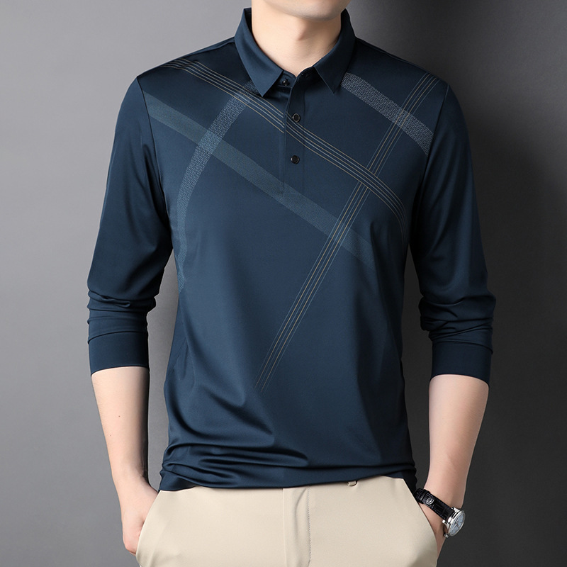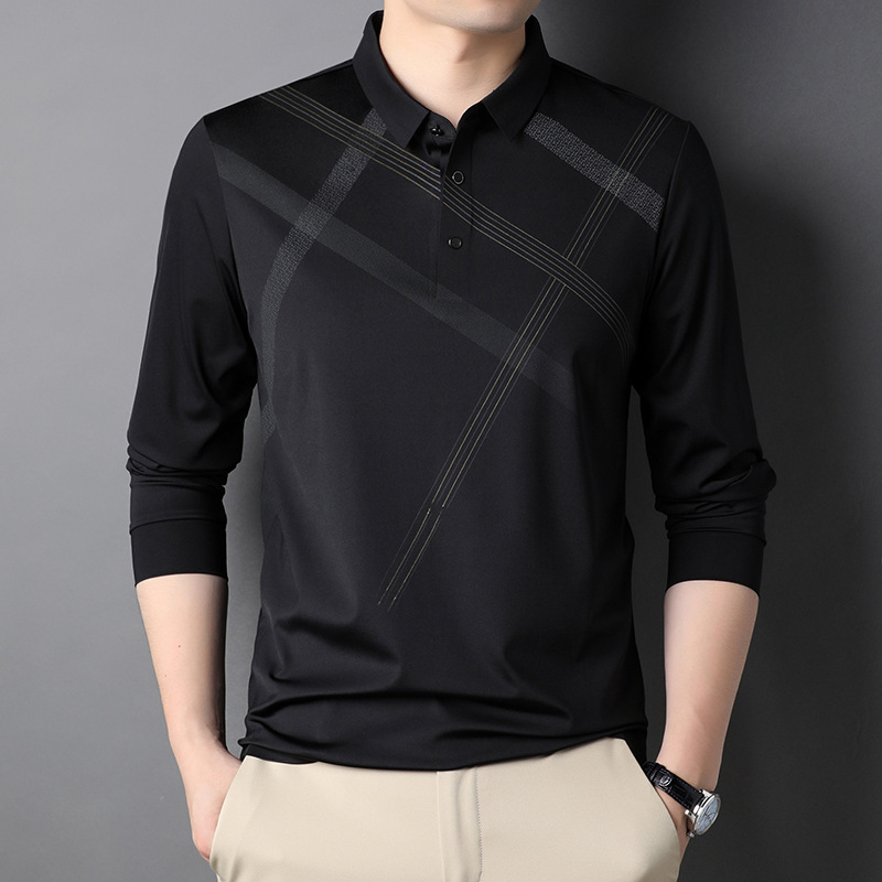 폴로 셔츠 남성용 가을 아이스 실크 긴소매 비즈니스 캐주얼 옷깃 티셔츠 남성용 체크 무늬 트렌디 한 새 남성 티셔츠