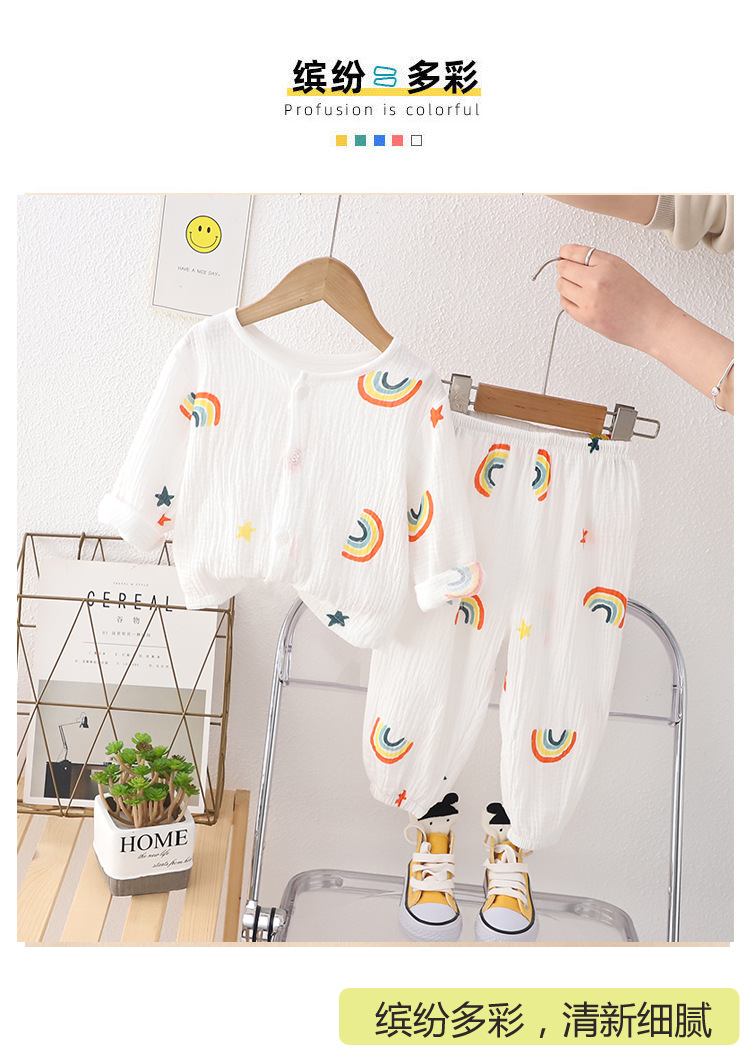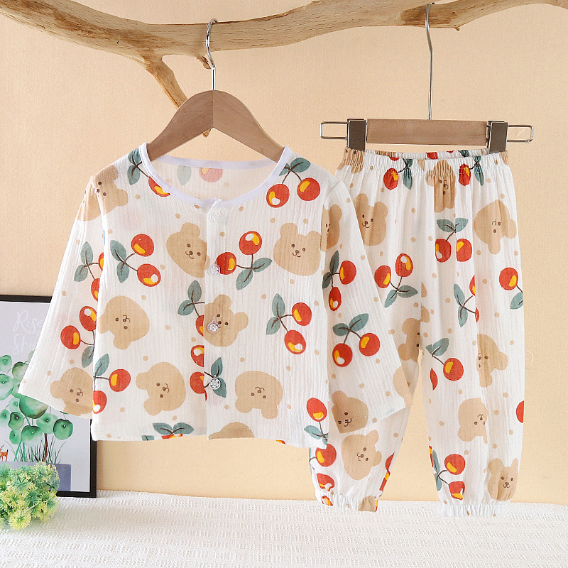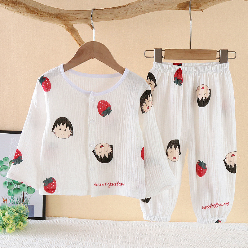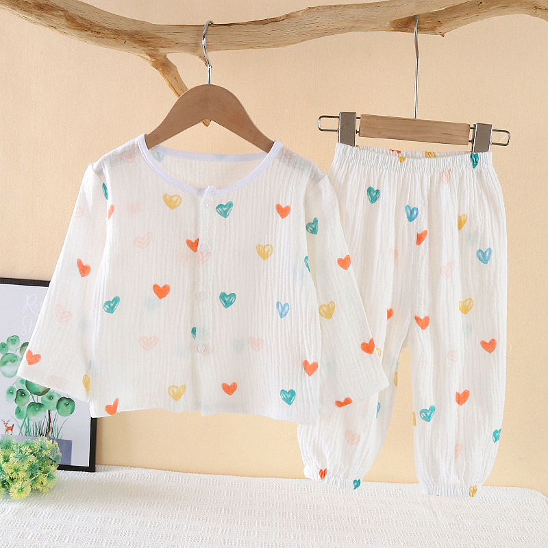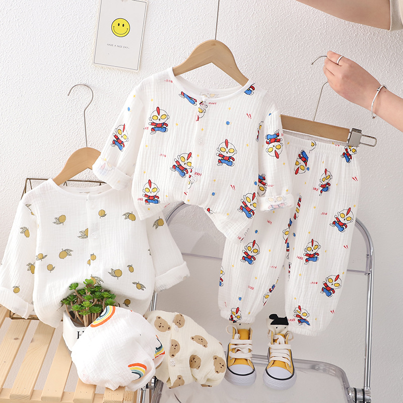2024 새로운 어린이 가정은 얇은 봄과 여름 소년 소녀 더블 레이어 거즈 코튼 에어컨 아동복 잠옷을 입습니다.