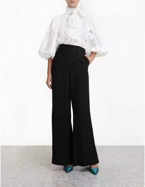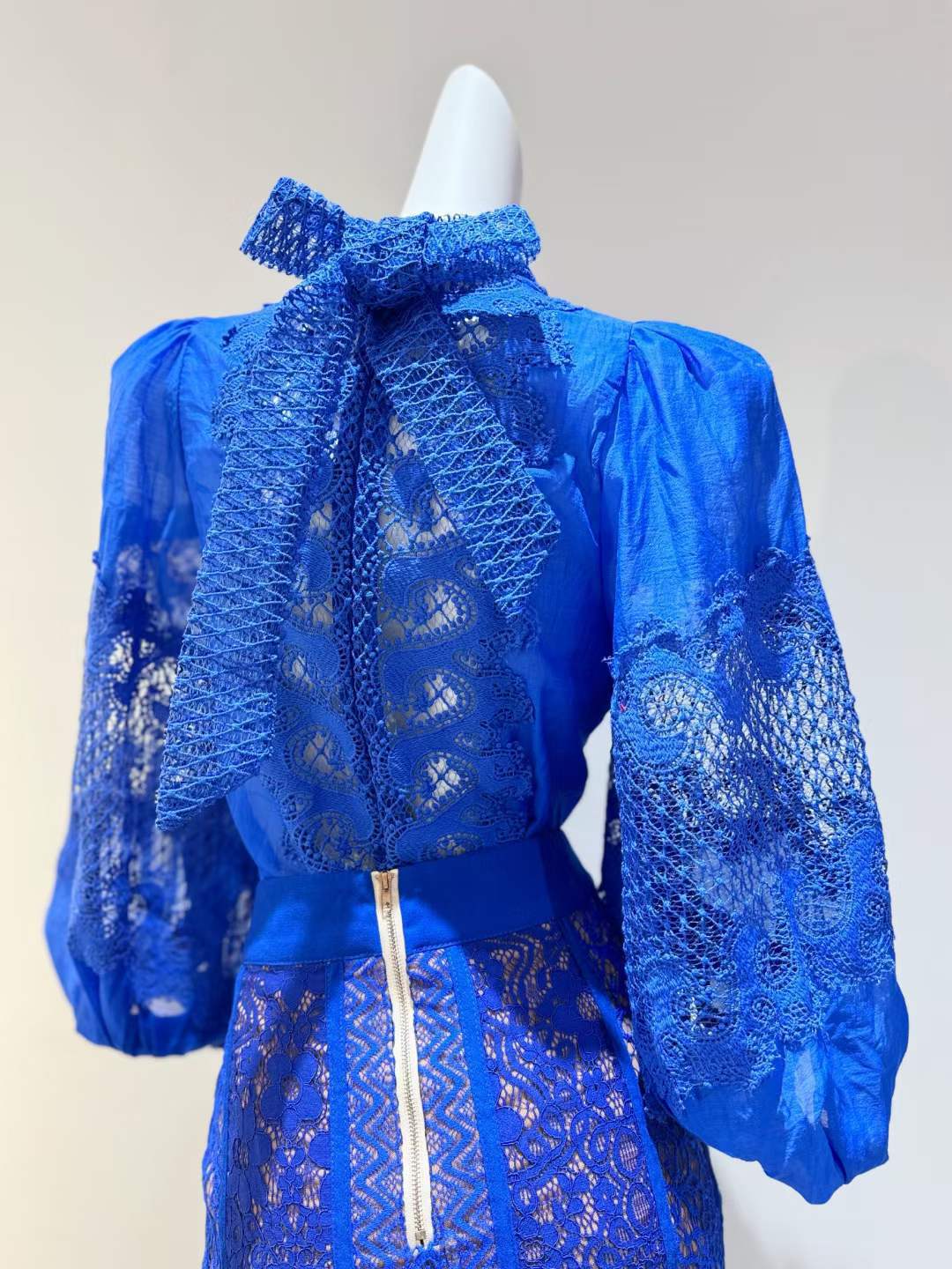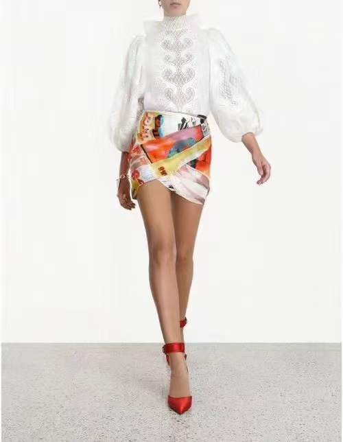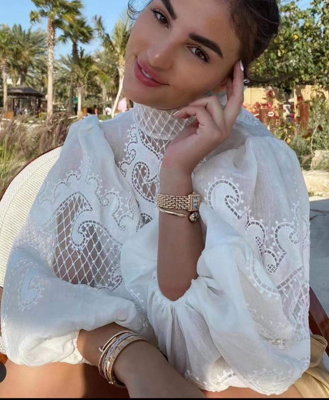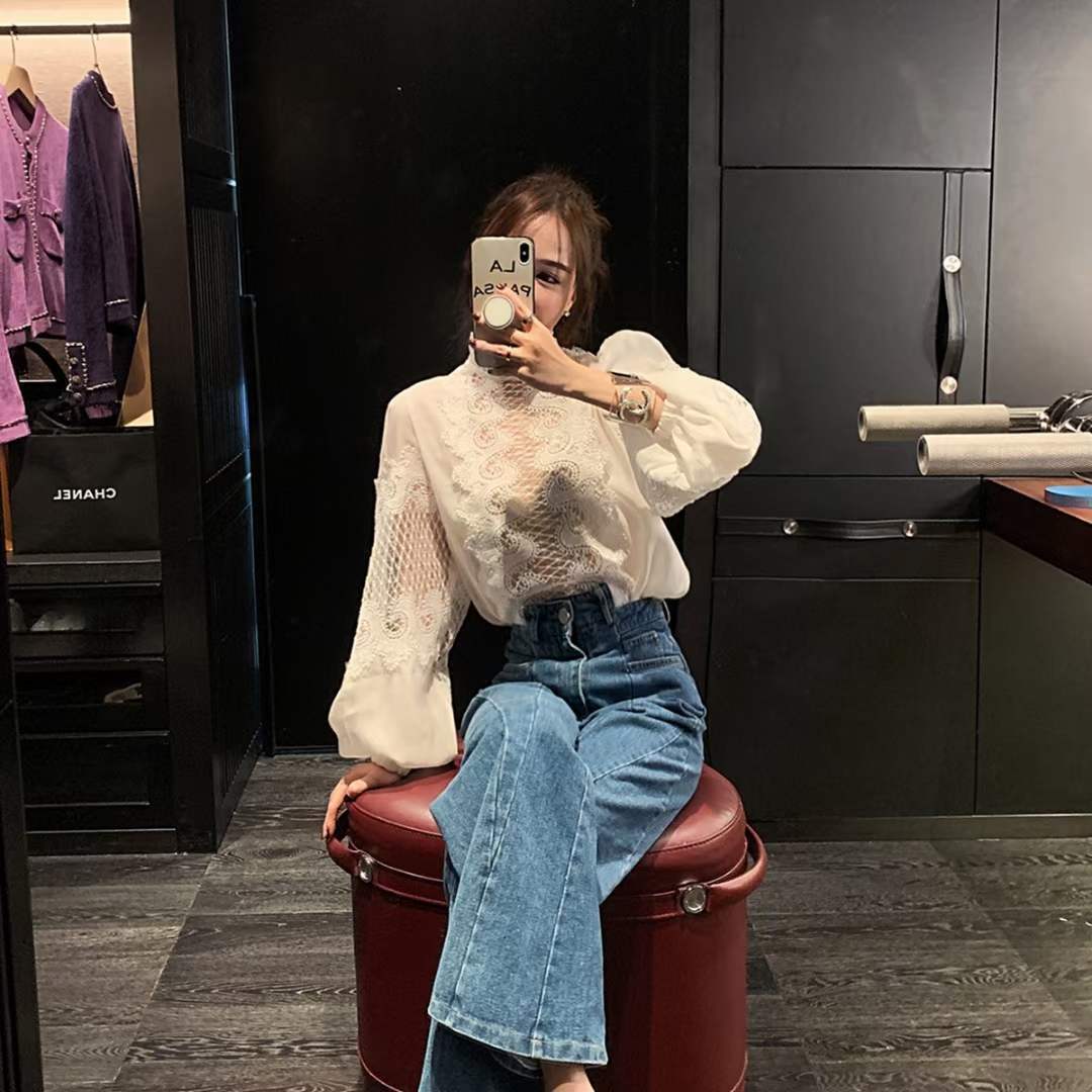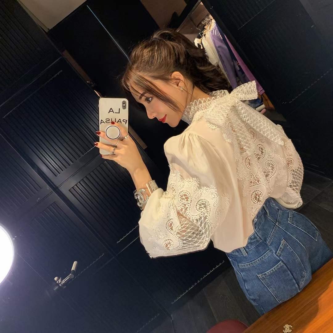 2024 봄과 여름 새로운 유명 패션 레이스 중공 레이스 디자인 센스 랜턴 슬리브 셔츠 한국 스타일 시스루 탑