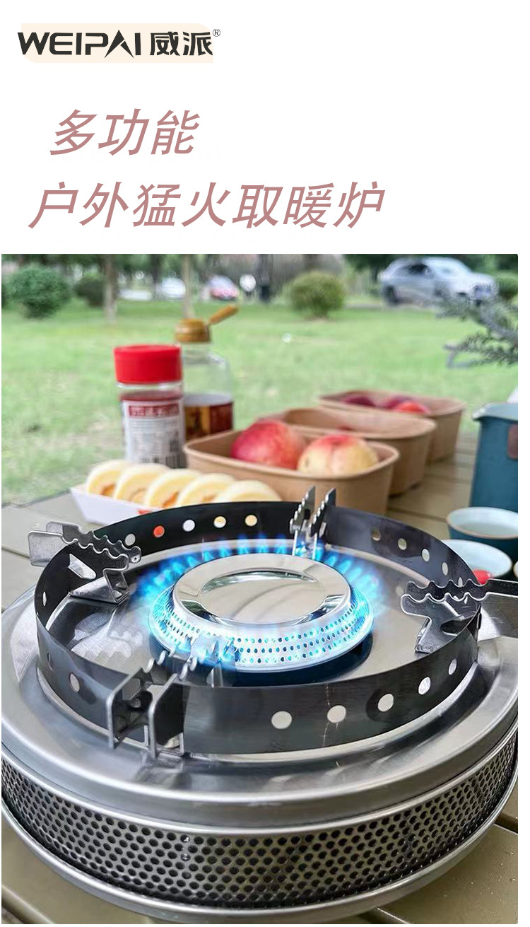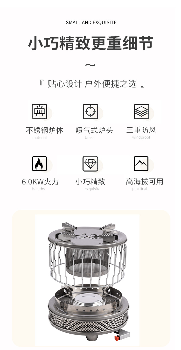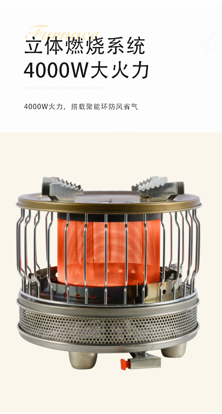 4kW猛火,户外两用取暖露营猛火炉,可以户外烧烤可以户外取暖,防风,全不锈钢材质,小巧便携,适合国内电商,跨境销售,适用人群:户外露营烧烤煮茶、车友、户外取暖,冰钓取暖炉、外贸、