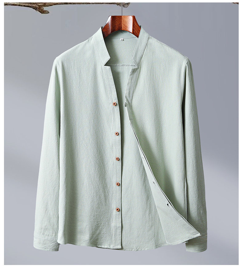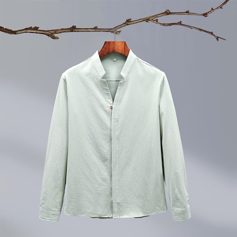 Tiktok 스타일 2024 봄 새로운 크레이프 단색 중국 스타일 남성 긴팔 셔츠 스탠드 칼라 슬림 핏 셔츠