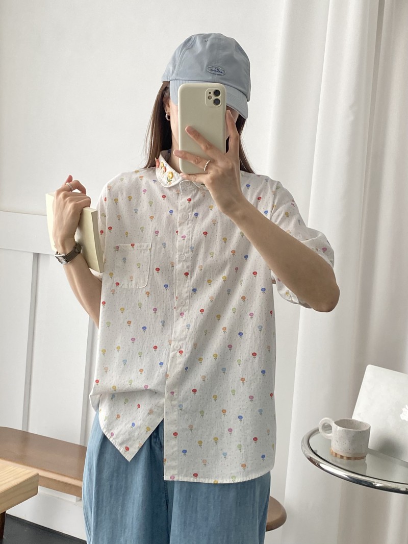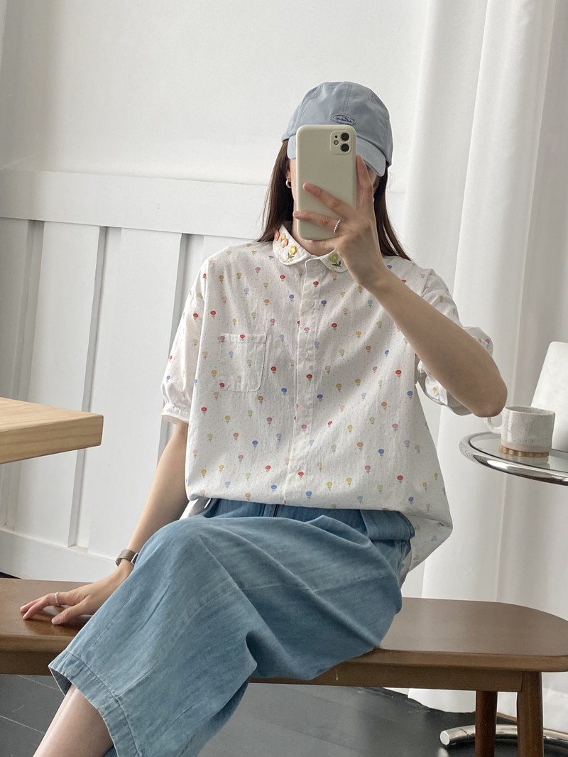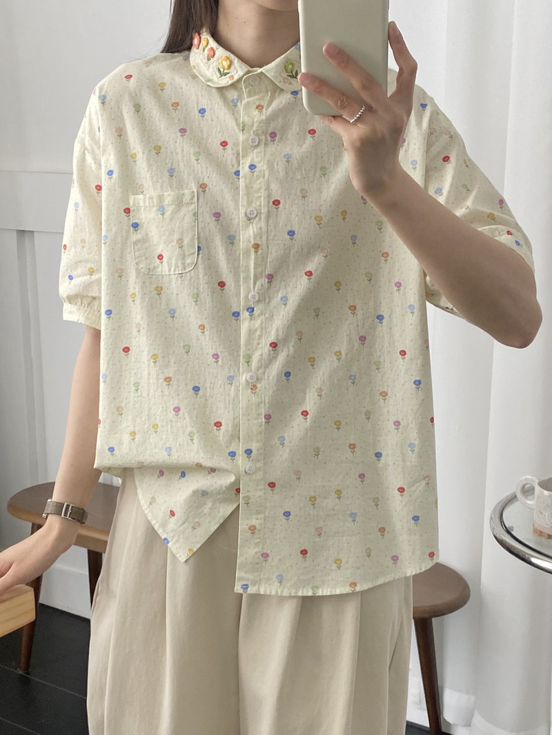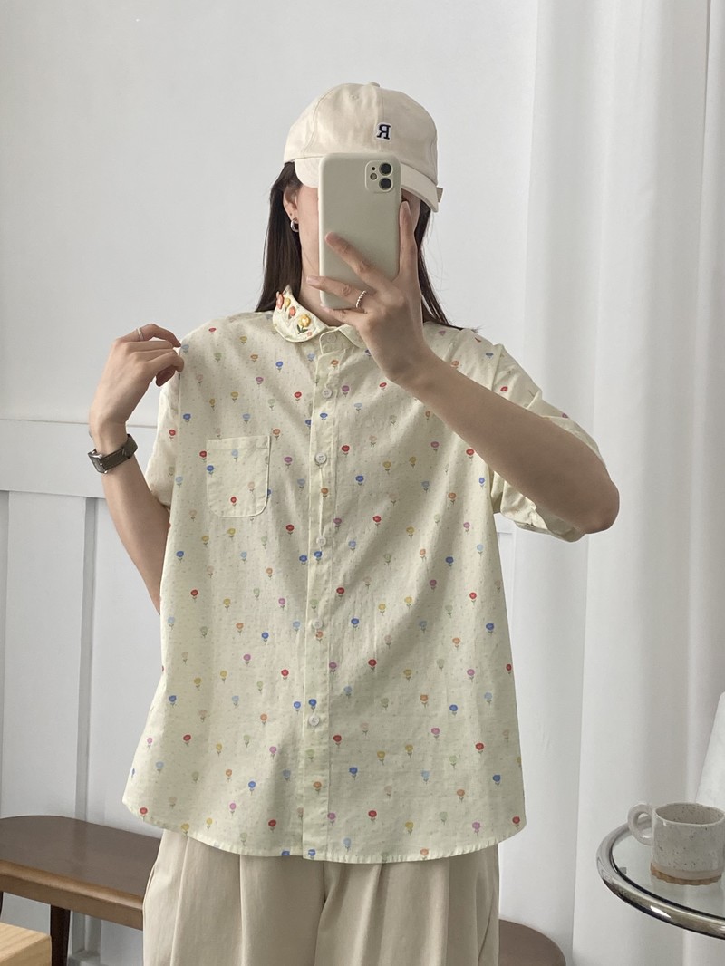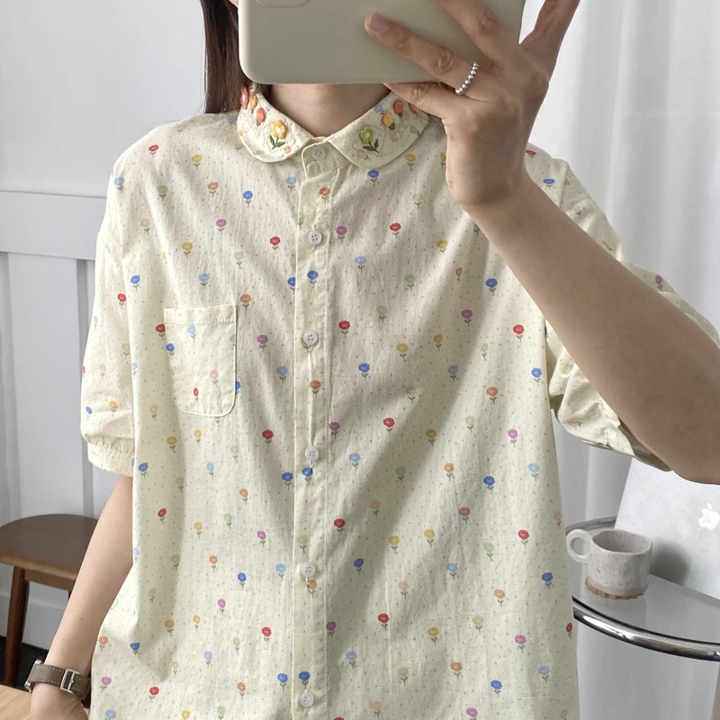 일본 모리 소녀 새로운 스타일 잔디 인쇄 칼라 작은 꽃 장식 느슨한 짧은 소매 셔츠 도매 패션스토어 가기
