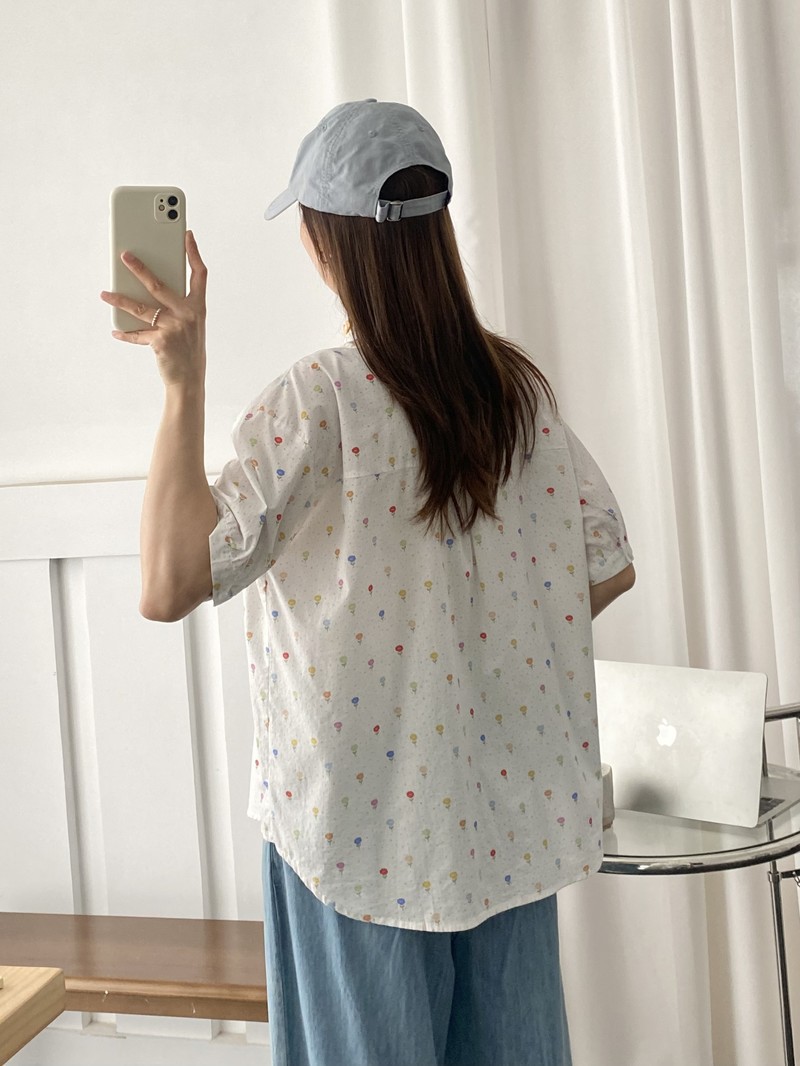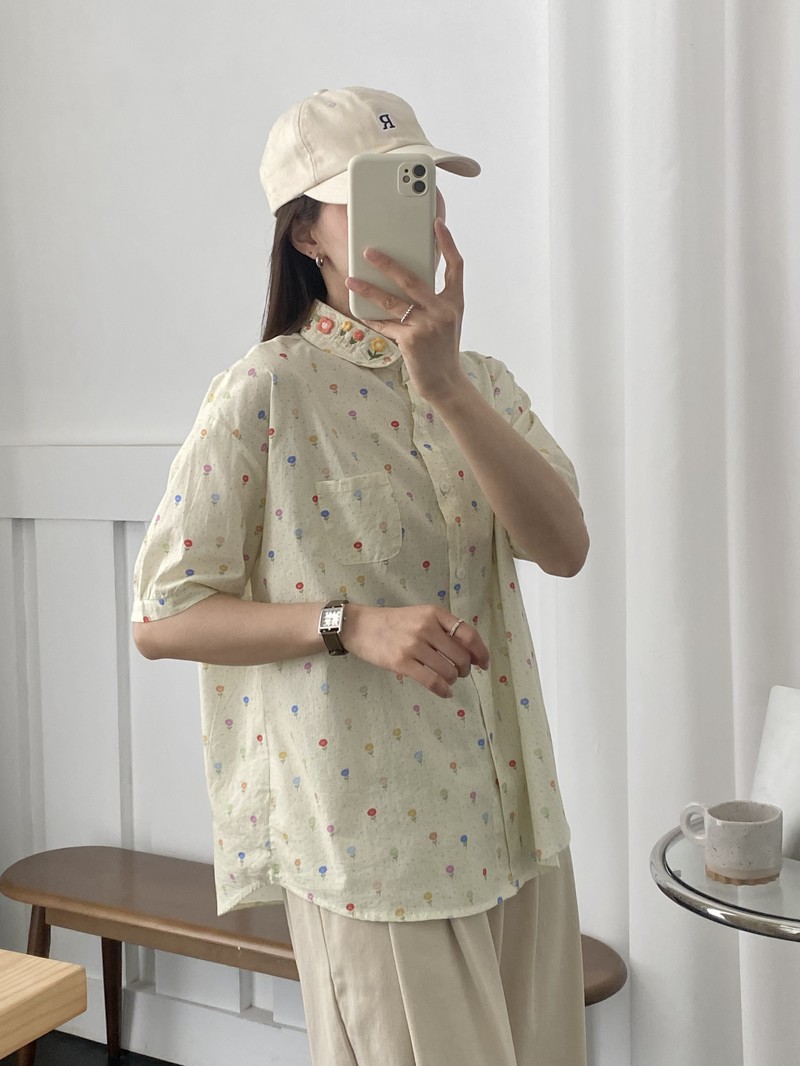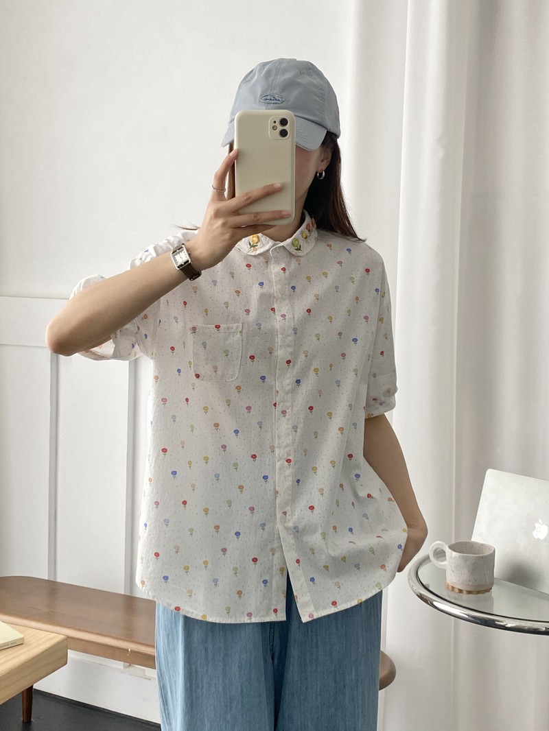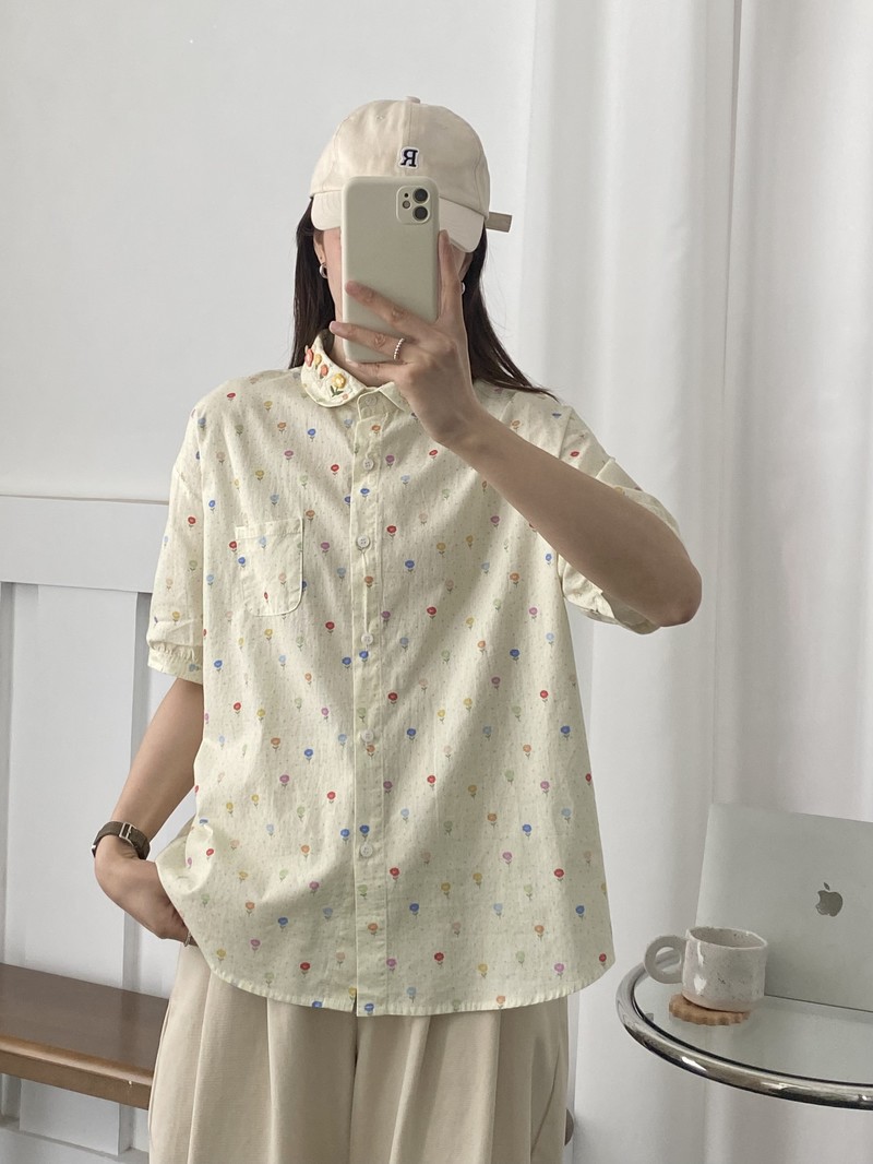 일본 모리 소녀 새로운 스타일 잔디 인쇄 칼라 작은 꽃 장식 느슨한 짧은 소매 셔츠 도매 패션스토어 가기