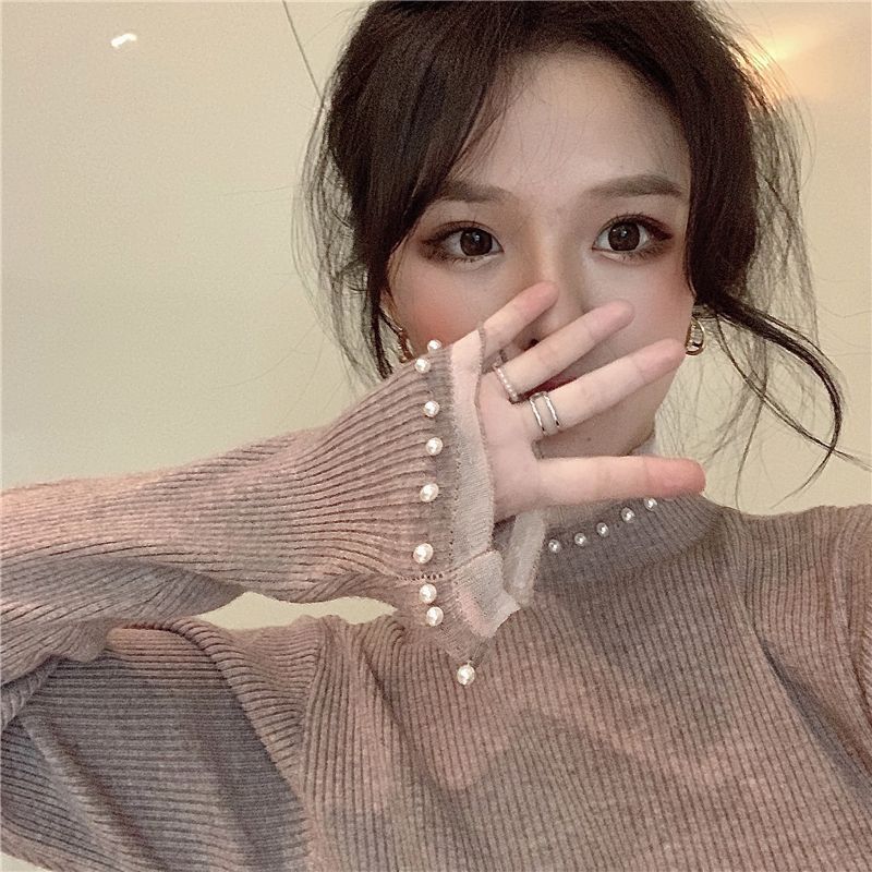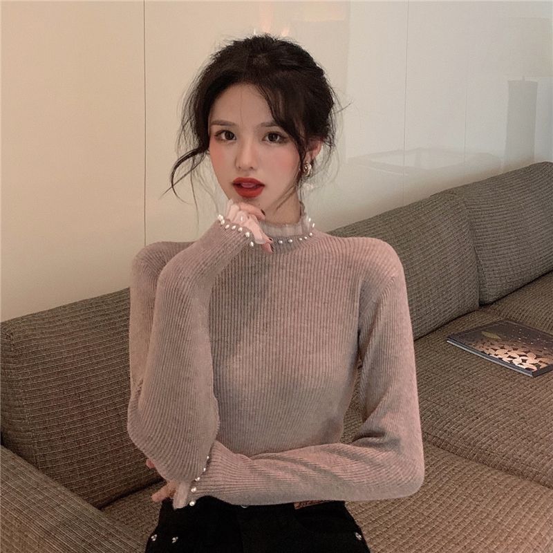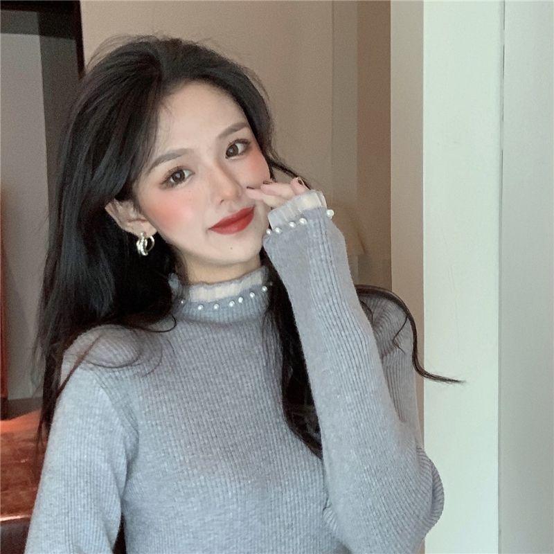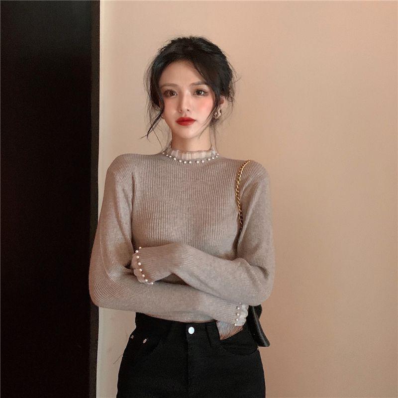 레이스 스티치 슬림핏 진주 스웨터 여성용 이너웨어 가을 겨울 긴팔 니트 탑 하이넥 아이스크림