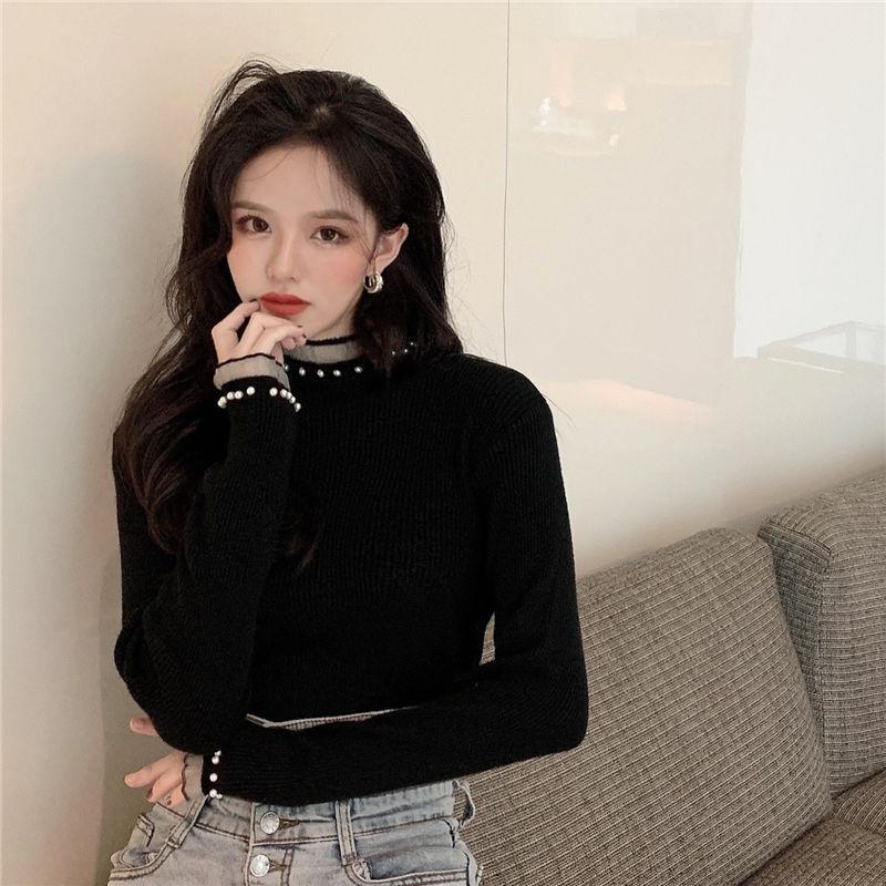 레이스 스티치 슬림핏 진주 스웨터 여성용 이너웨어 가을 겨울 긴팔 니트 탑 하이넥 아이스크림스토어 가기