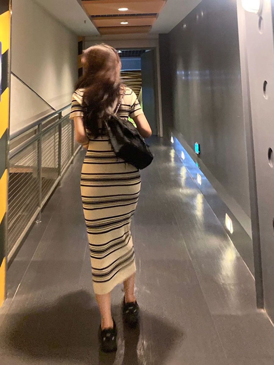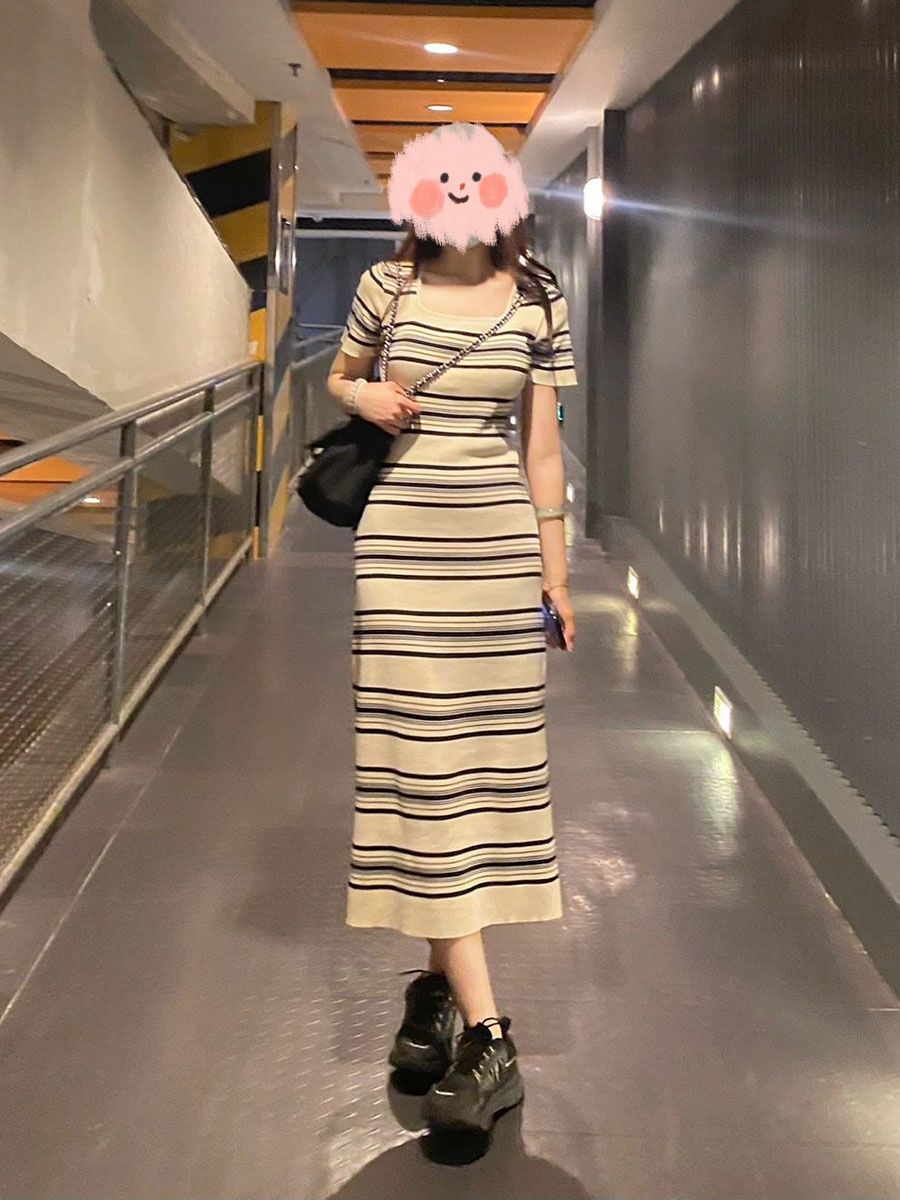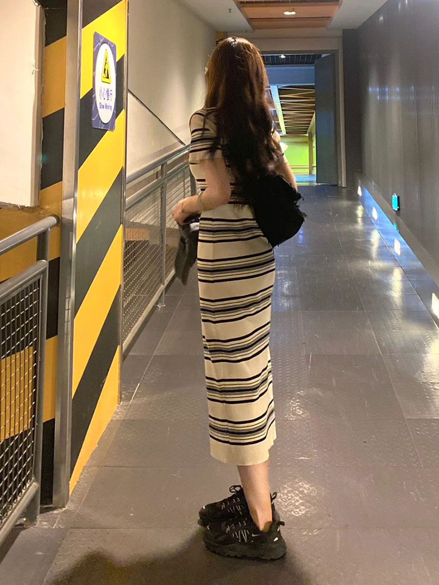 프랑스 스타일 틈새 줄무늬 니트 원피스 여성 의류 여름 2024 새로운 슬리밍 슬림 기질 칼집 긴 치마스토어 가기