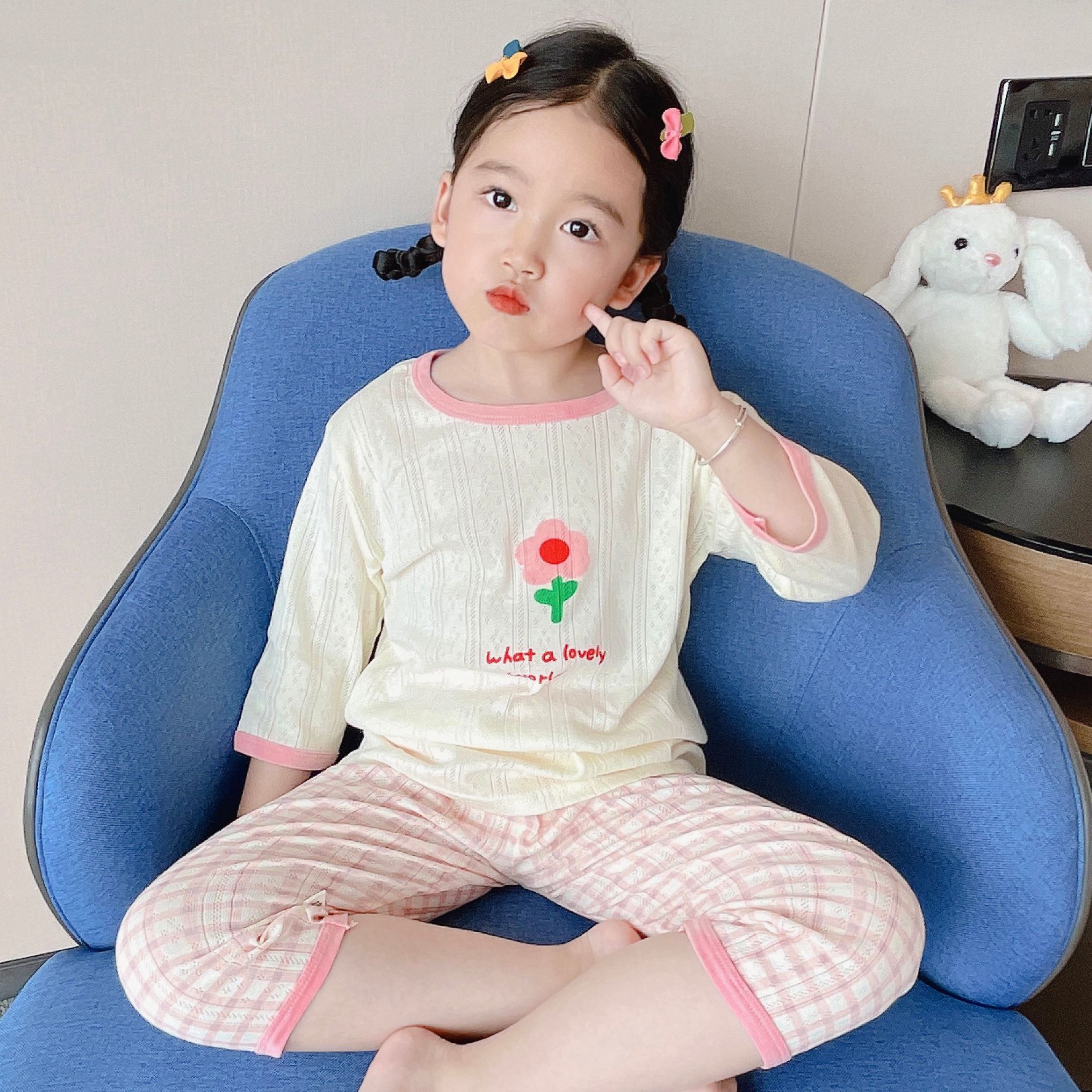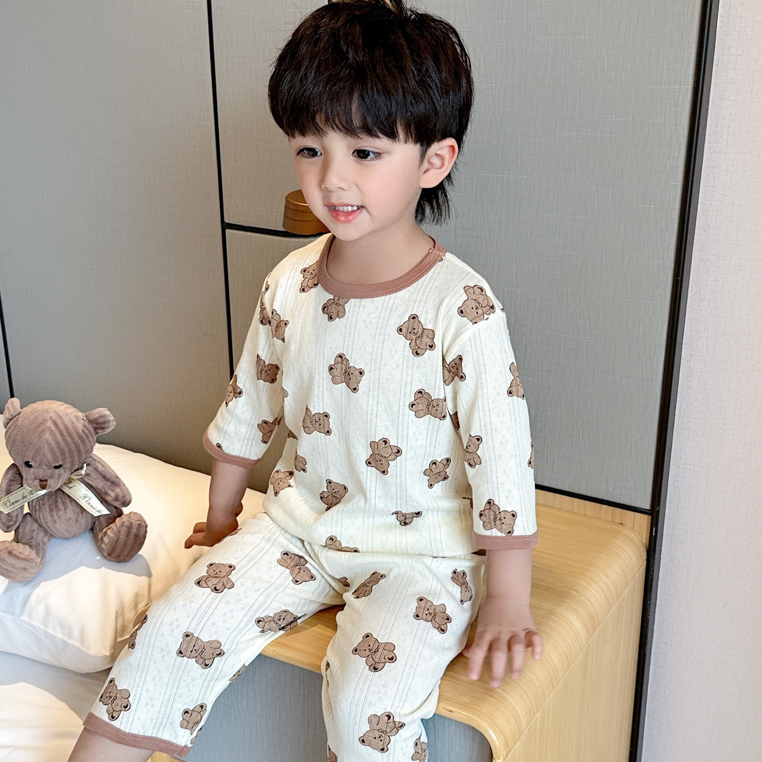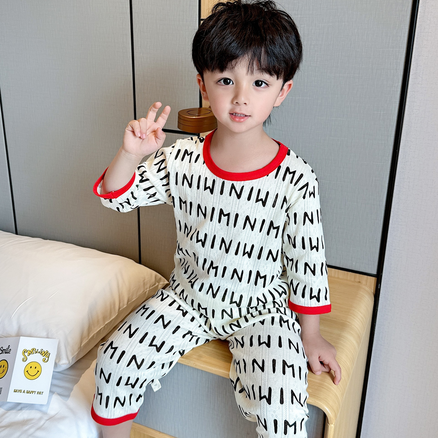 2025 새로운 어린이 잠옷 면화 여름 얇은 소년과 소녀 홈 옷 세트 7 소매 만화 에어컨 옷스토어 가기