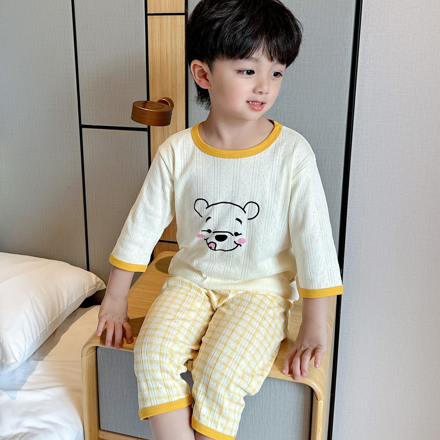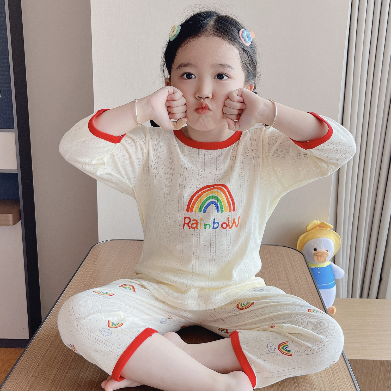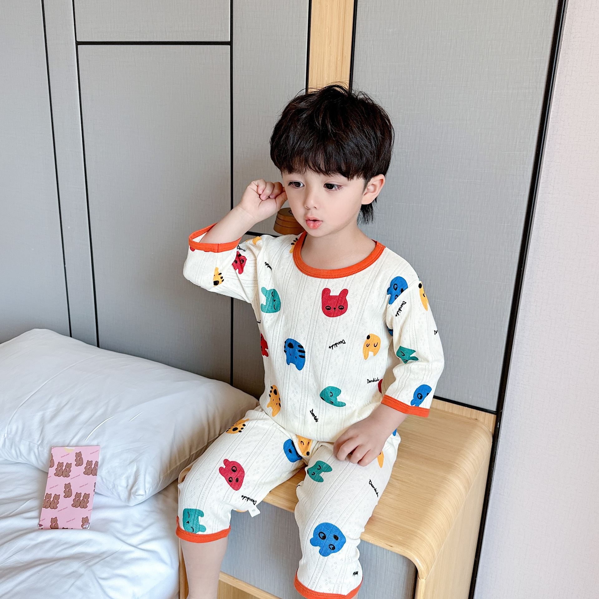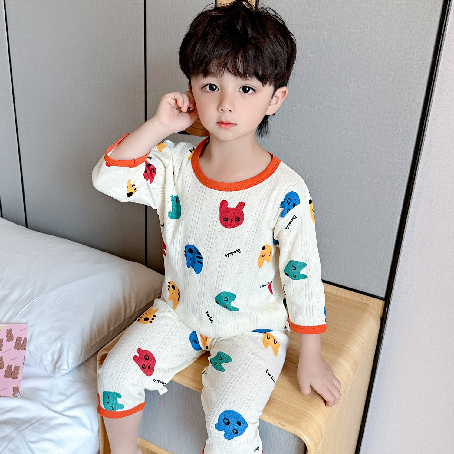 2025 새로운 어린이 잠옷 면화 여름 얇은 소년과 소녀 홈 옷 세트 7 소매 만화 에어컨 옷