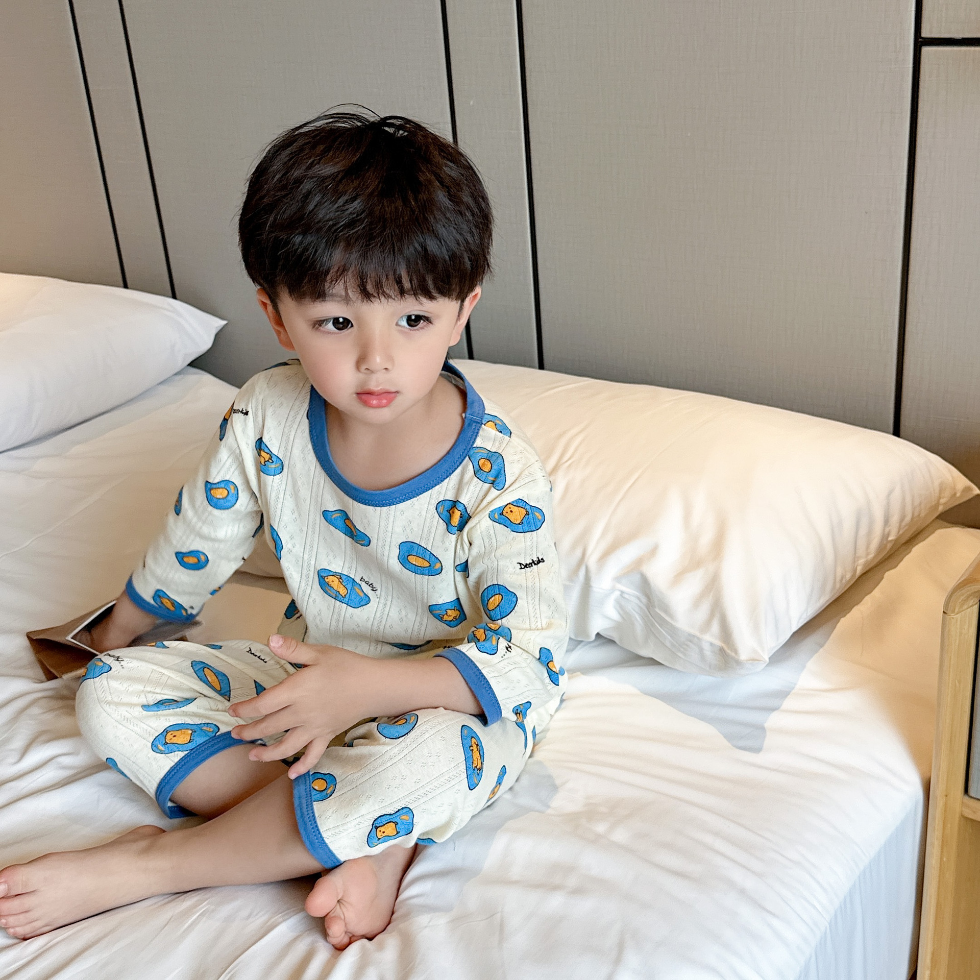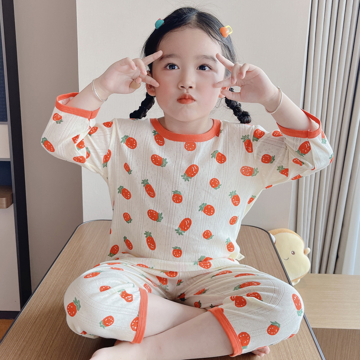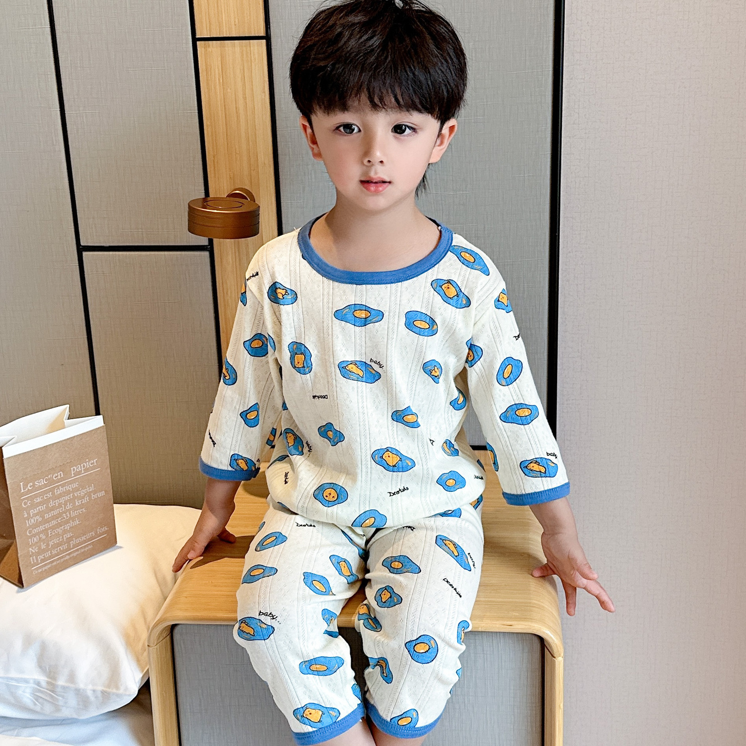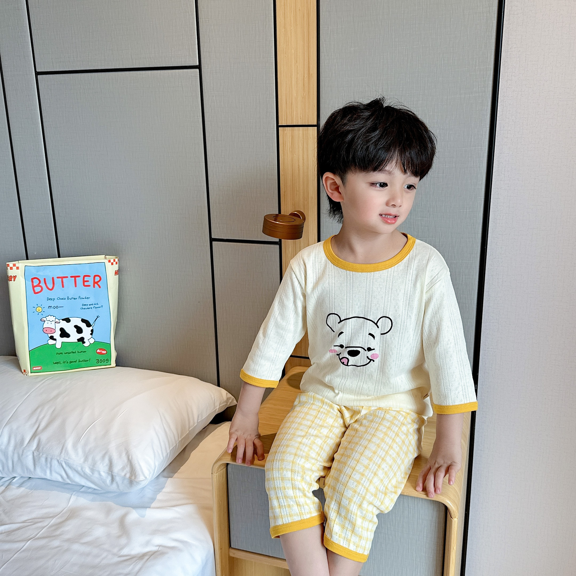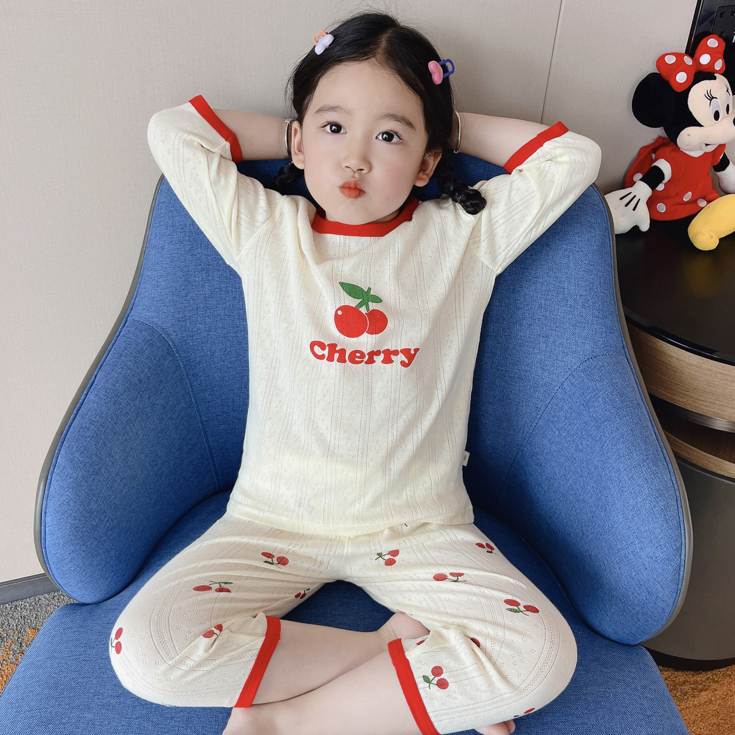 2025 새로운 어린이 잠옷 면화 여름 얇은 소년과 소녀 홈 옷 세트 7 소매 만화 에어컨 옷
