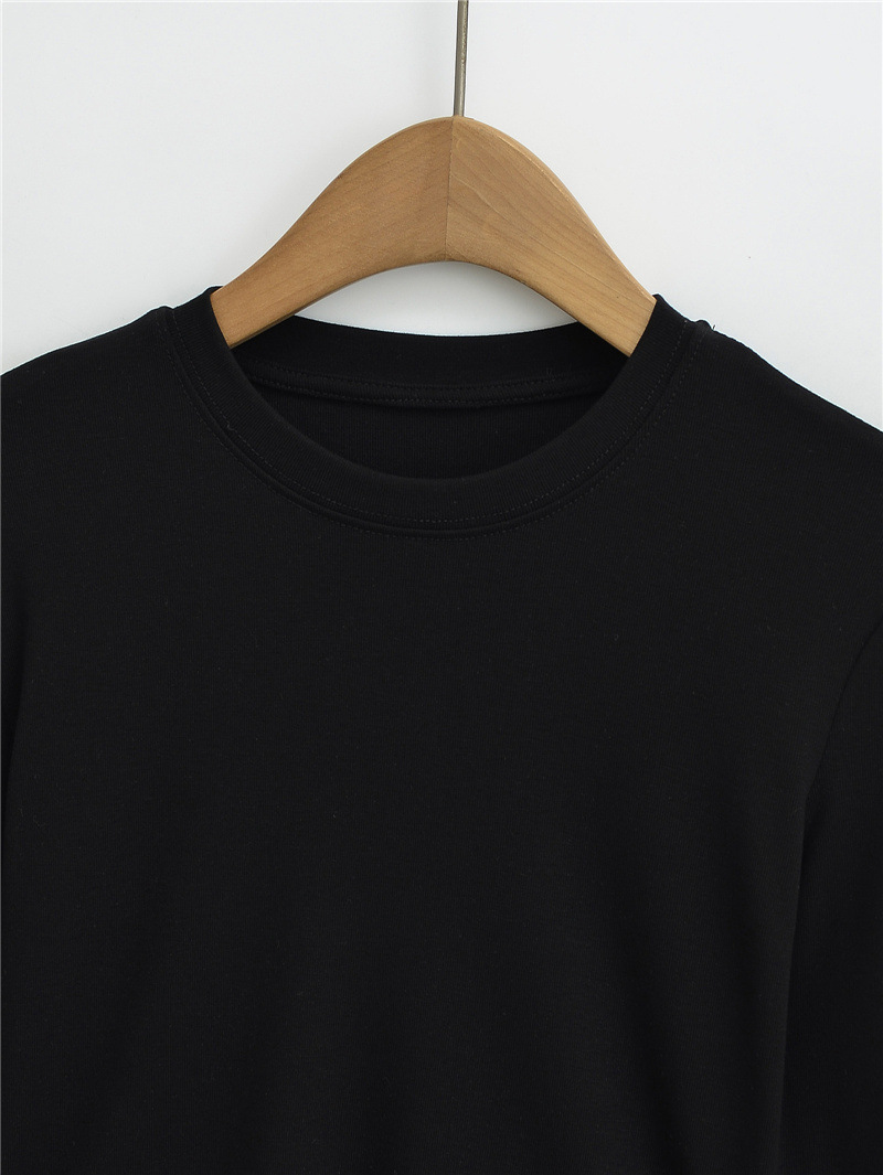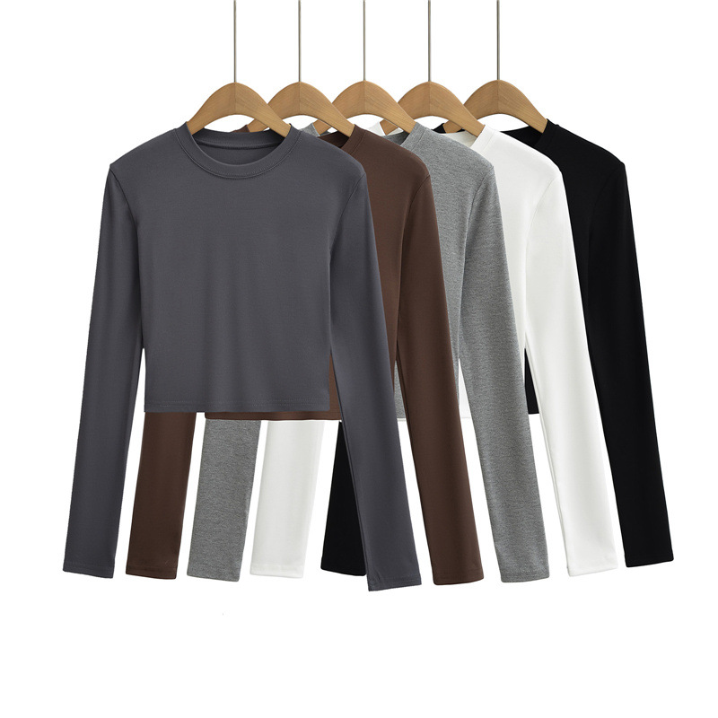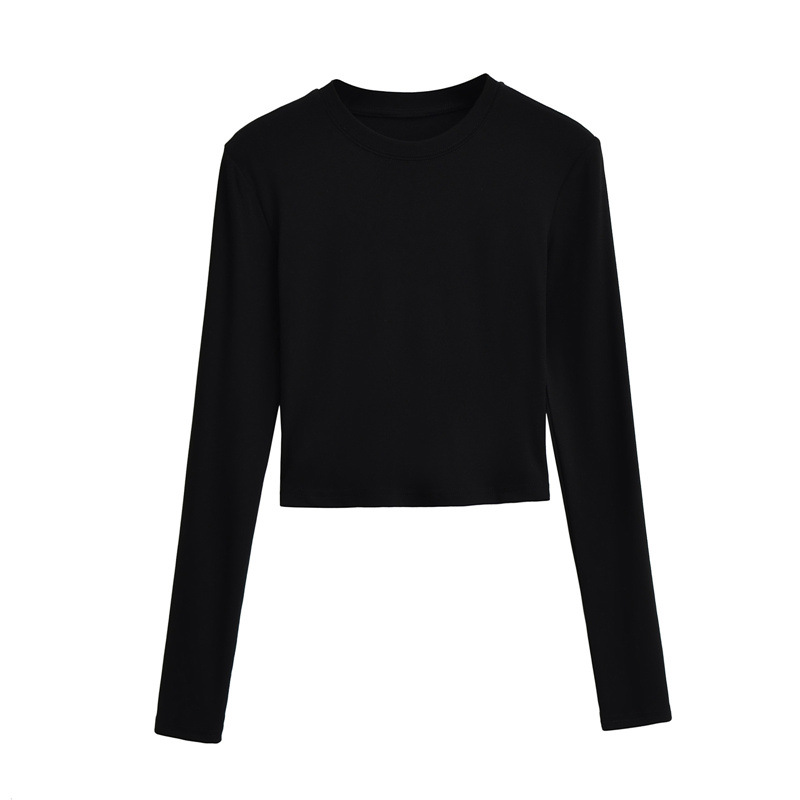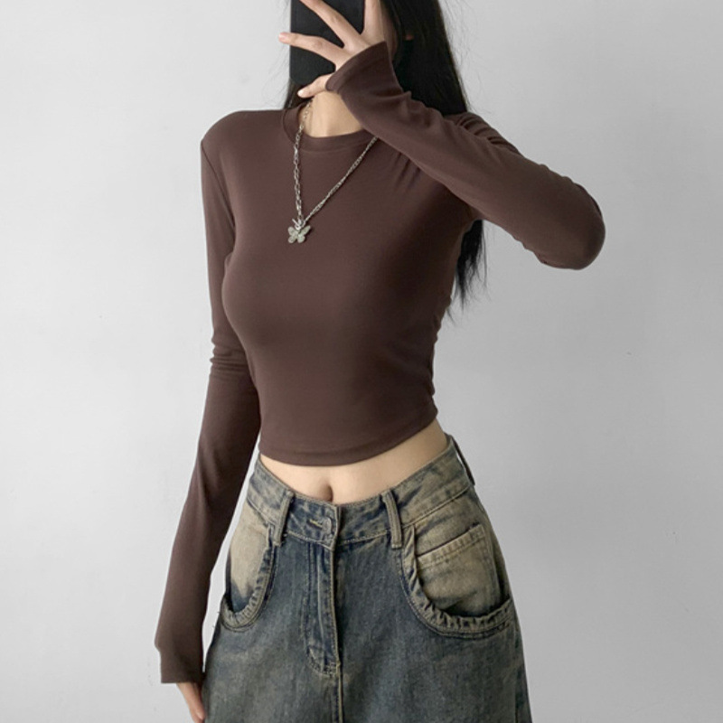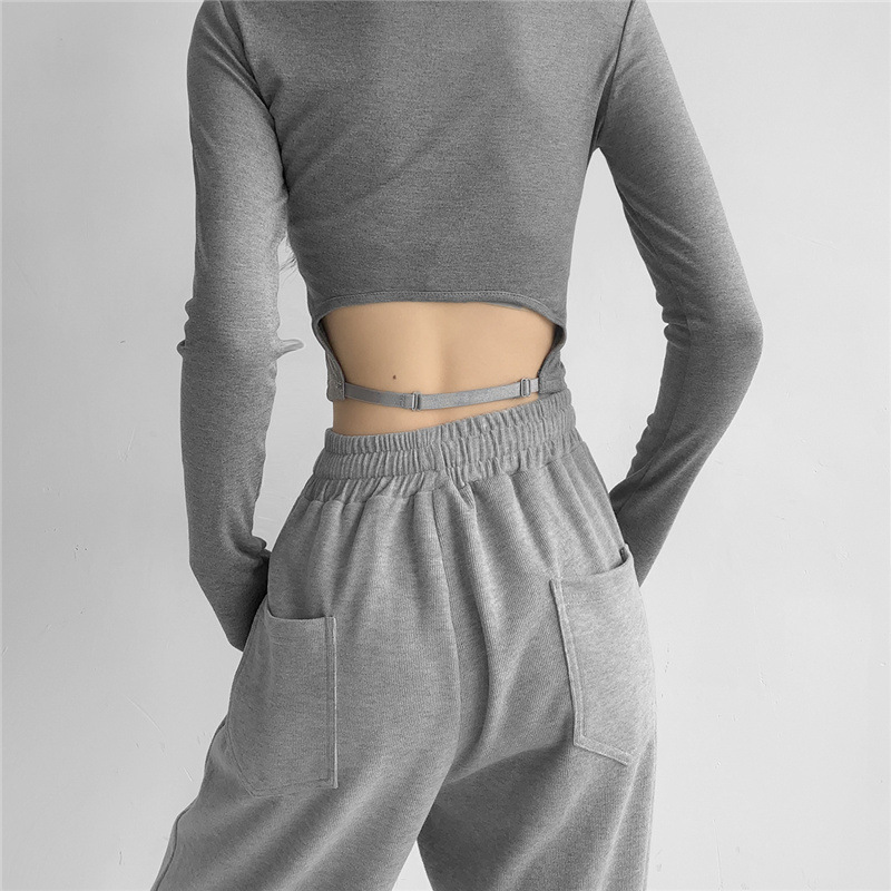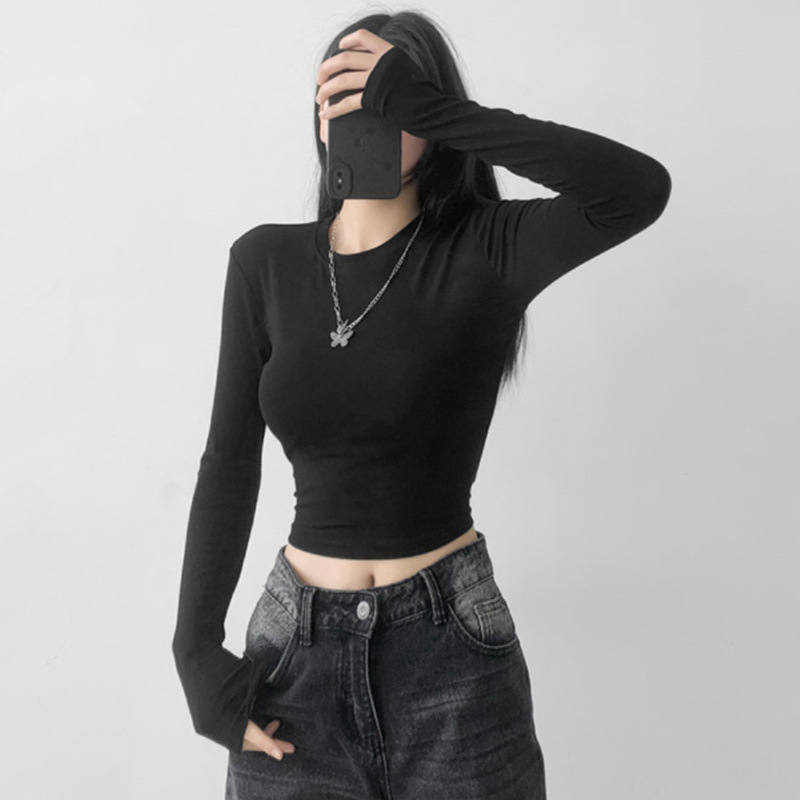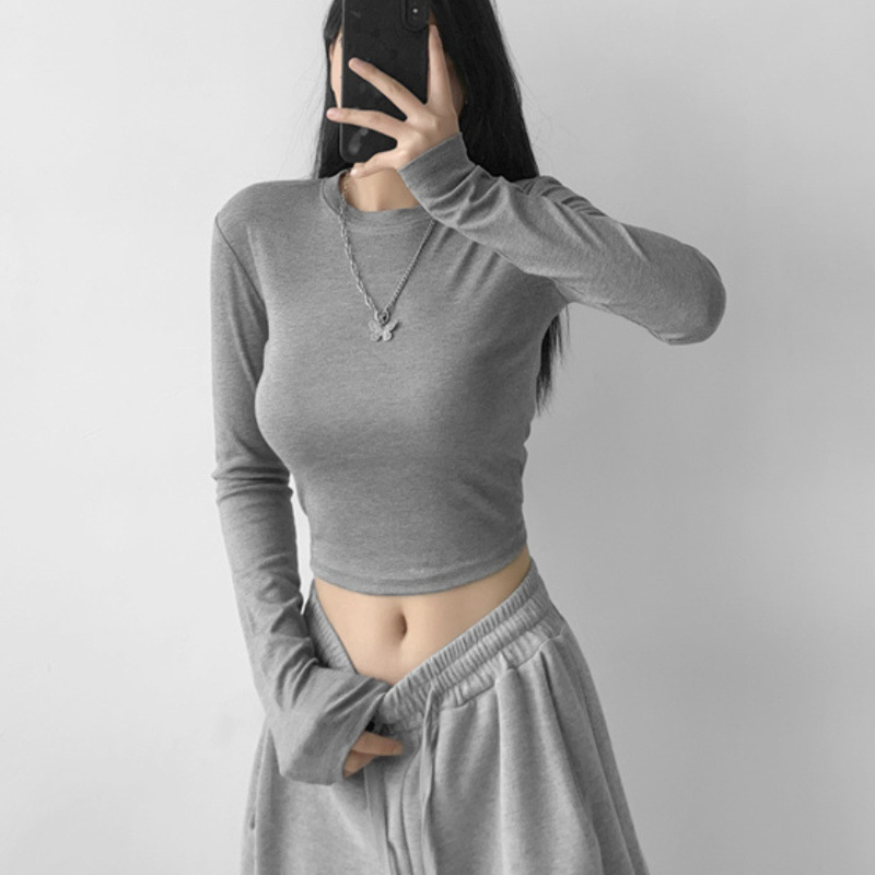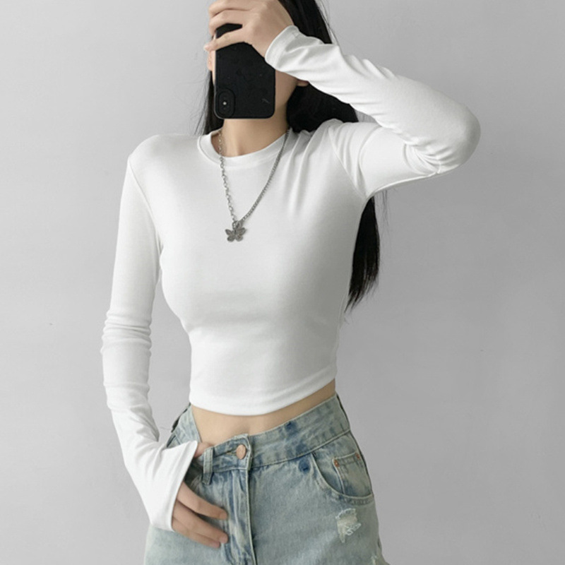 순수한 욕망 스타일 둥근 목 긴 소매 짧은 배꼽 긴 소매 티셔츠 봄 여성을위한 새로운 슬림 백리스 레이스 업 핫 걸 탑스토어 가기