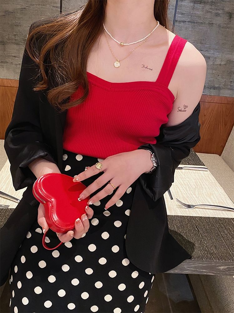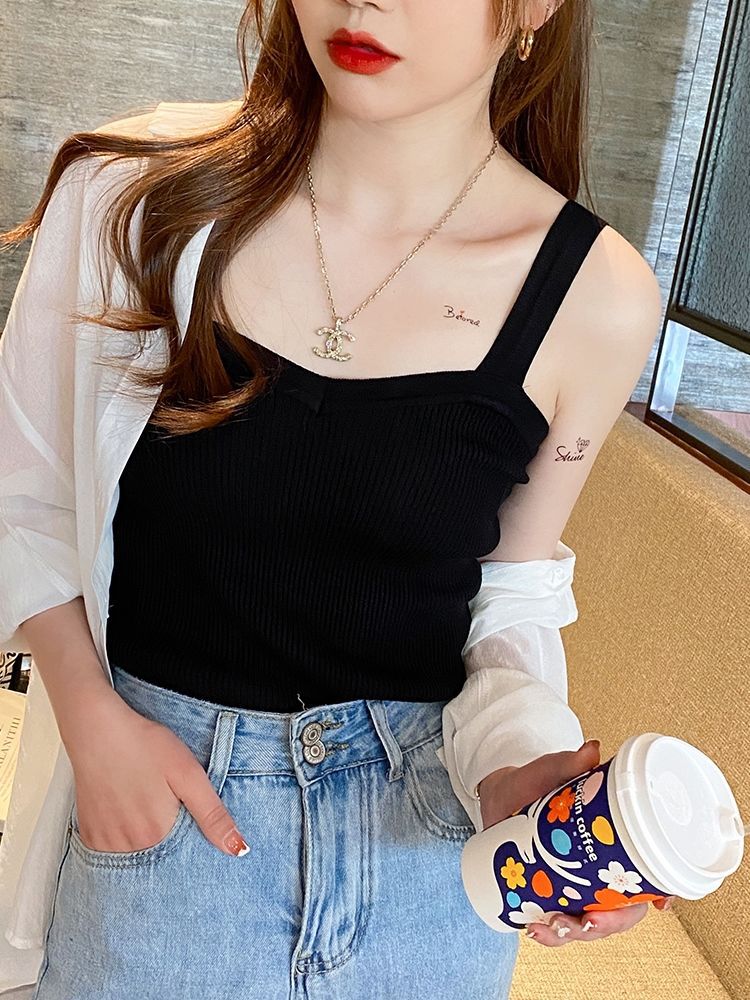 여성을위한 세트 바닥 조끼 흰색 겉옷 디자인 감각 틈새 검은 여름 탑 여성을위한 뜨거운 소녀 니트 캐미솔