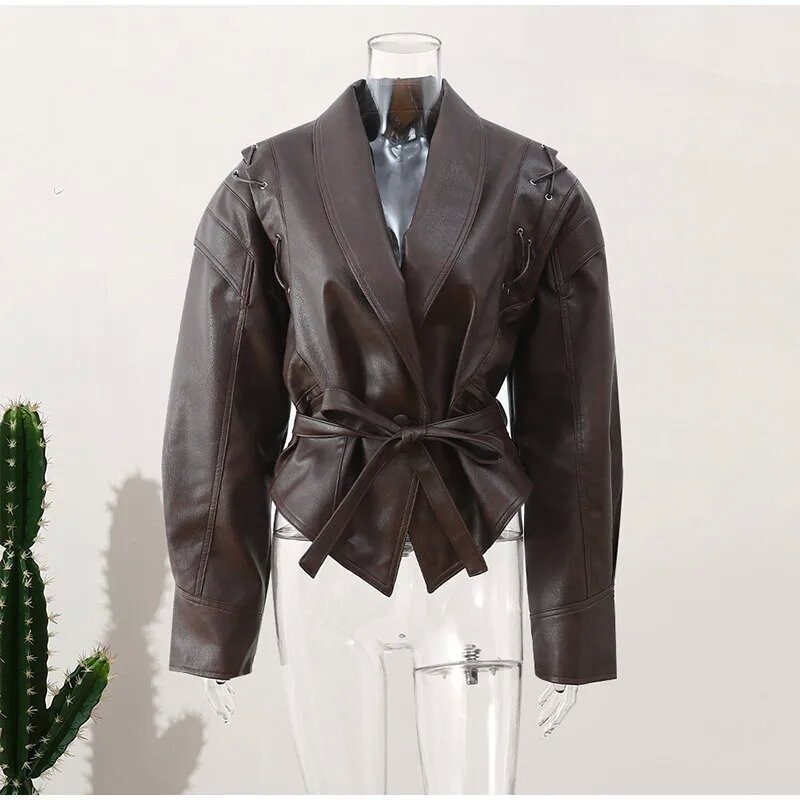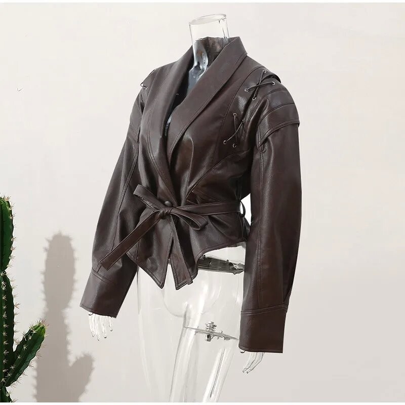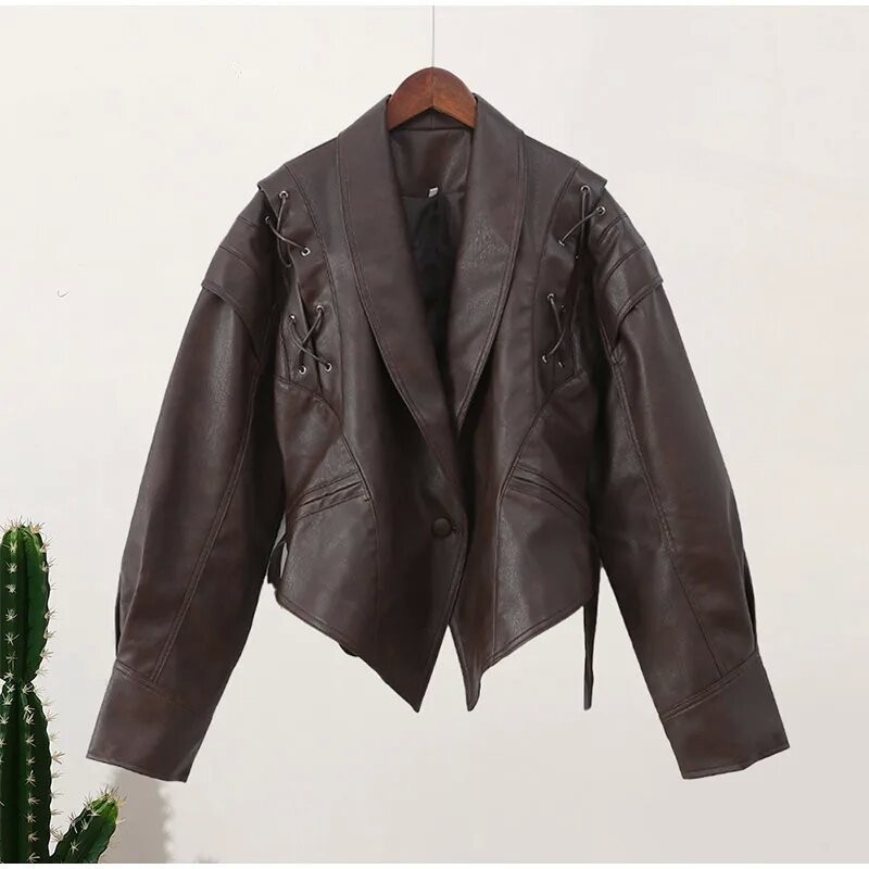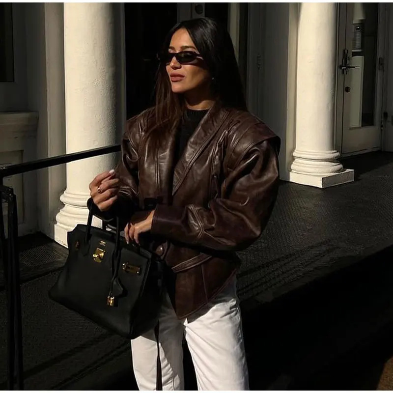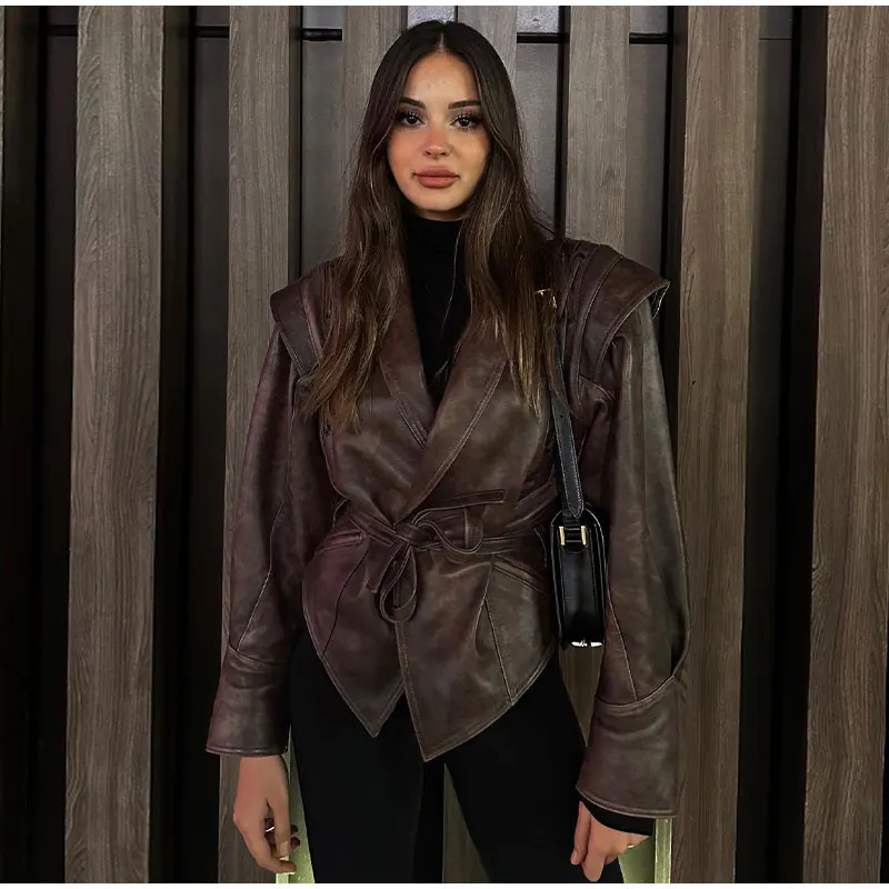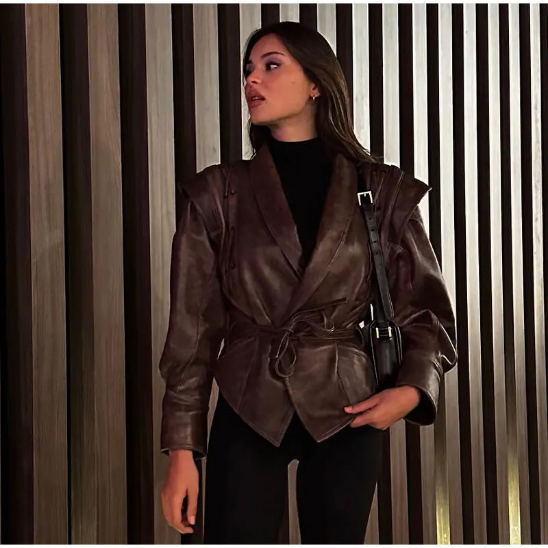 유럽과 미국의 국경 2024 봄 여성 재킷 우아한 V 넥 슬림 핏 스티칭 단색 인조 가죽 재킷 코트스토어 가기