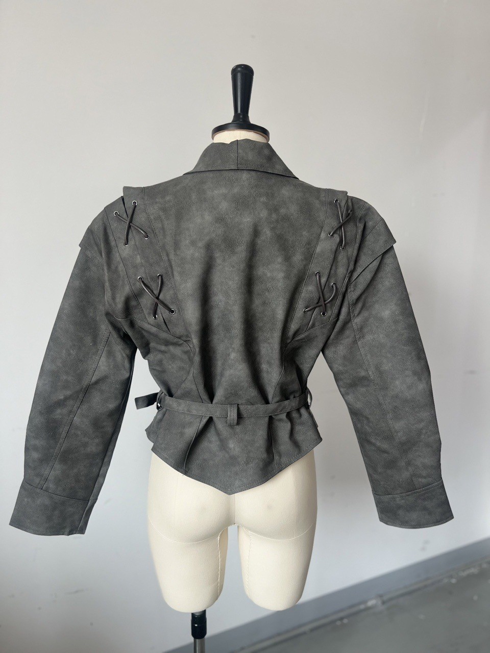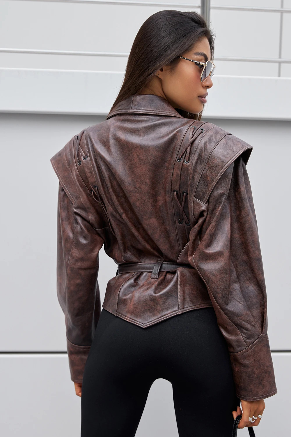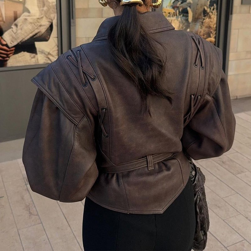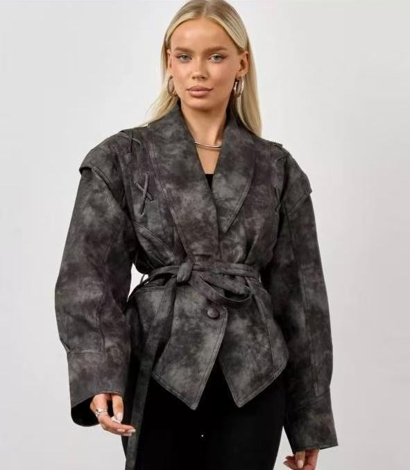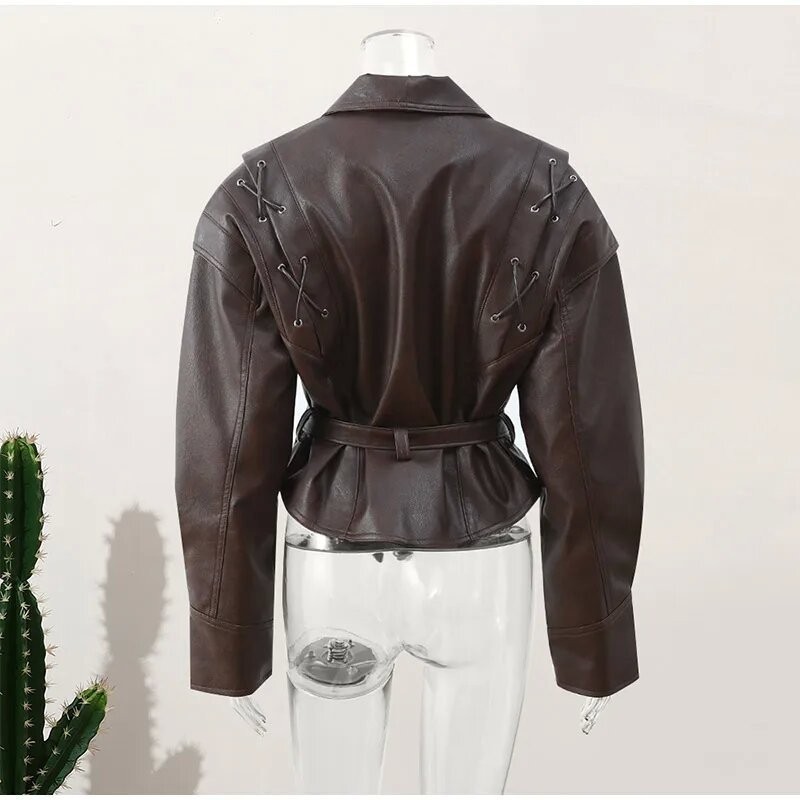유럽과 미국의 국경 2024 봄 여성 재킷 우아한 V 넥 슬림 핏 스티칭 단색 인조 가죽 재킷 코트스토어 가기