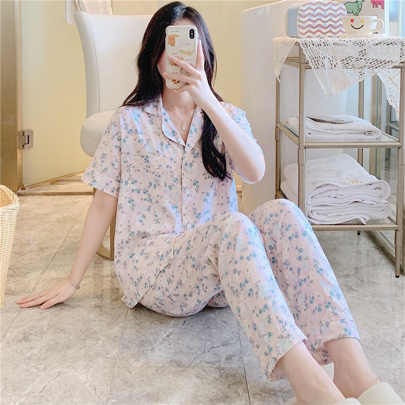 반팔면 실크 잠옷 여성 여름 얇은 야외 인공면 홈 착용 일본 카디건 인쇄 면 실크 세트스토어 가기
