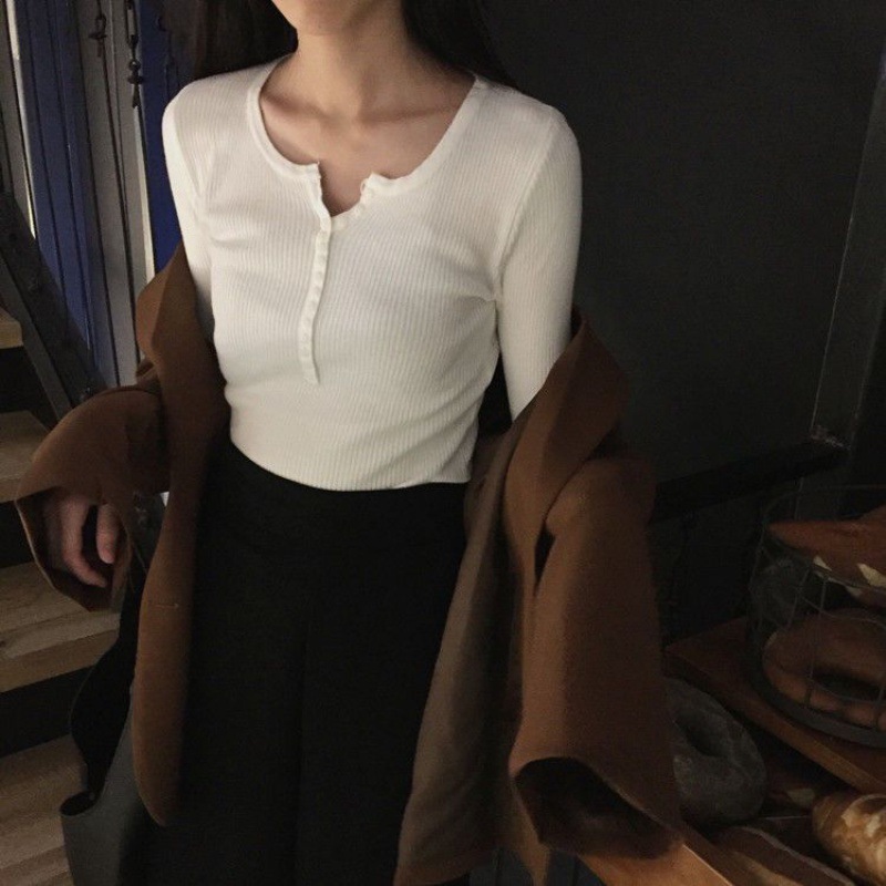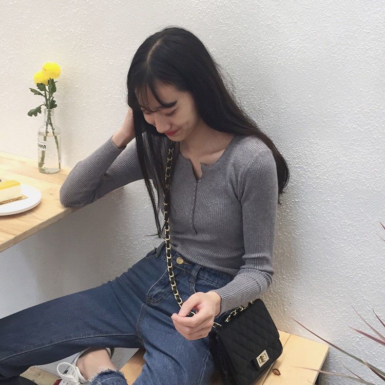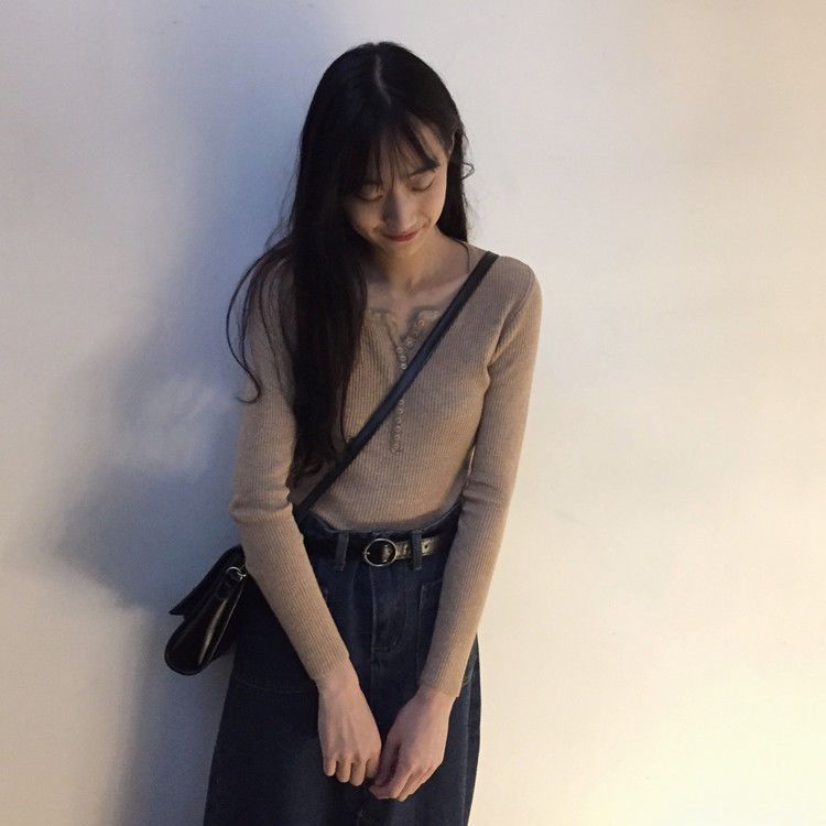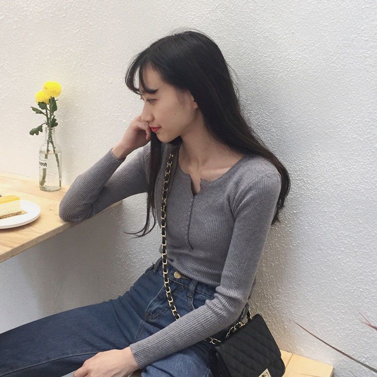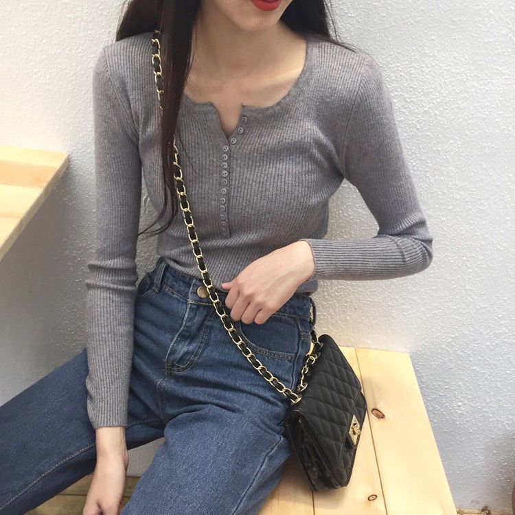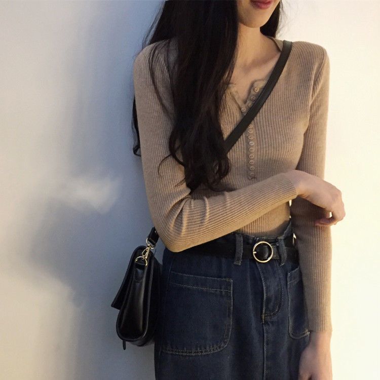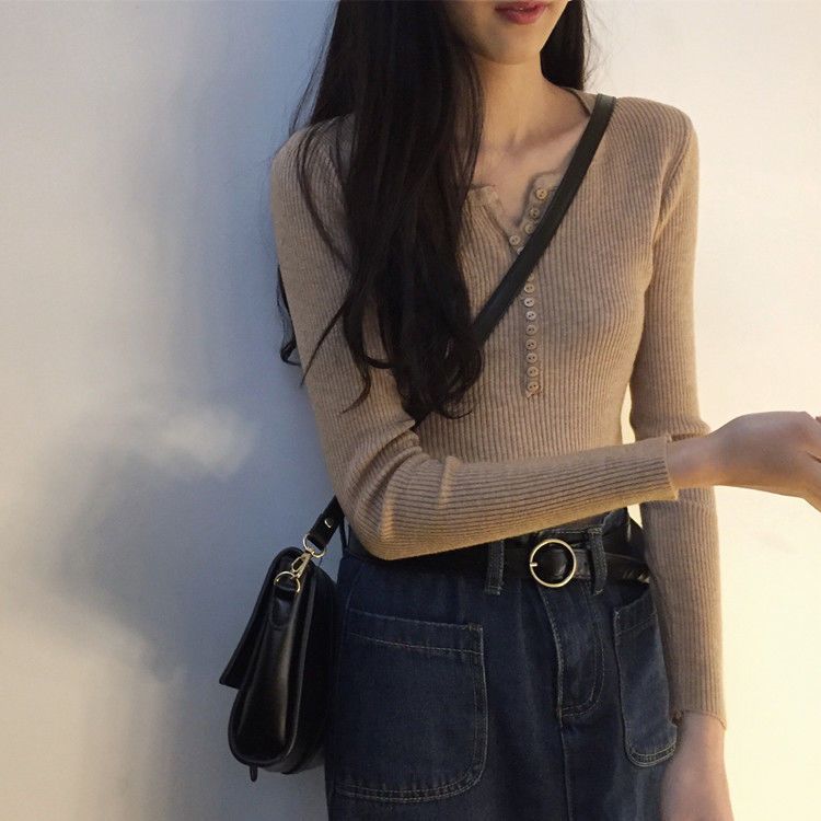 서양식 슬림 핏 슬리밍 쇄골 여성 의류가있는 올 매치 가을 뉴 브레스트 V 넥 긴팔 니트 바닥 셔츠스토어 가기