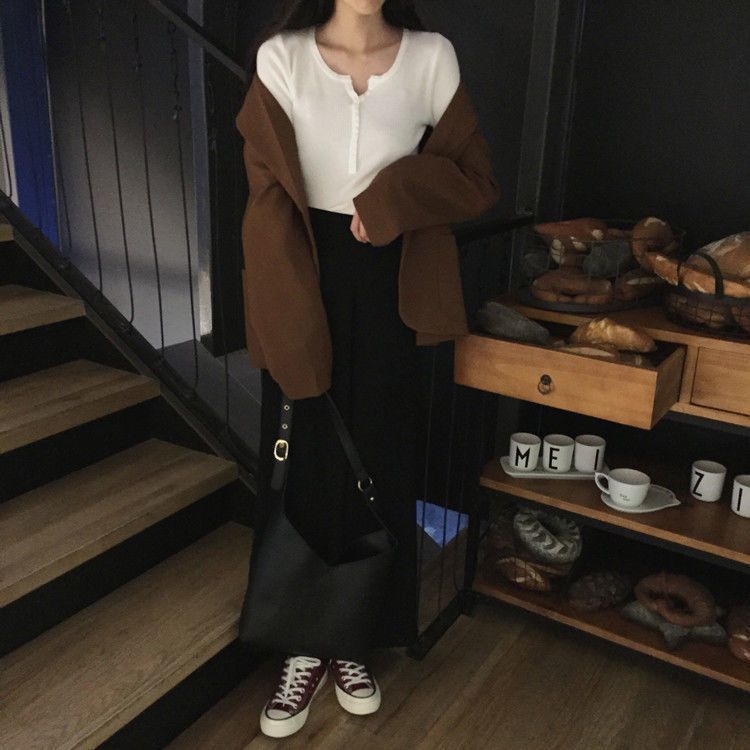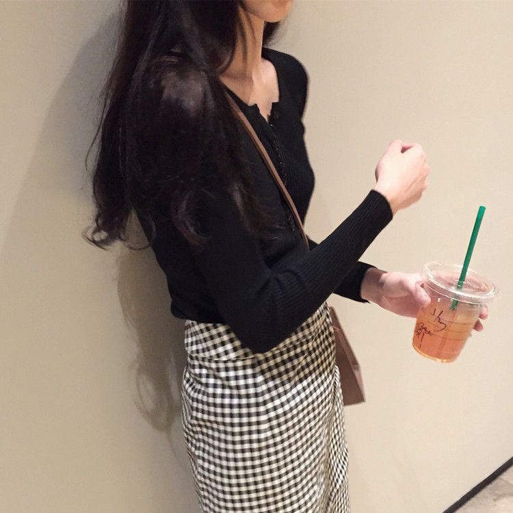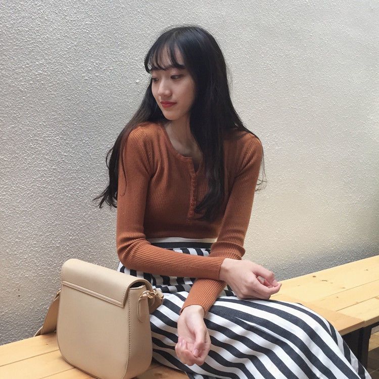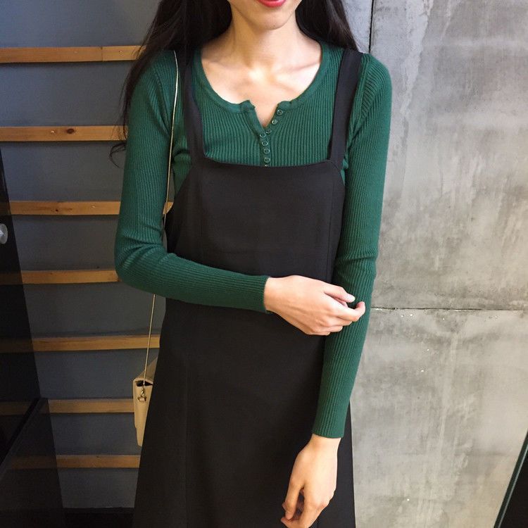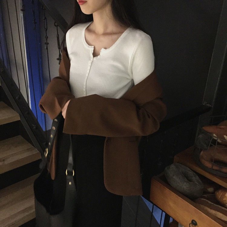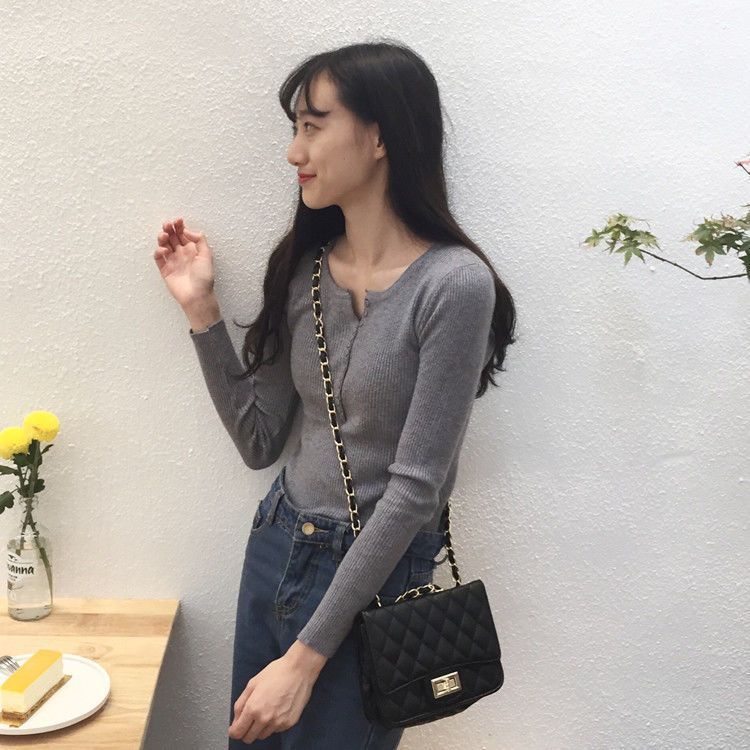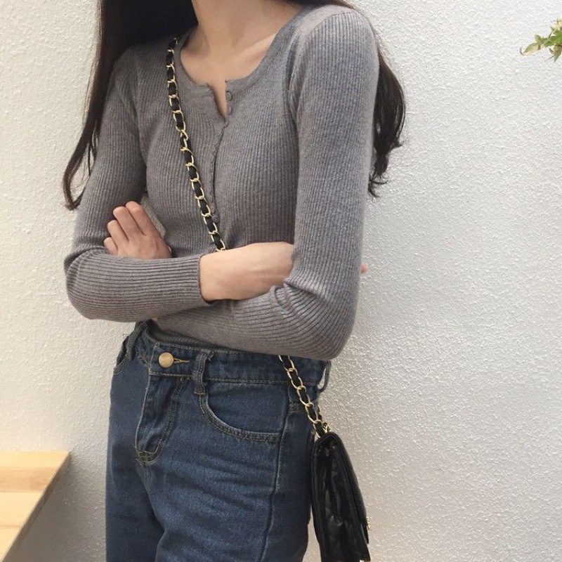 서양식 슬림 핏 슬리밍 쇄골 여성 의류가있는 올 매치 가을 뉴 브레스트 V 넥 긴팔 니트 바닥 셔츠스토어 가기