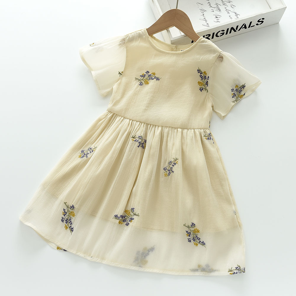 2024夏季新款 花朵绣花 女童纯棉里衬圆领短袖连衣裙