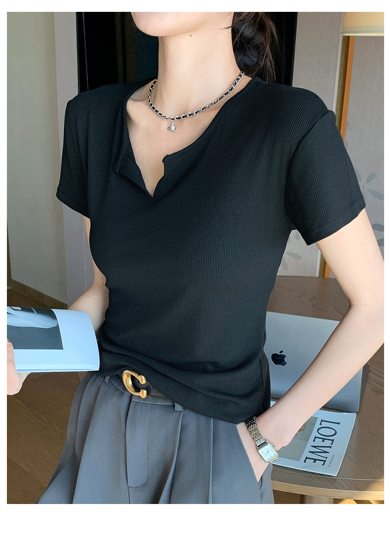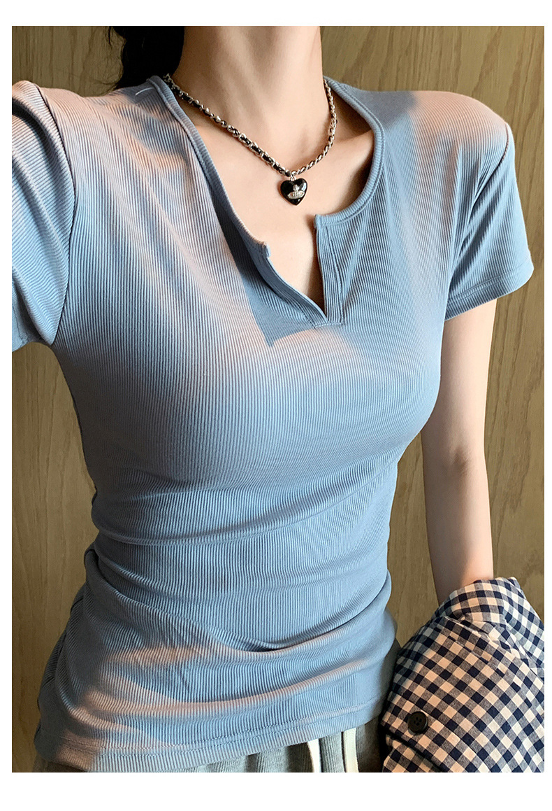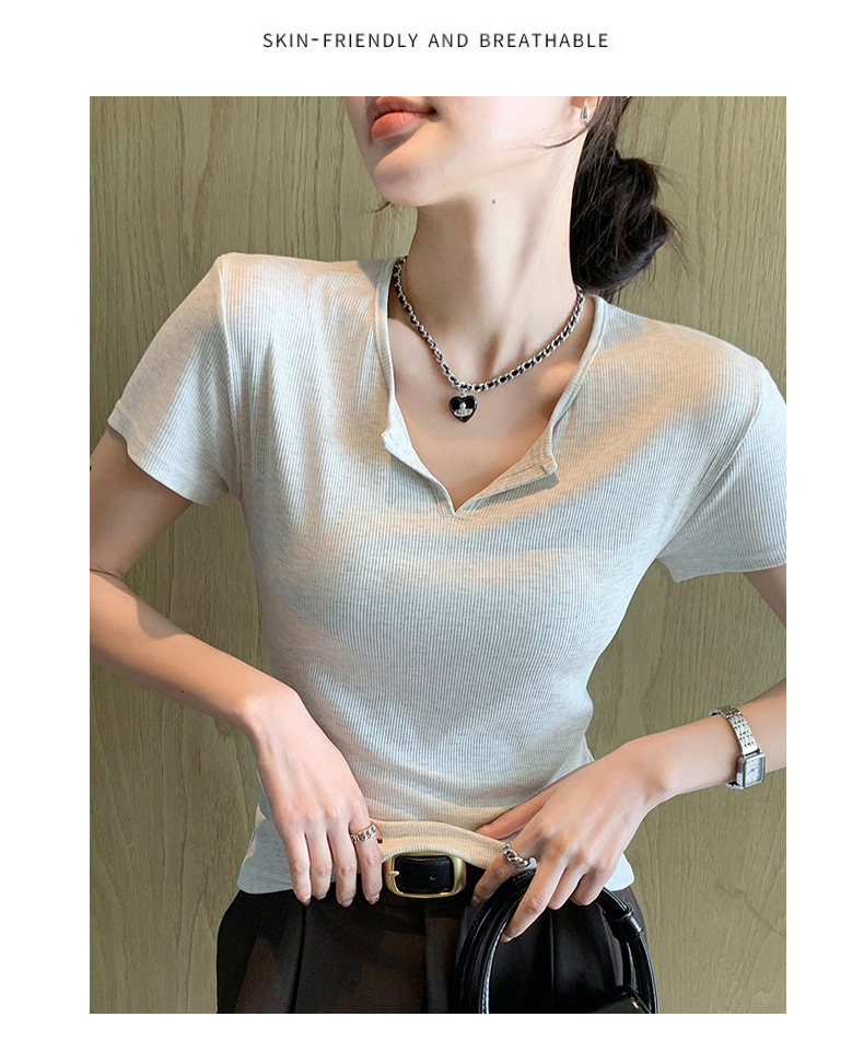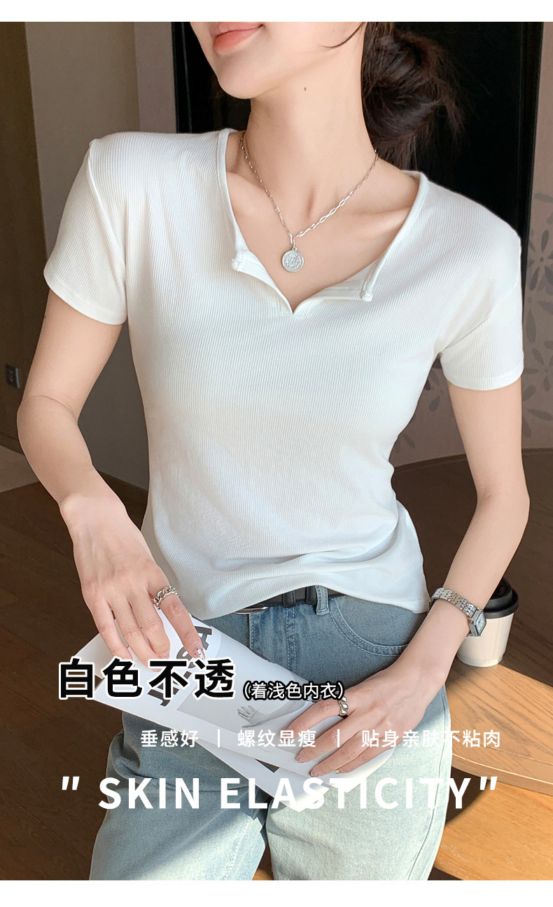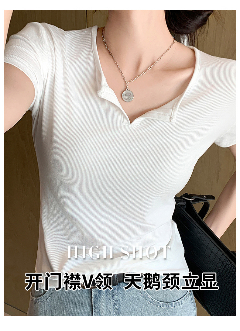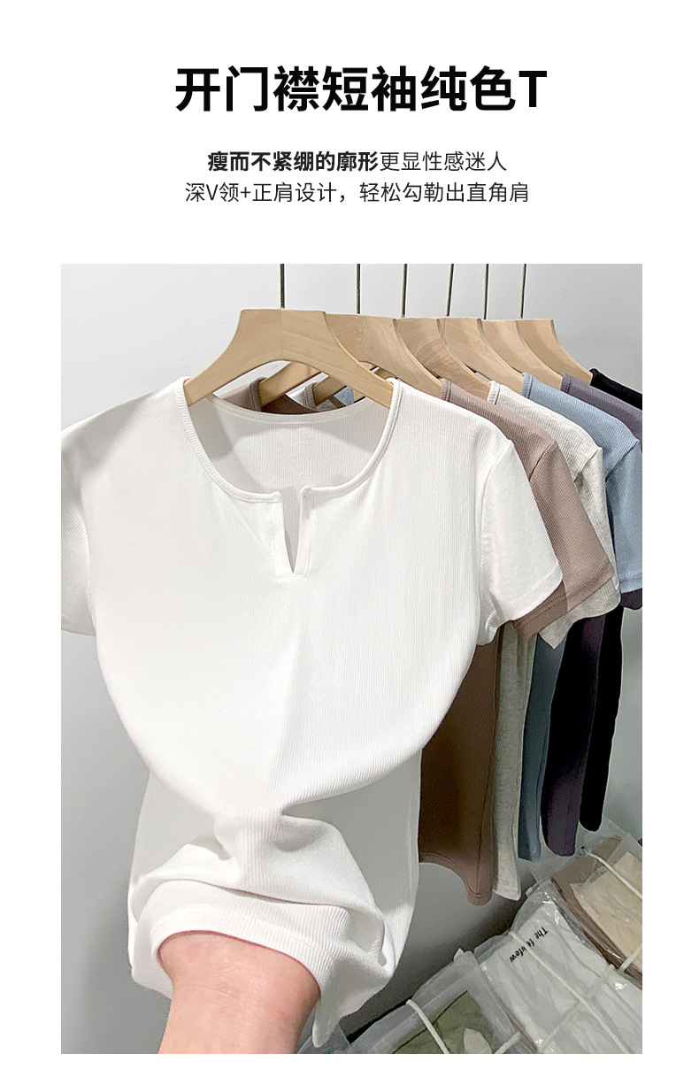 8710 여름 신작 한국 스타일 하프 오픈 칼라 슬림 반팔 티셔츠 여성 캐주얼 다용도 쇼트 탑스토어 가기