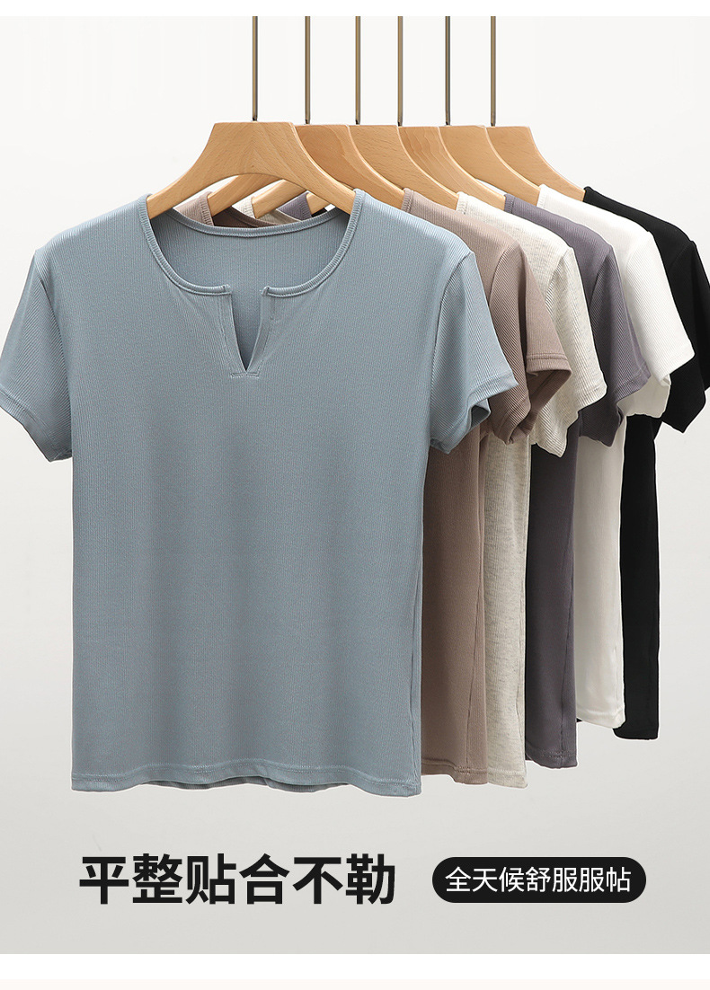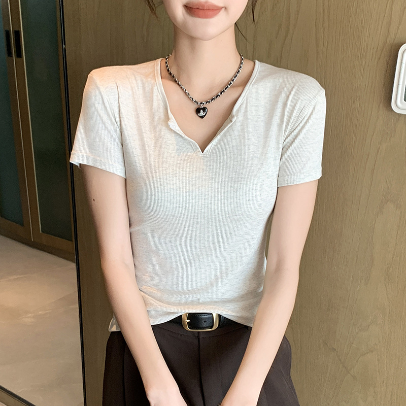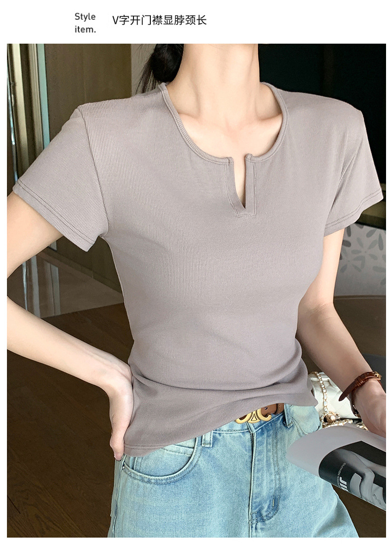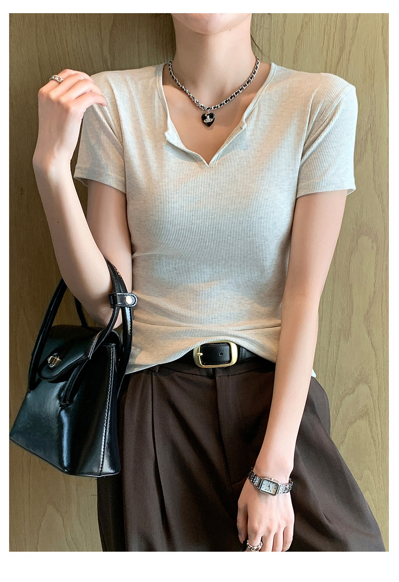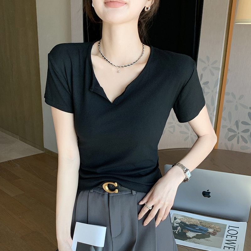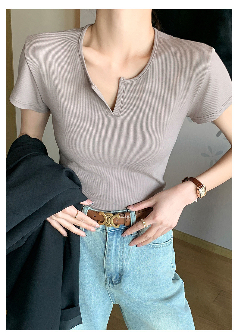 8710 여름 신작 한국 스타일 하프 오픈 칼라 슬림 반팔 티셔츠 여성 캐주얼 다용도 쇼트 탑스토어 가기