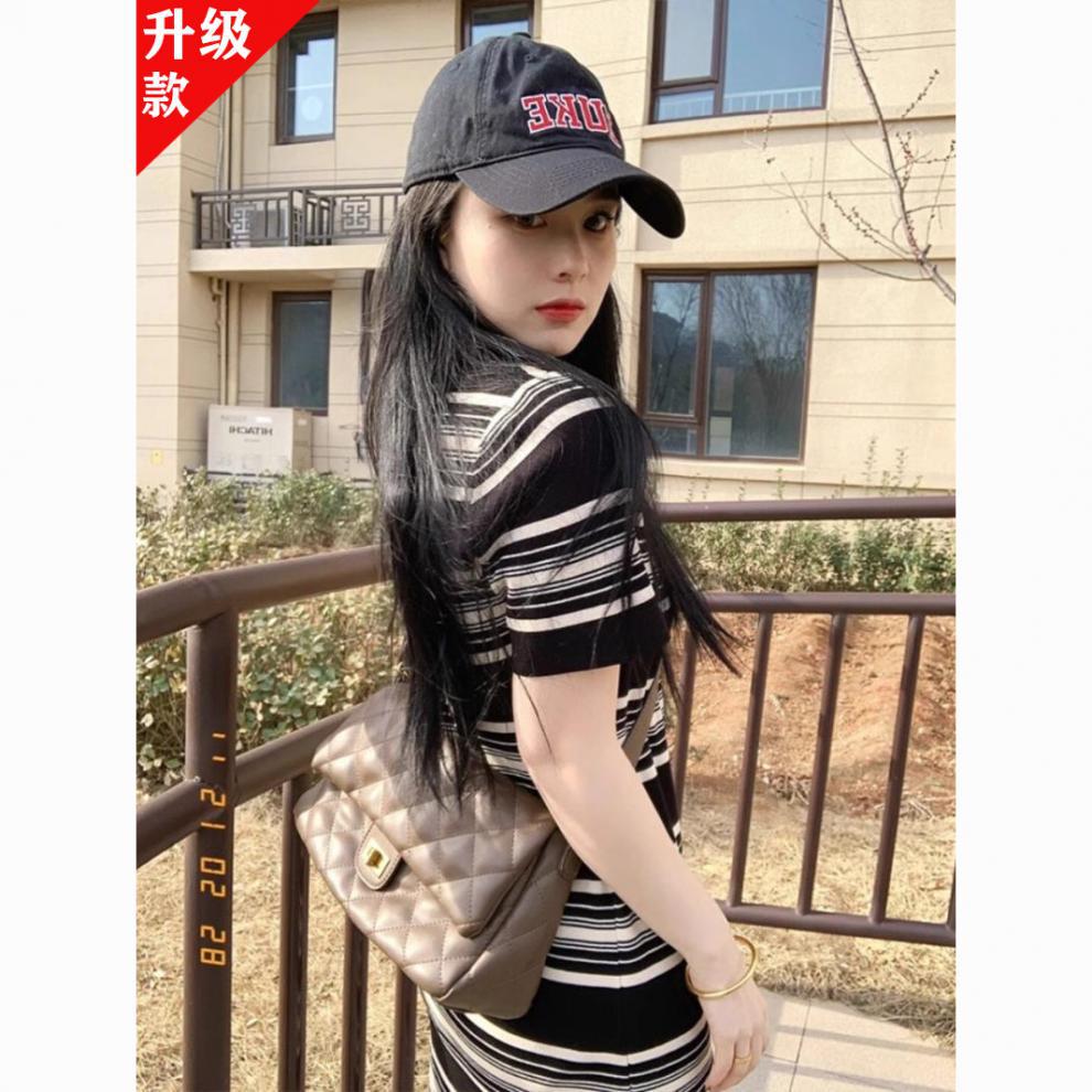 스트라이프 짧은 소매 니트 원피스 새로운 한국 스타일 게으른 캐주얼 스타일 중간 길이 미디 원피스