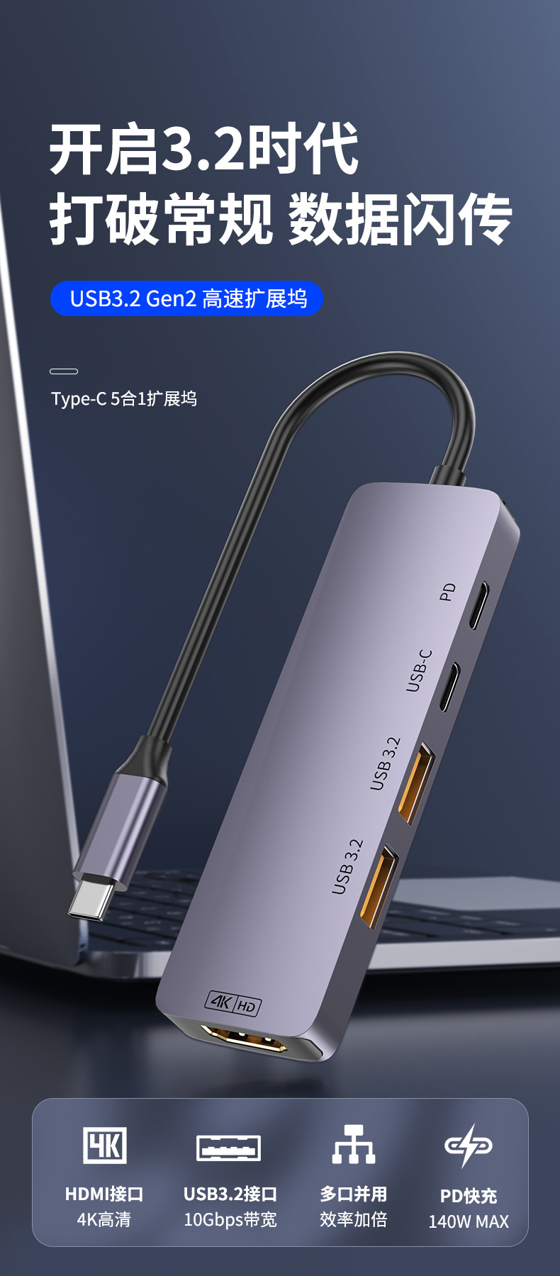 동관 디지털 타입즈 허브 USB3.2 확장 도크 HUB10G 분배기 HDMI4K 다중 인터페이스스토어 가기