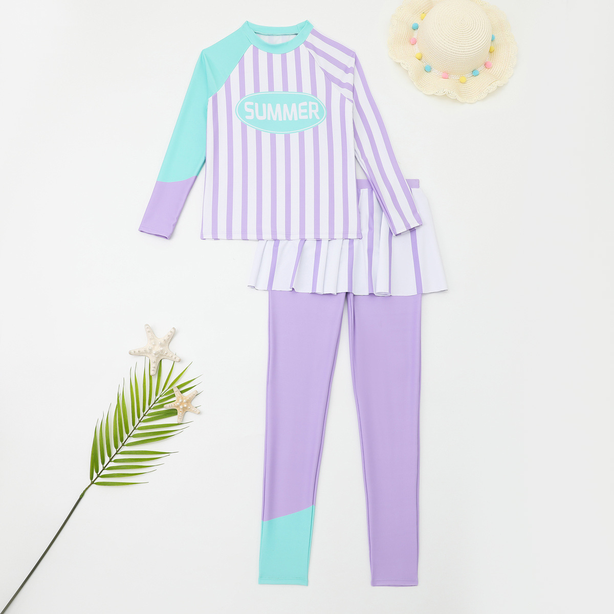 어린이 수영복 긴팔 바지 여자 수영복 2024 새 줄무늬 짧은 치마 스플릿 투피스 수영복