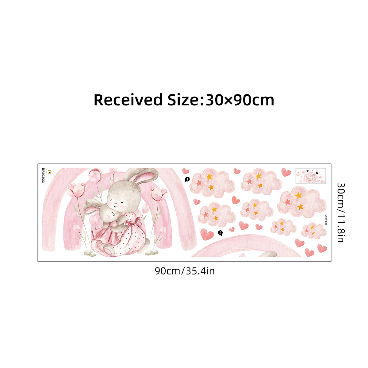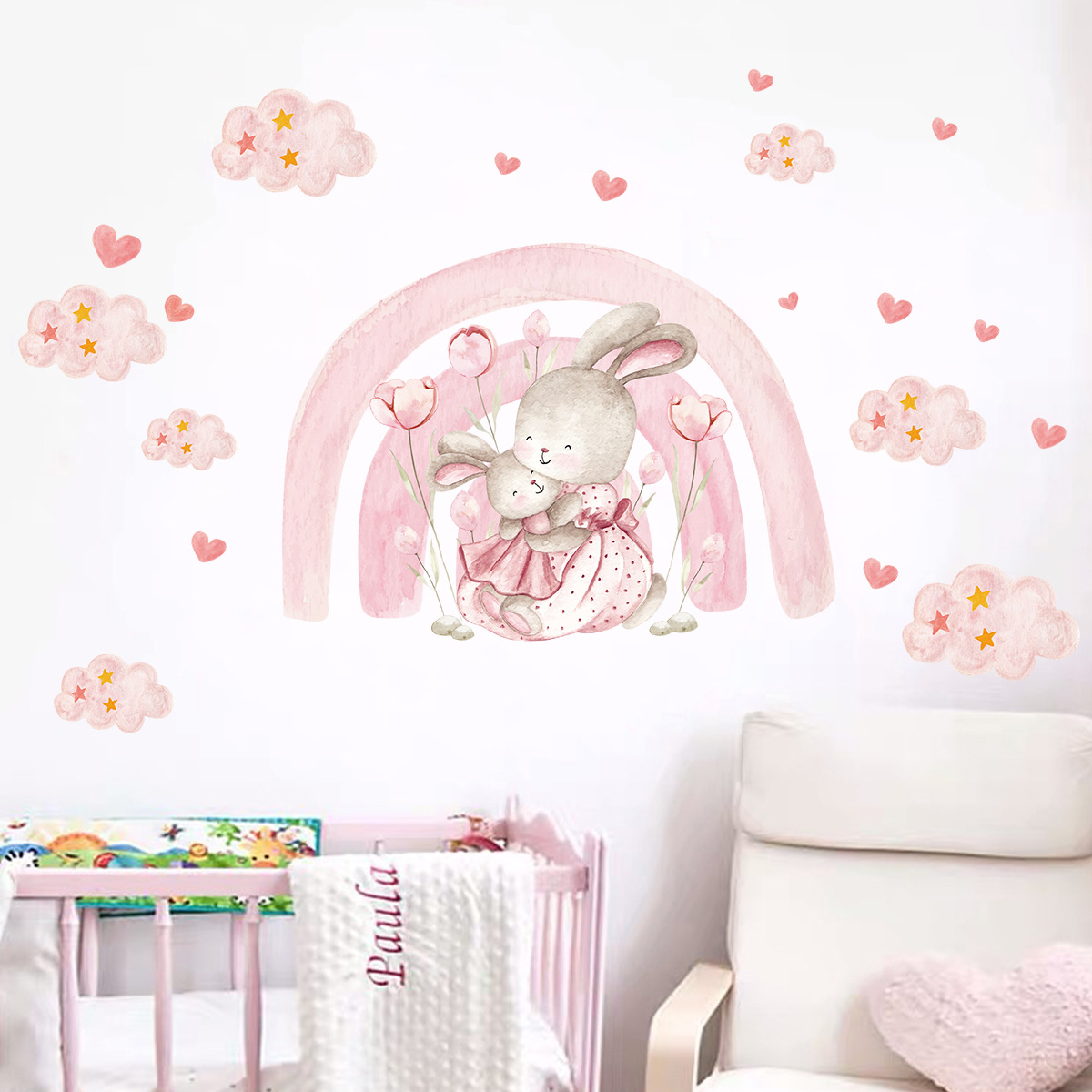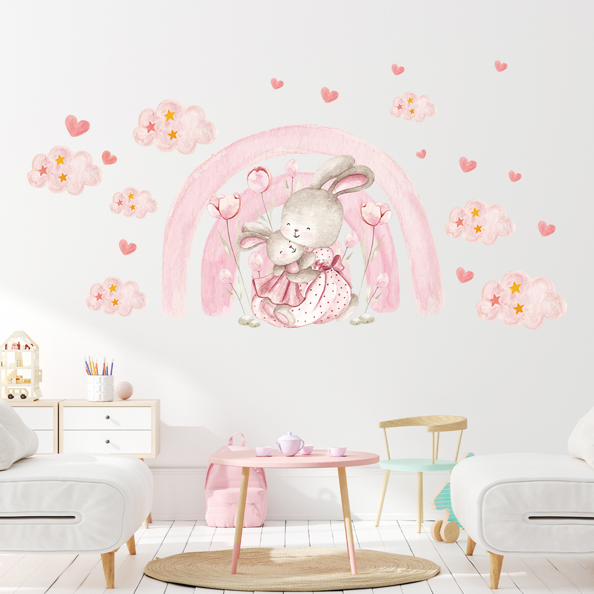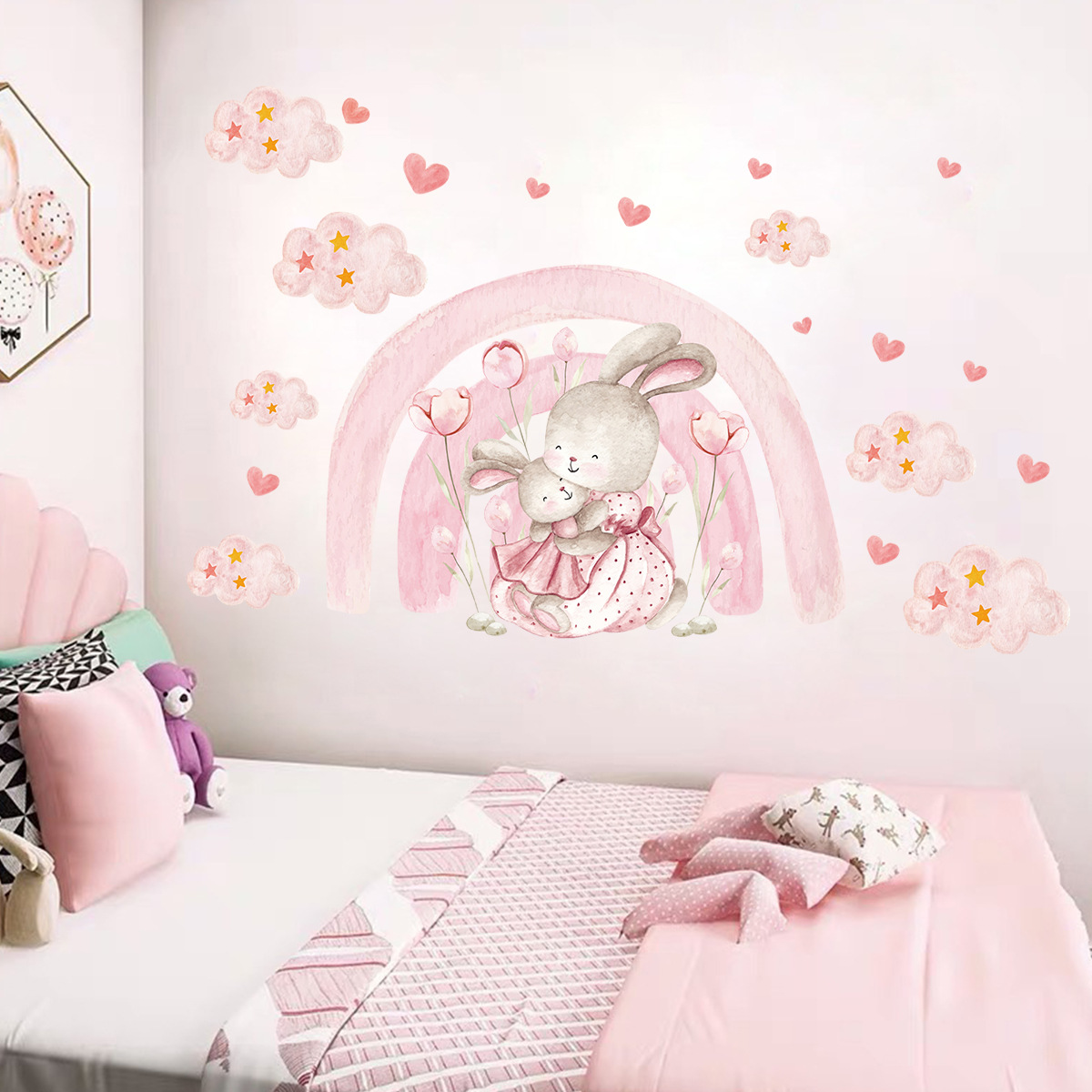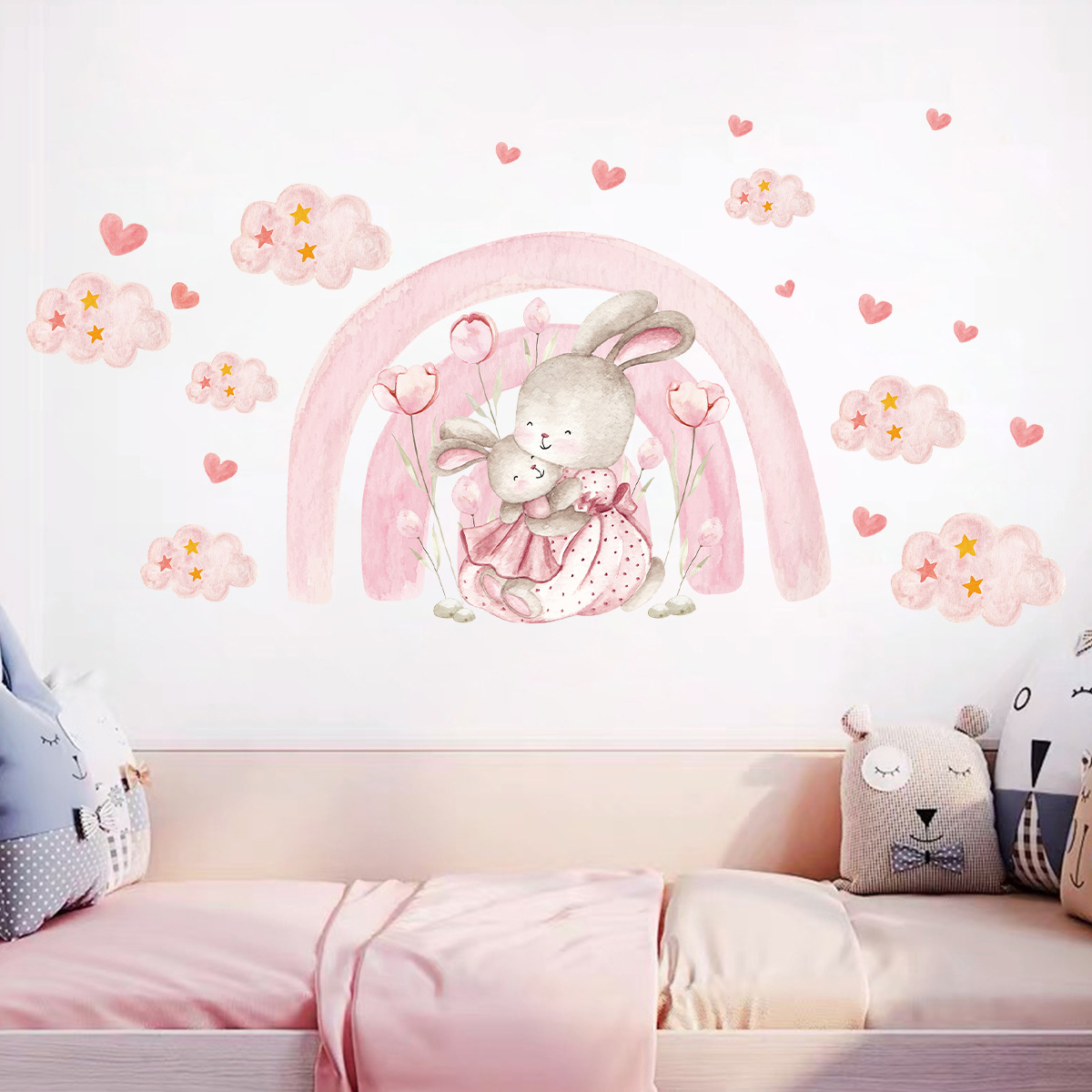만화 귀여운 핑크 소녀 스타일 토끼 자체 접착 벽 스티커 어린이 방 유치원 장식 스티커 BR93923