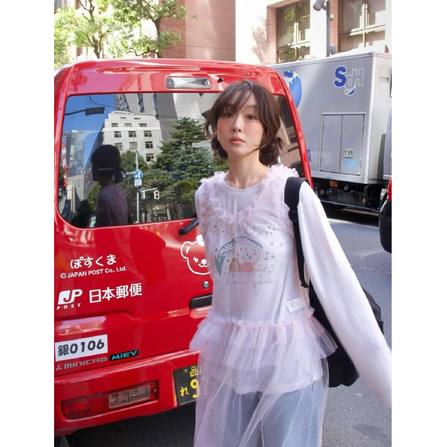 지금 2024 봄과 여름 새로운 한국 디자이너 달콤한 크루 넥 레이스 관점 조끼 고삐 거즈 스커트
