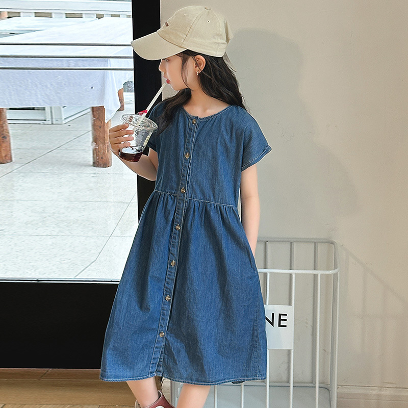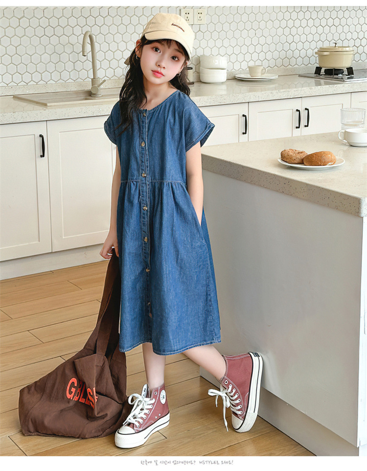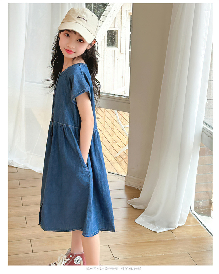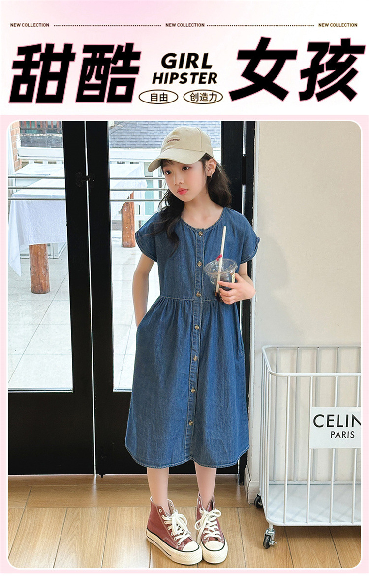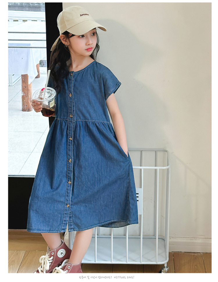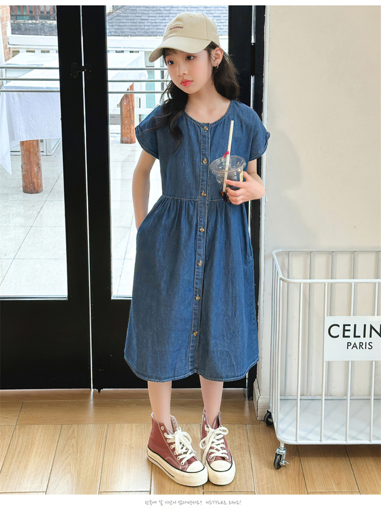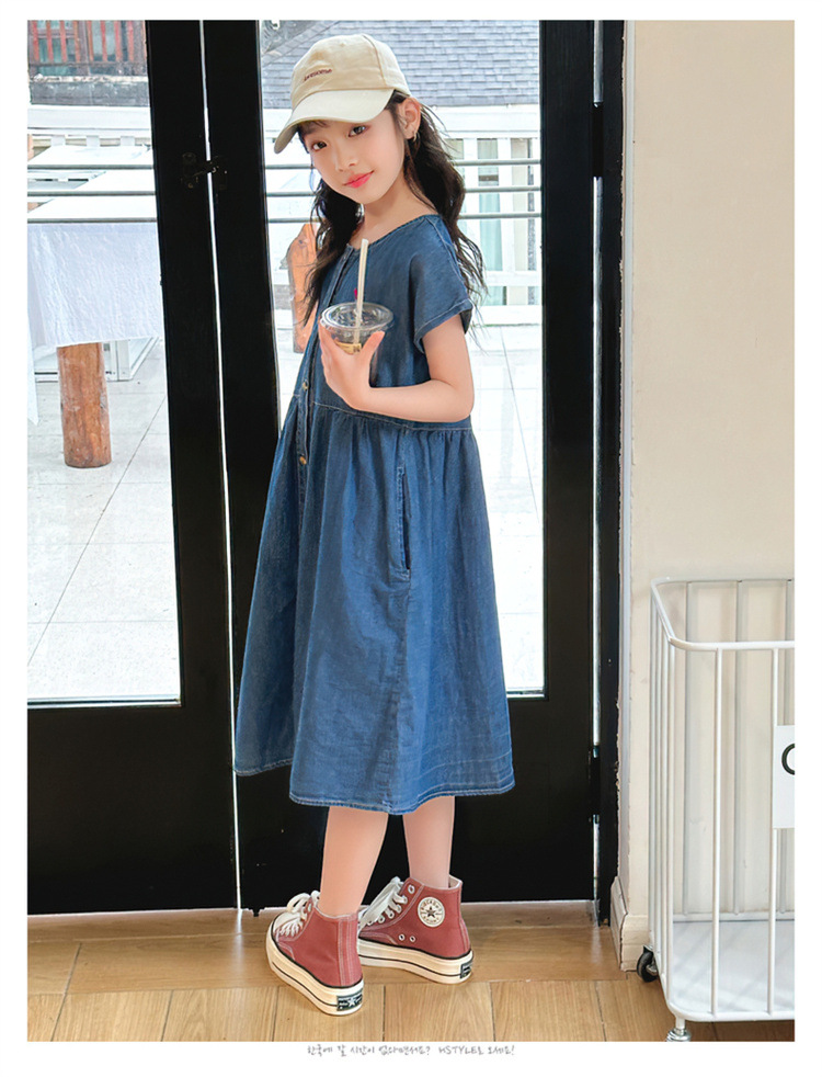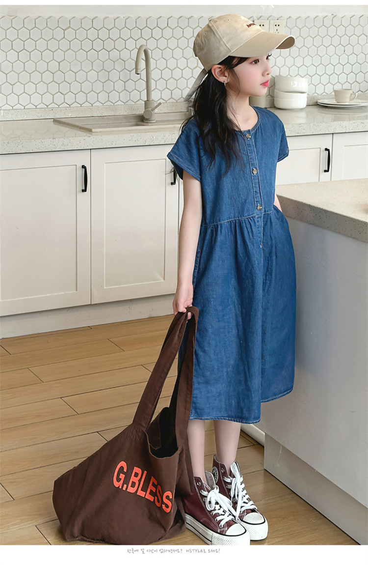 2024 여름 새로운 소녀 서양식 데님 원피스 한국식 어린이 유행 긴 원피스 중형 및 큰 어린이 공주 원피스스토어 가기