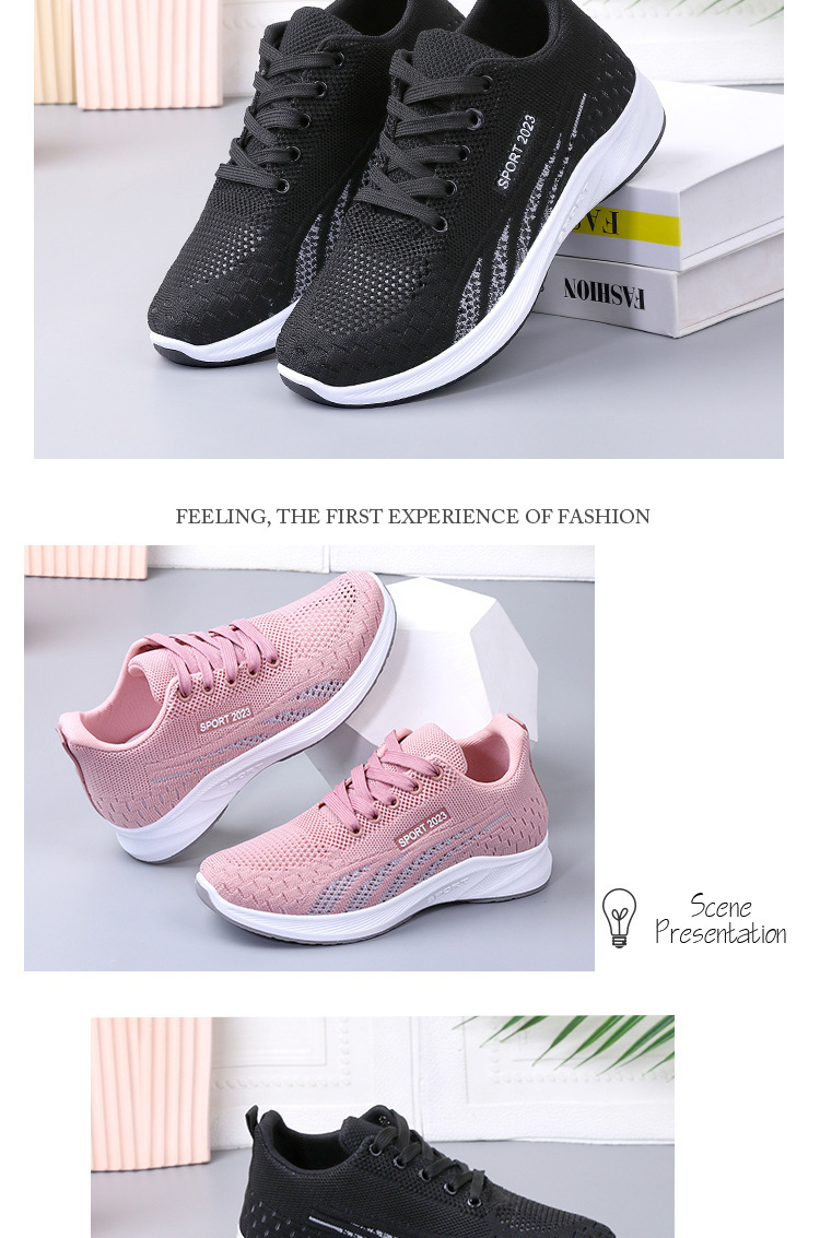 2024 봄과 가을 새로운 평면 바닥 플라이 짠 메쉬 스니커즈 여성 대외 무역 캐주얼 부드러운 바닥 조명 달리기 여성 신발 도매스토어 가기