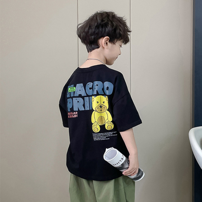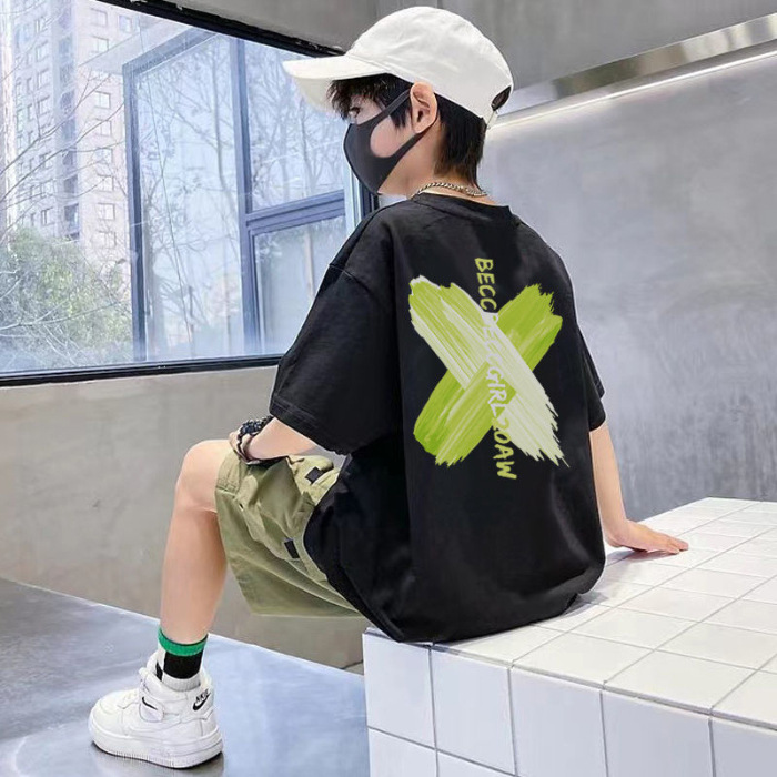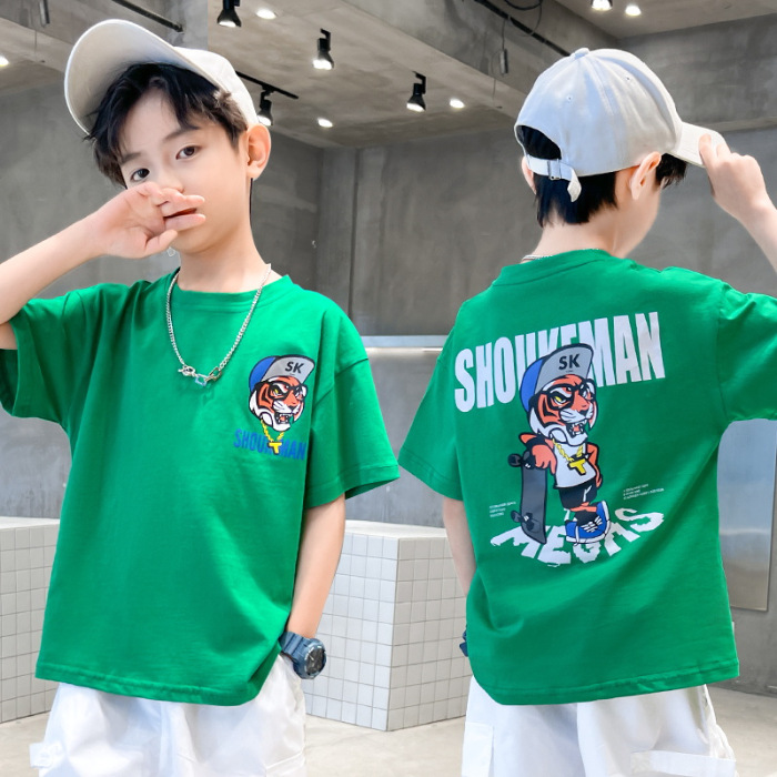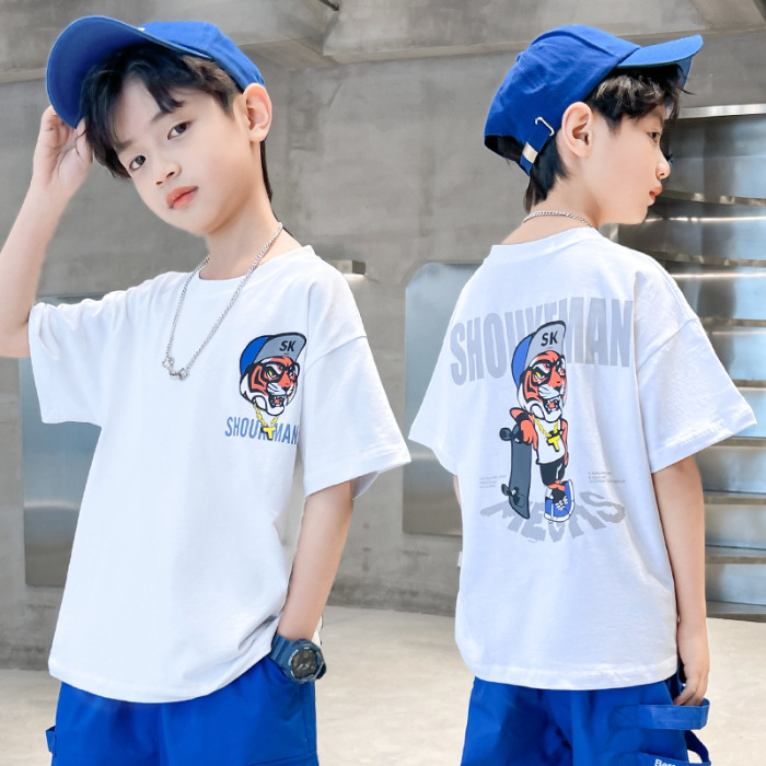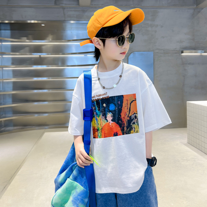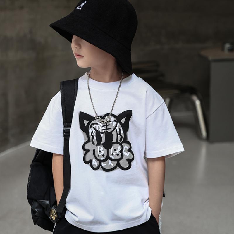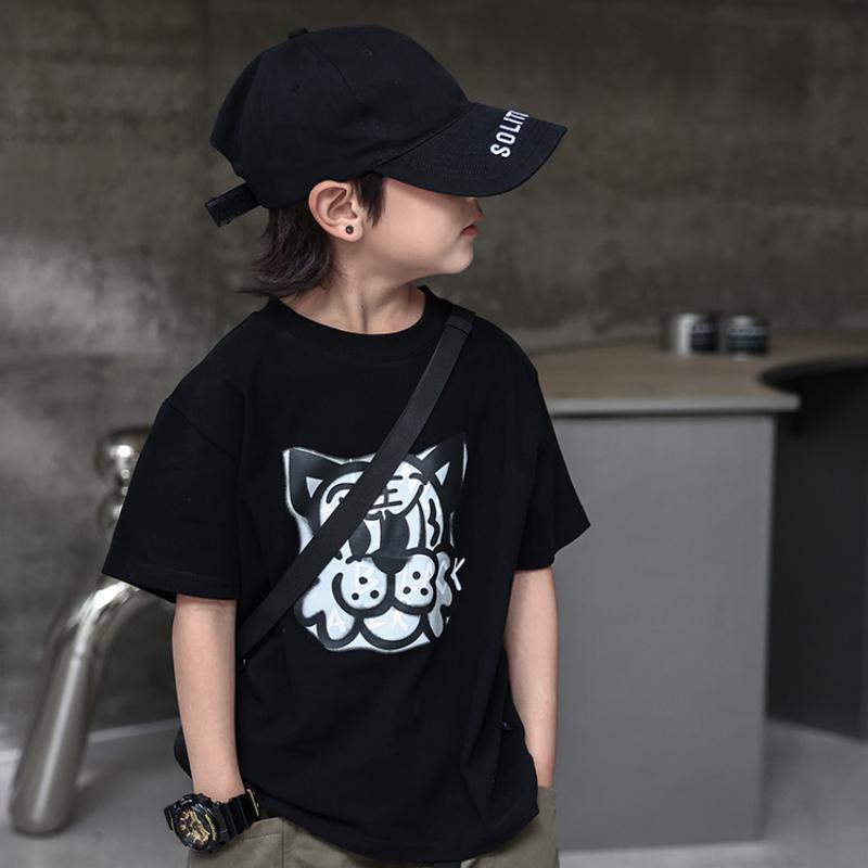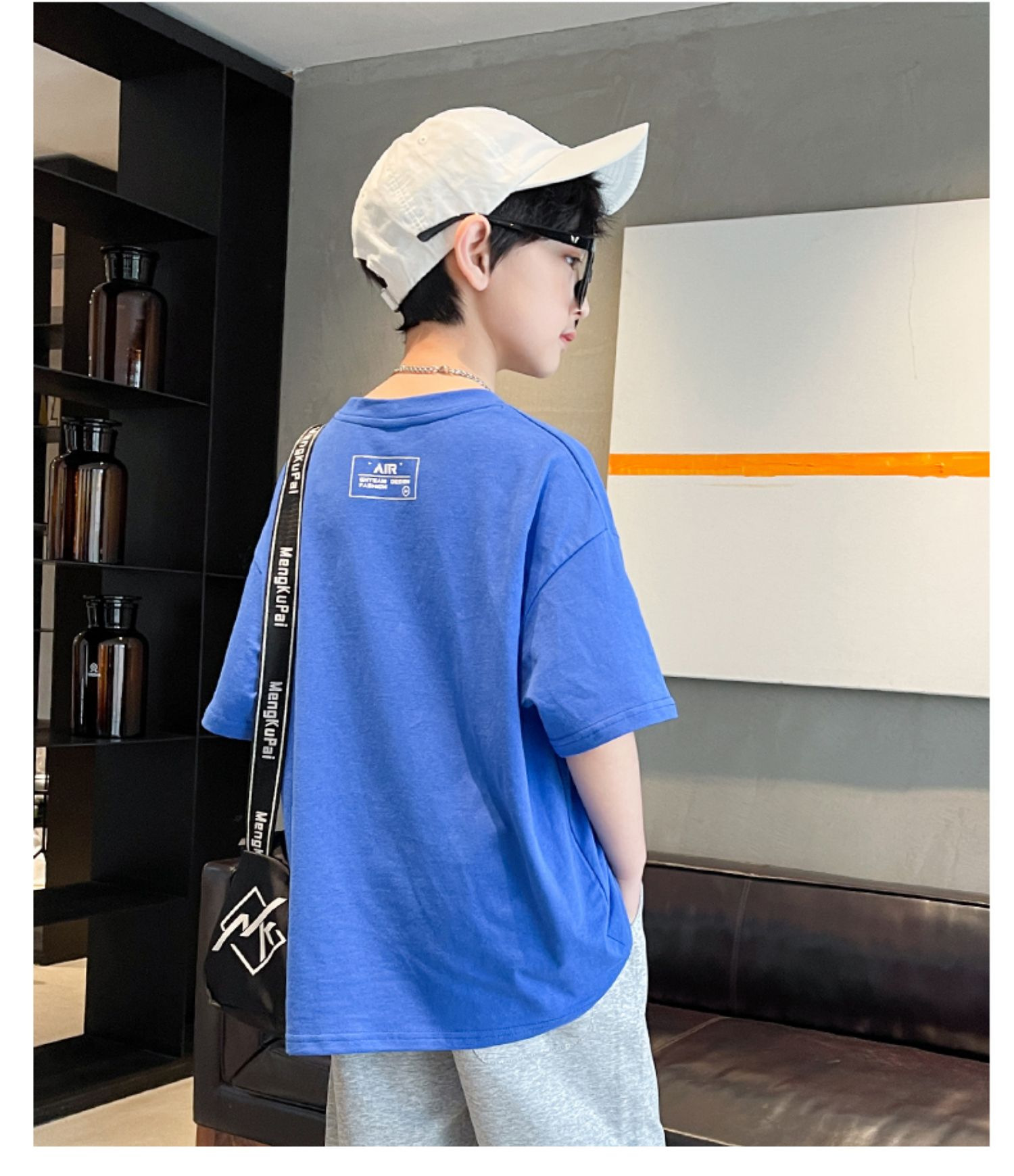 어린이 순면 티셔츠 여름 반팔 라운드 넥 2025 새로운 잘 생긴 중대형 어린이 소년 탑 티셔츠 아동 의류 트렌드스토어 가기